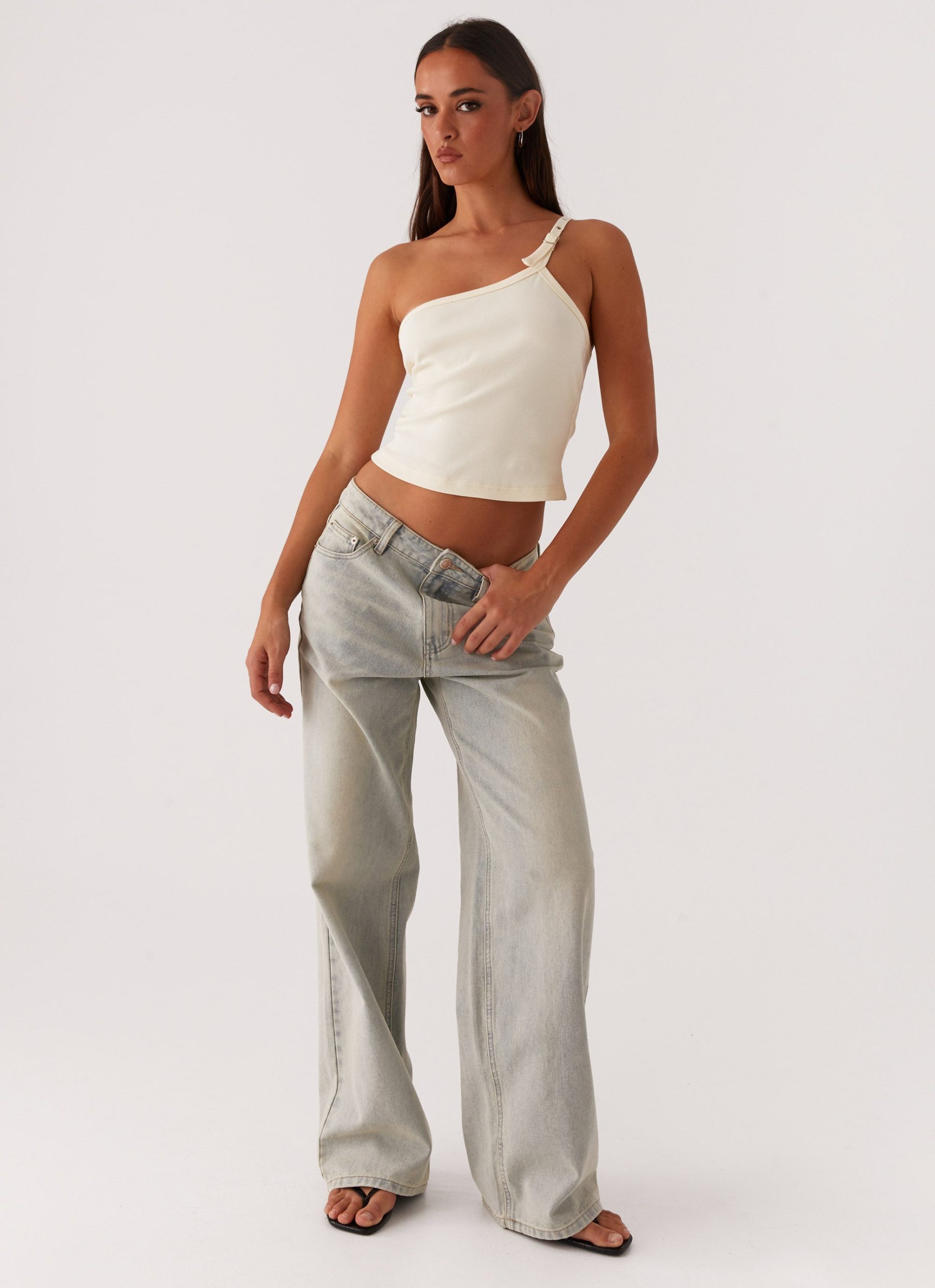 – Front metal button and zipper