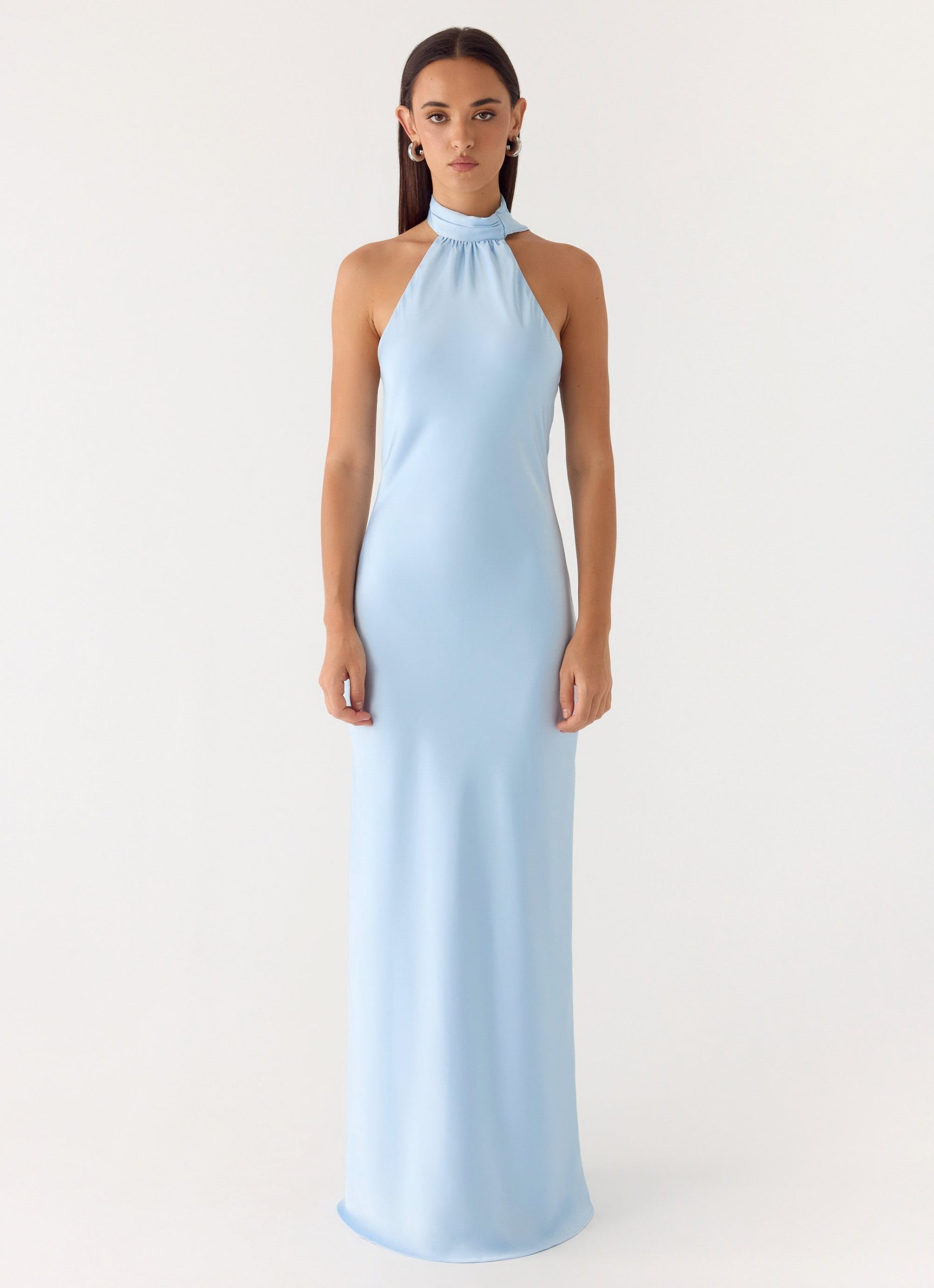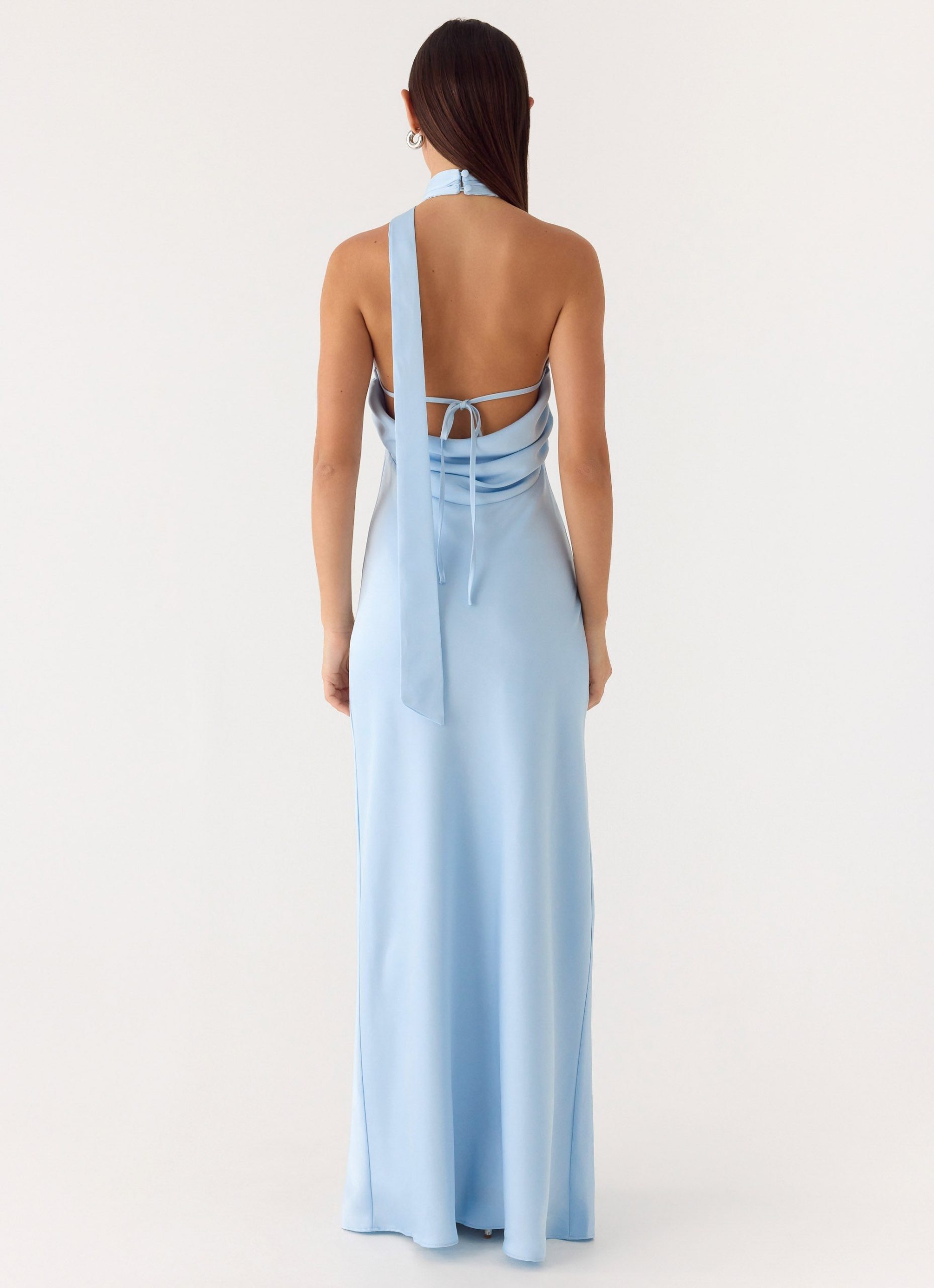 The Keena Scarf Maxi Dress is made for effortless elegance. Featuring a sophisticated halter neckline with long. thin straps and a sultry low cowl back. this bias-cut maxi drapes beautifully into a fluid silhouette. Crafted from a luxurious satin fabric.