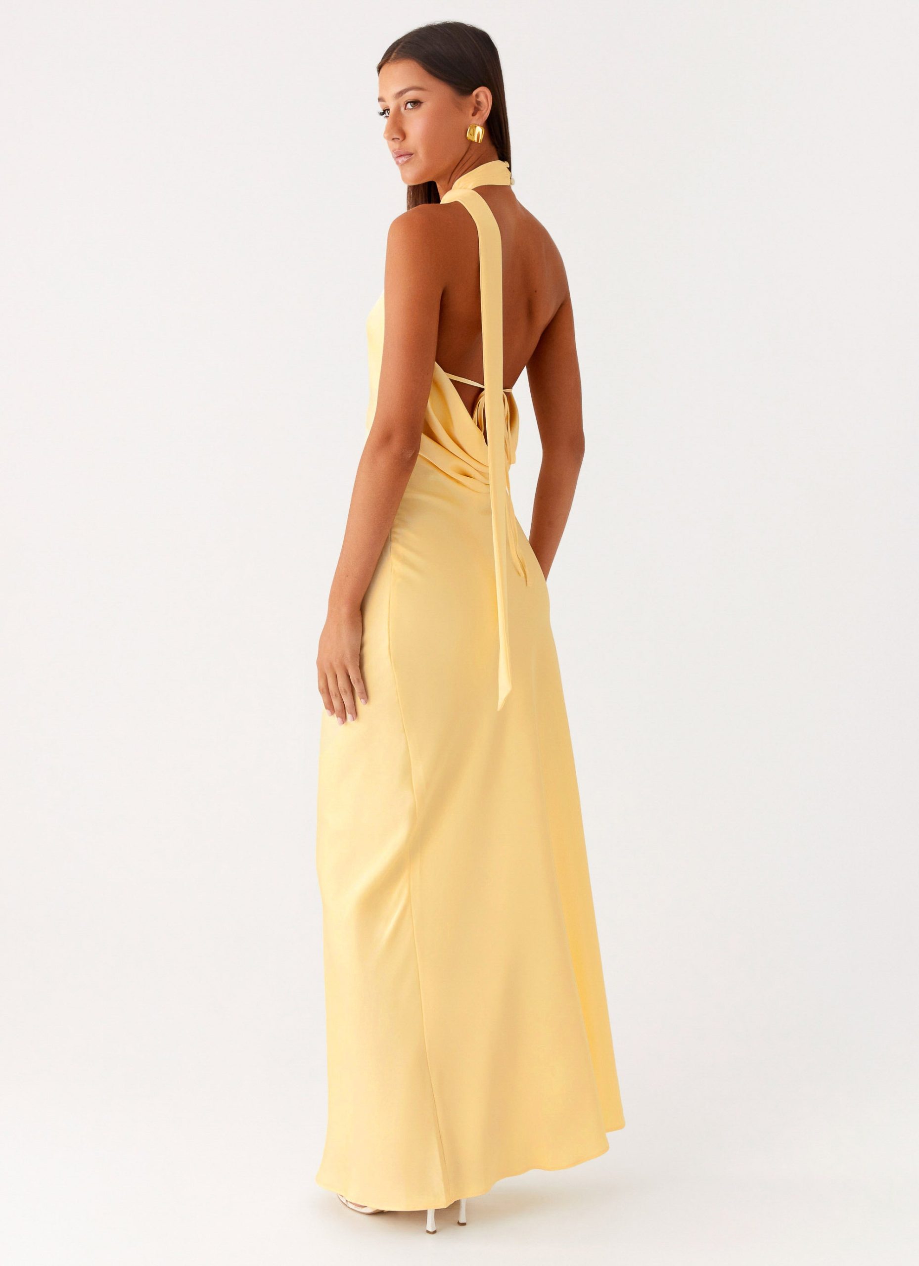 The Keena Scarf Maxi Dress is made for effortless elegance. Featuring a sophisticated halter neckline with long. thin straps and a sultry low cowl back. this bias-cut maxi drapes beautifully into a fluid silhouette. Crafted from a luxurious satin fabric.