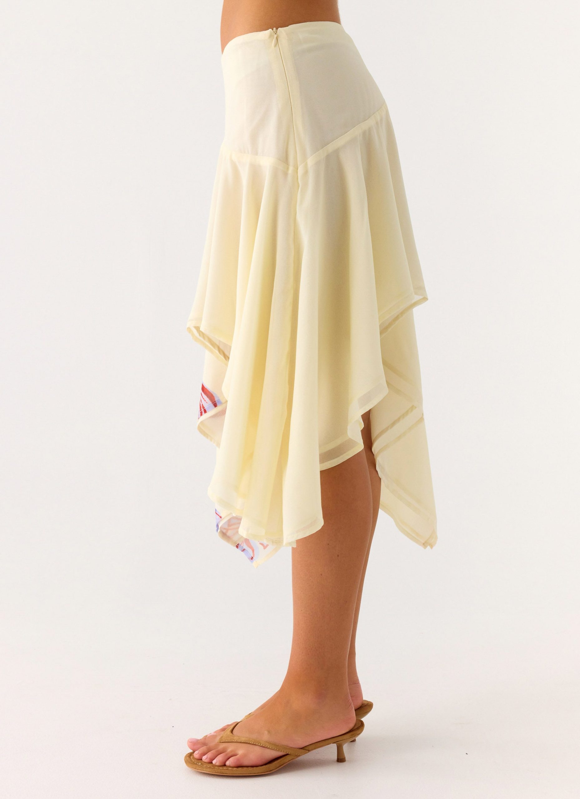 The Kia Low Rise Asymmetrical Midi Skirt is made for golden hour silhouettes and bold moves. Crafted from airy chiffon in an exclusive Peppermayo print. it features a modern low-rise fit and a dramatic asymmetrical hemline that dances with every step. Fully lined for comfort and finished with a sleek side zipper. this midi is a standout choice for sunset-to-after-dark styling.