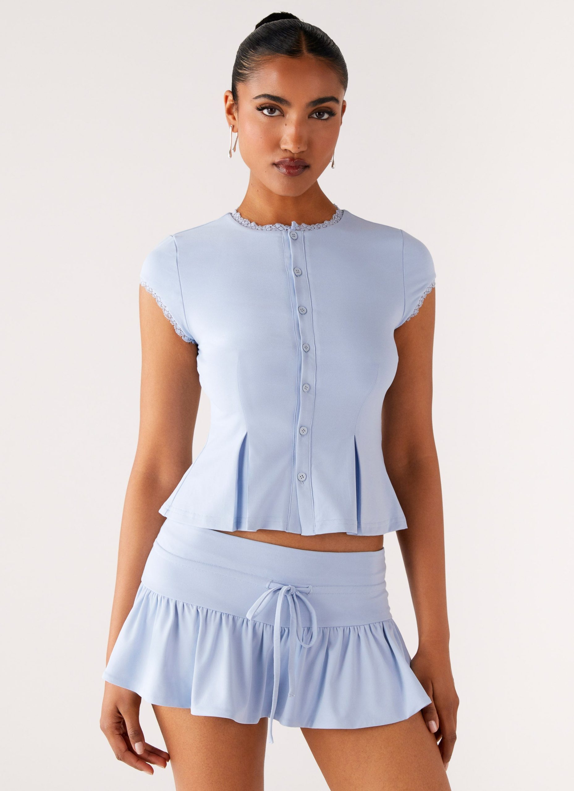 Elevate your evening with the Landon Button Up Top – fully lined with a peplum fit. high neck. and cap sleeves. Stretch lace trim and jersey fabric add a soft touch to this button-up. perfect for nights that shimmer from sunset to sundown.