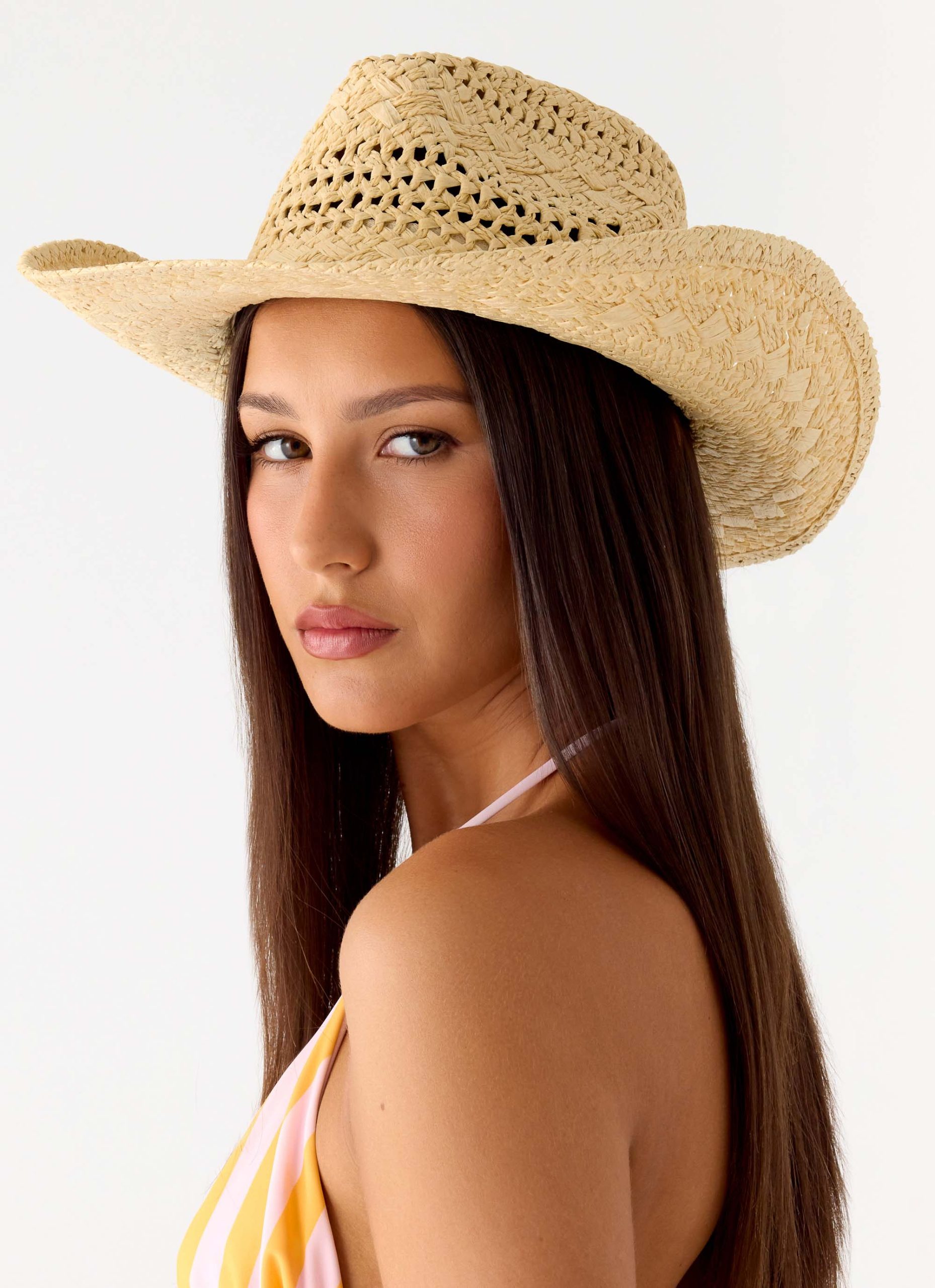 The Late Checkout Cowboy Hat is made for effortless. sun-soaked styling with a playful. western-inspired silhouette. Perfect for pairing with casual outfits or festival-ready looks. this hat adds a statement finishing touch to any summer ensemble.
