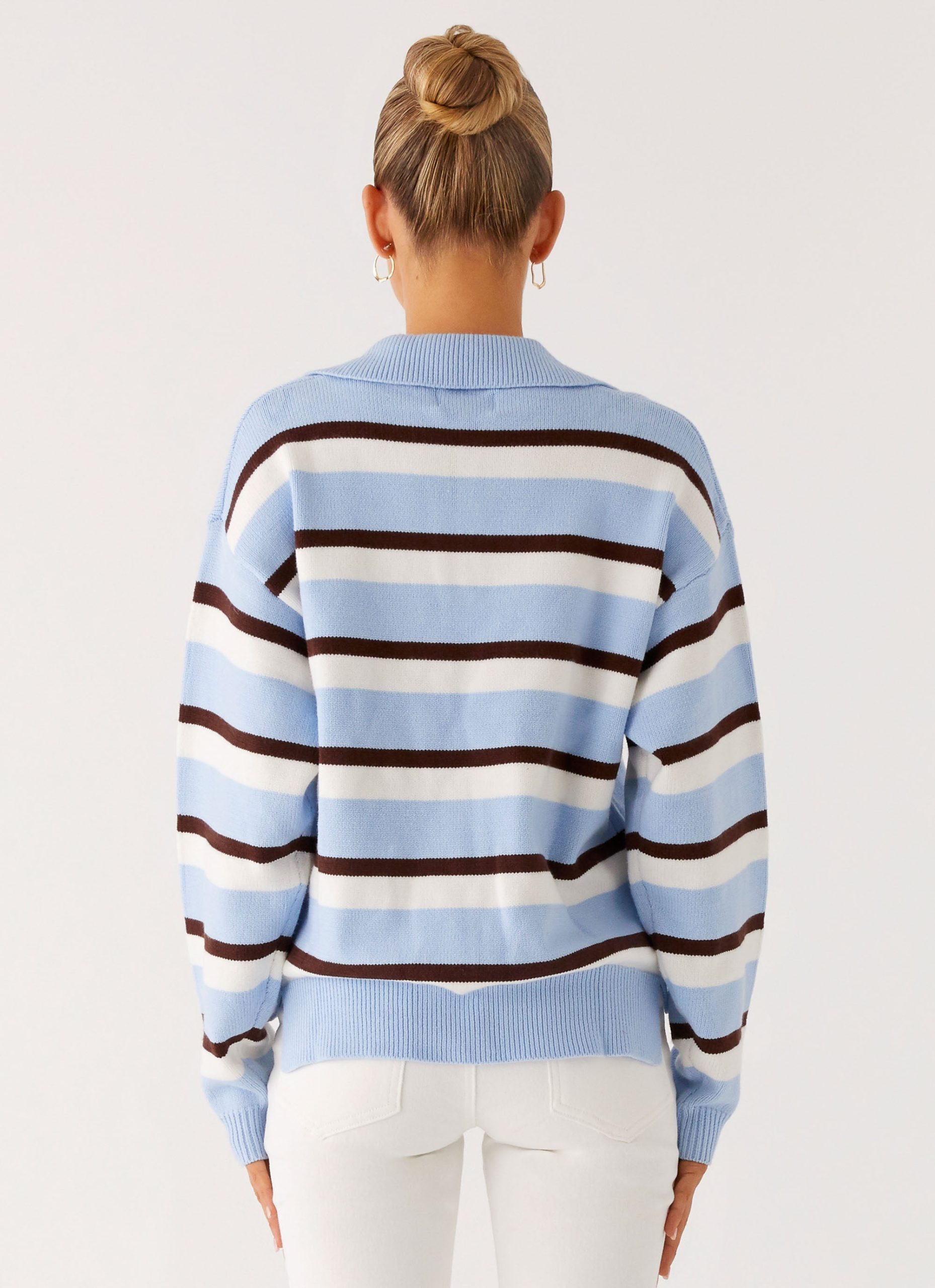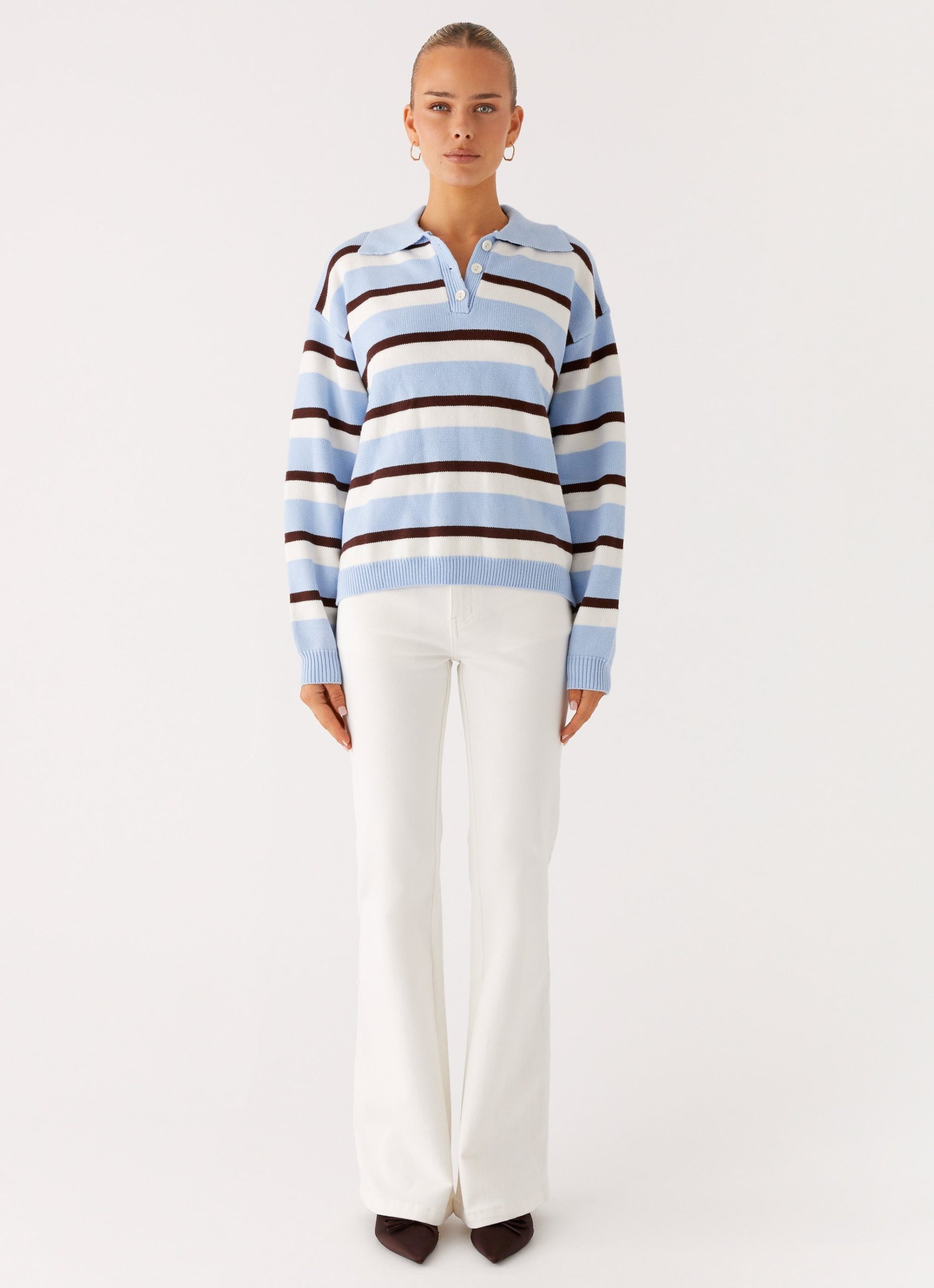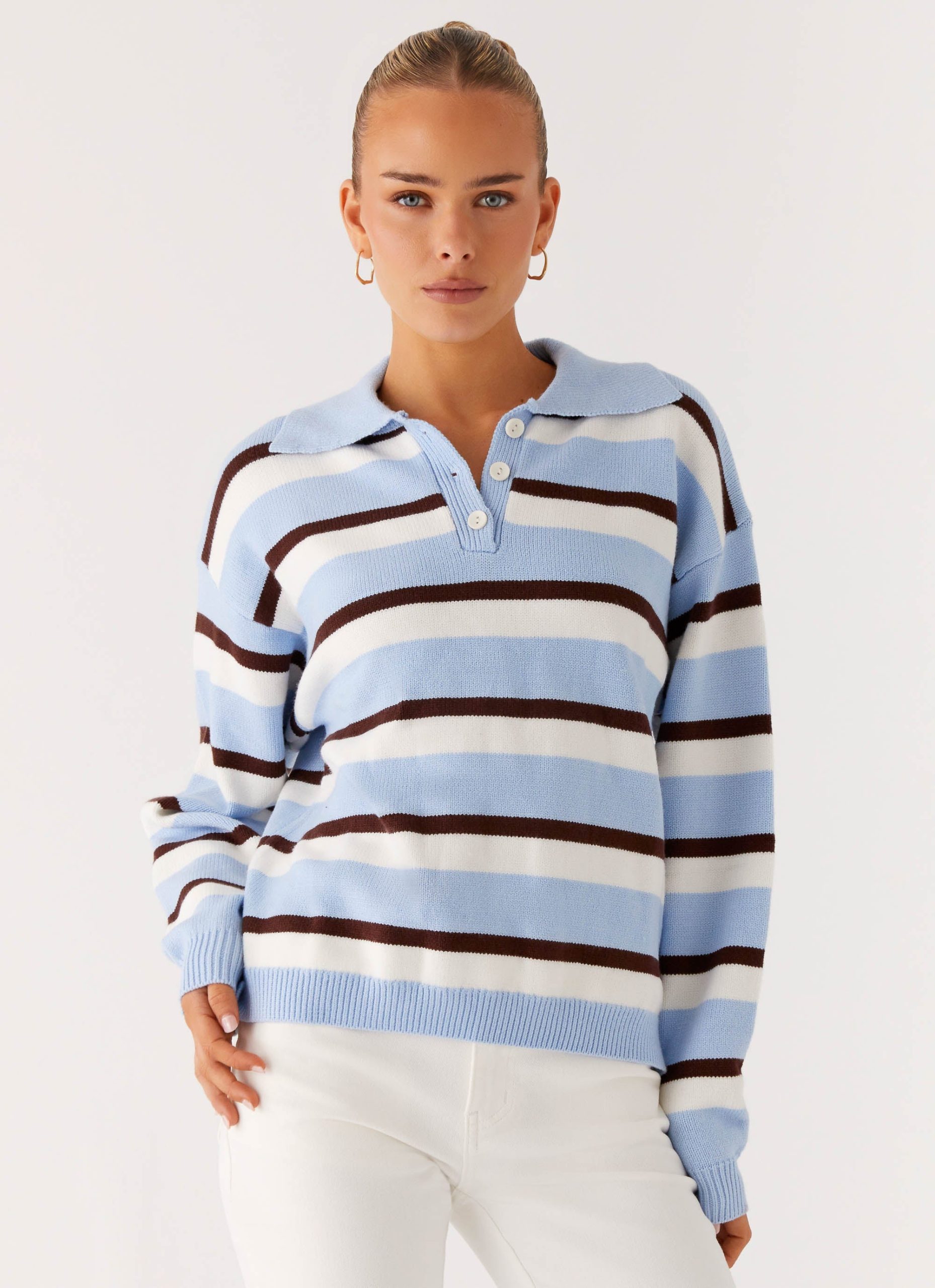 The Liana Striped Polo is perfect for nights that call for effortless cool. Featuring a scoop neckline with collar and button details. this oversized fit piece is finished with dropped shoulder seams and full-length sleeves for relaxed. all-night style.