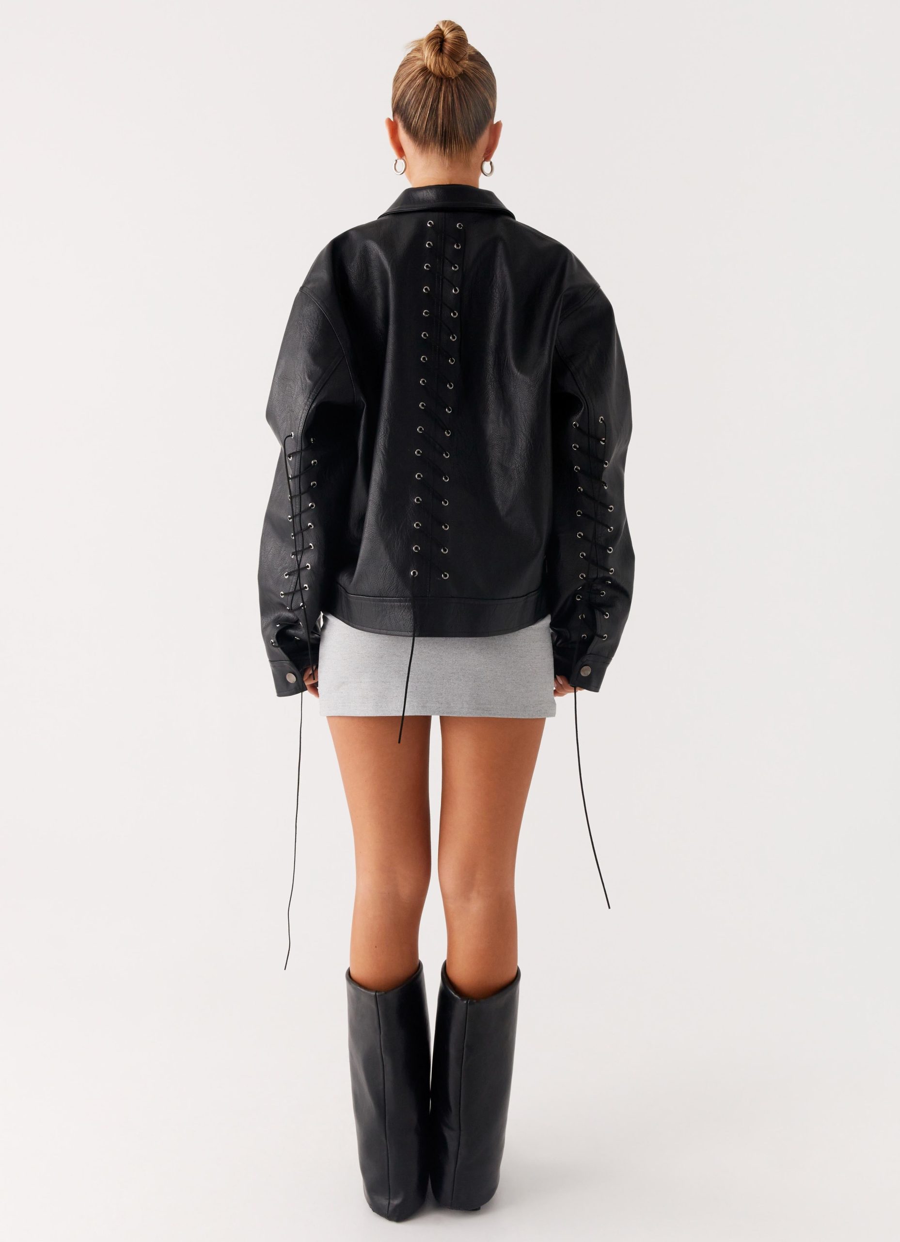The Lula Tassle Faux Leather Bomber Jacket brings attitude to any after-dark look. Featuring a single collared neckline and boxy silhouette. it’s finished with bold corset-style tie detailing along the back and sleeves. Throw it on—this jacket does all the talking.