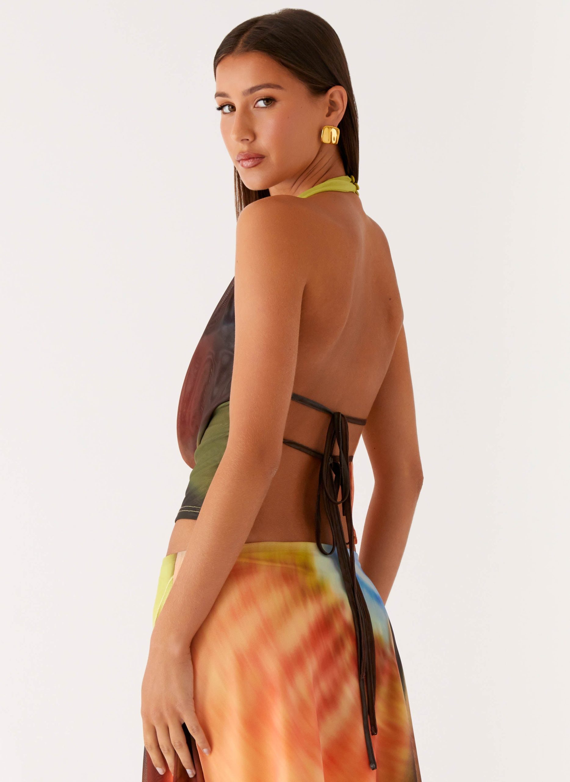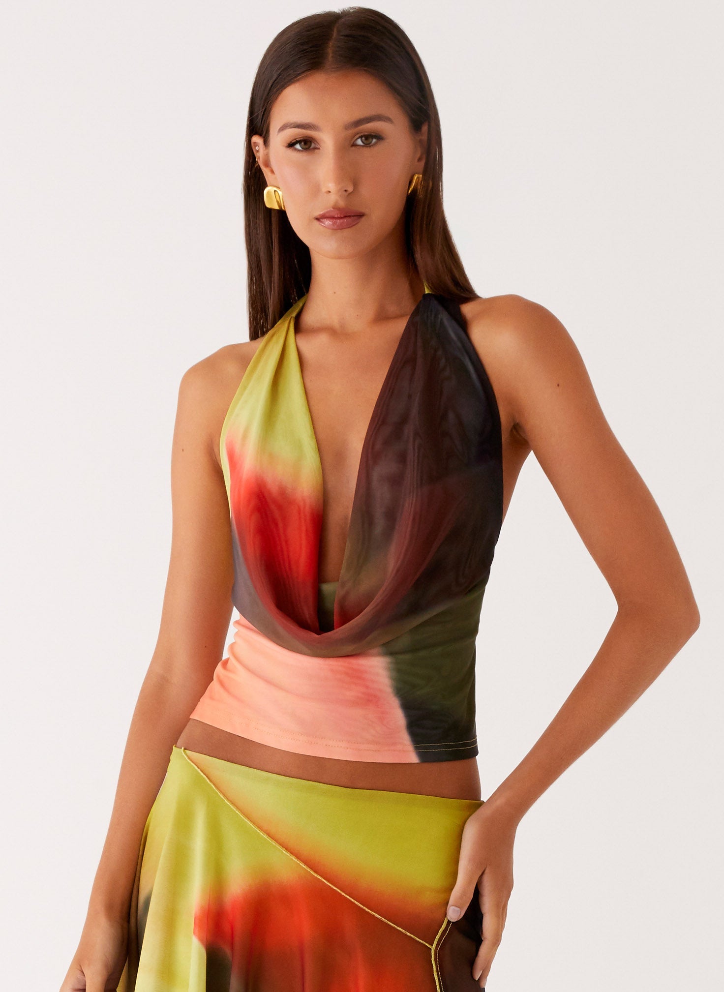 The Lustra Cowl Top shines with a low cowl halter neckline and long thin straps that tie at the back. revealing an open-back silhouette made for warm nights and city lights. Crafted from stretch mesh with an exclusive print. it features adjustable straps and a button closure for a perfect fit.