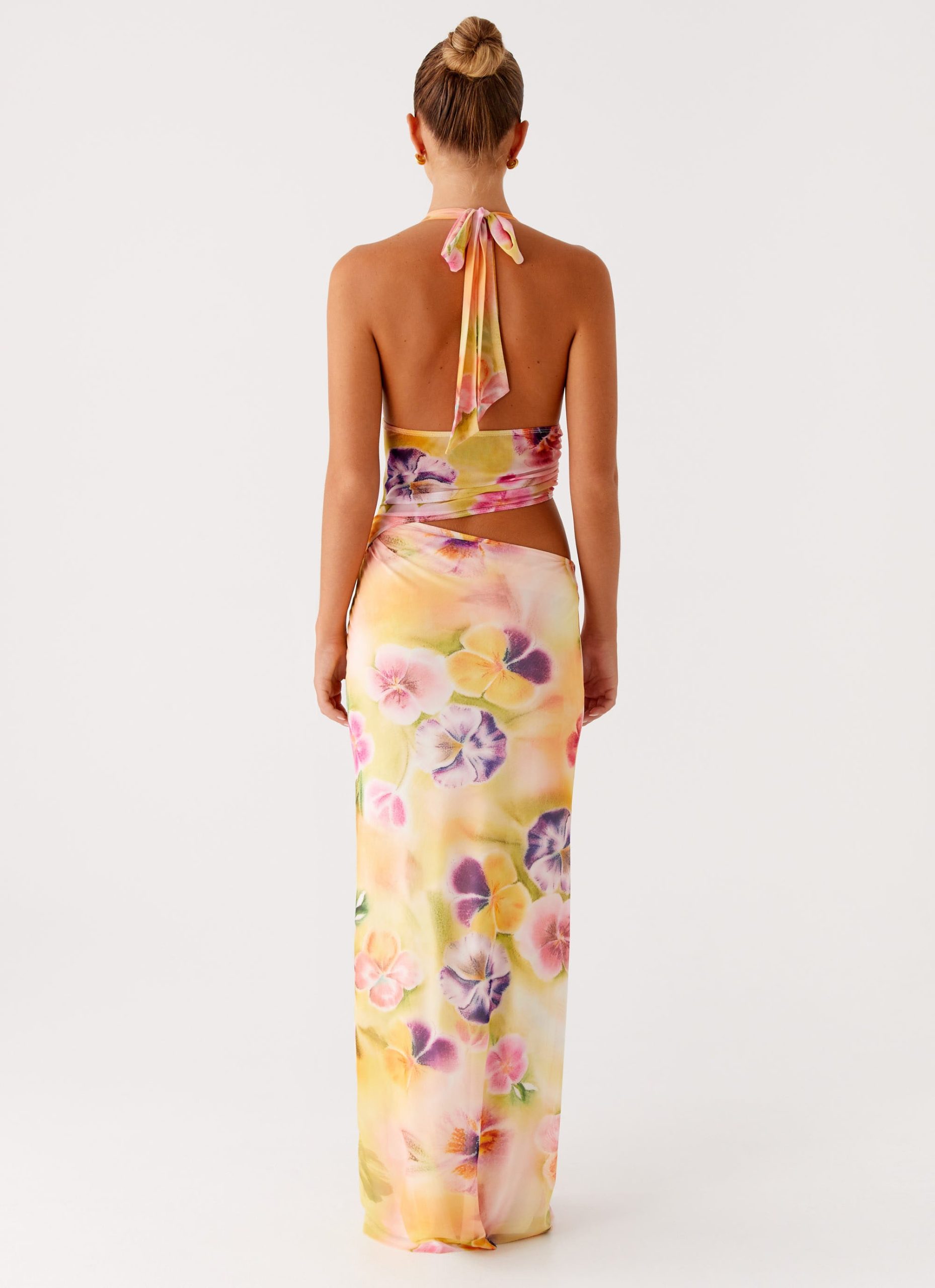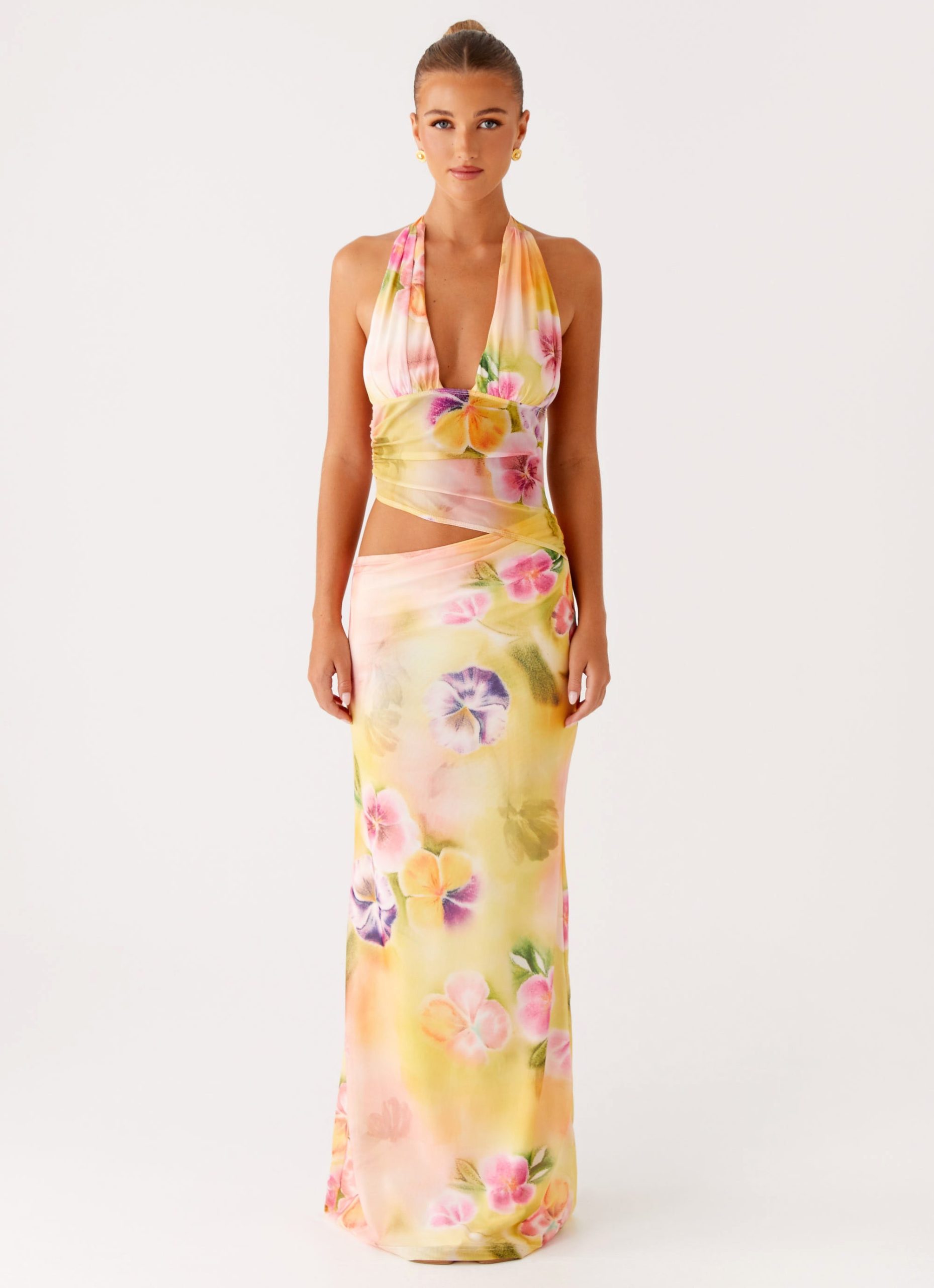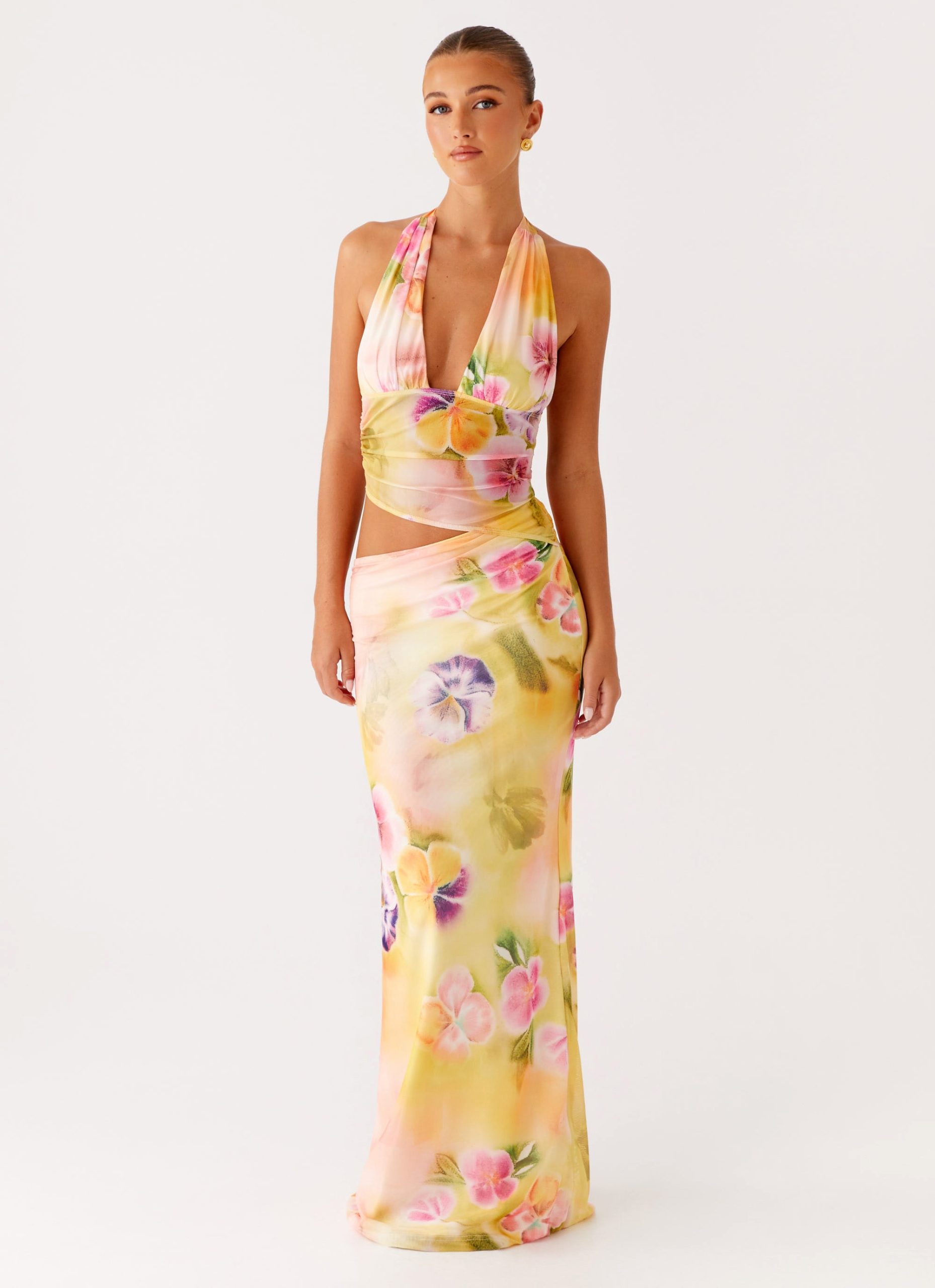 The Main Act Halter Maxi Dress is made to steal the spotlight. With a bold mesh bodice that adds a touch of edgy allure. this dress fits like a glove. accentuating your shape in all the right ways.