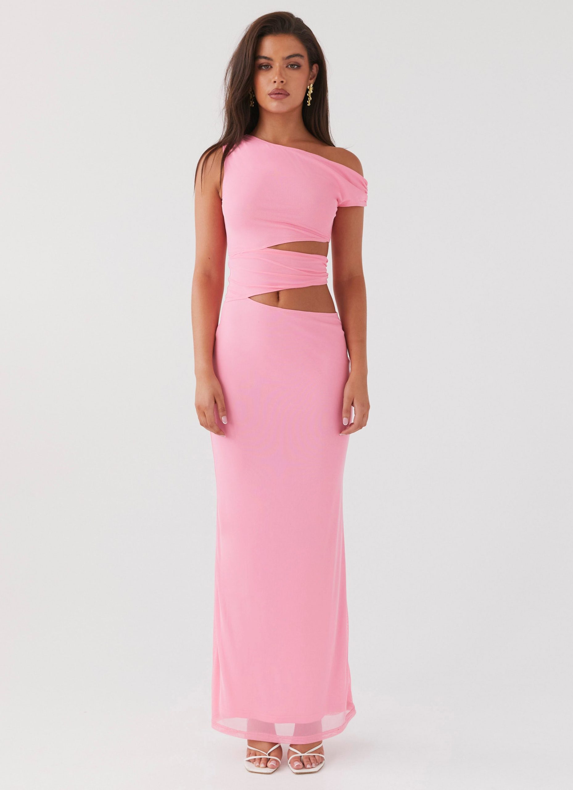 Step into the spotlight with our Margot One Shoulder Maxi Dress. Crafted in a mesh fabric. this captivating dress features a chic one-shoulder design and cut-out detail. perfect for embracing balmy nights and nightclub silhouettes. It’s the epitome of evening elegance.