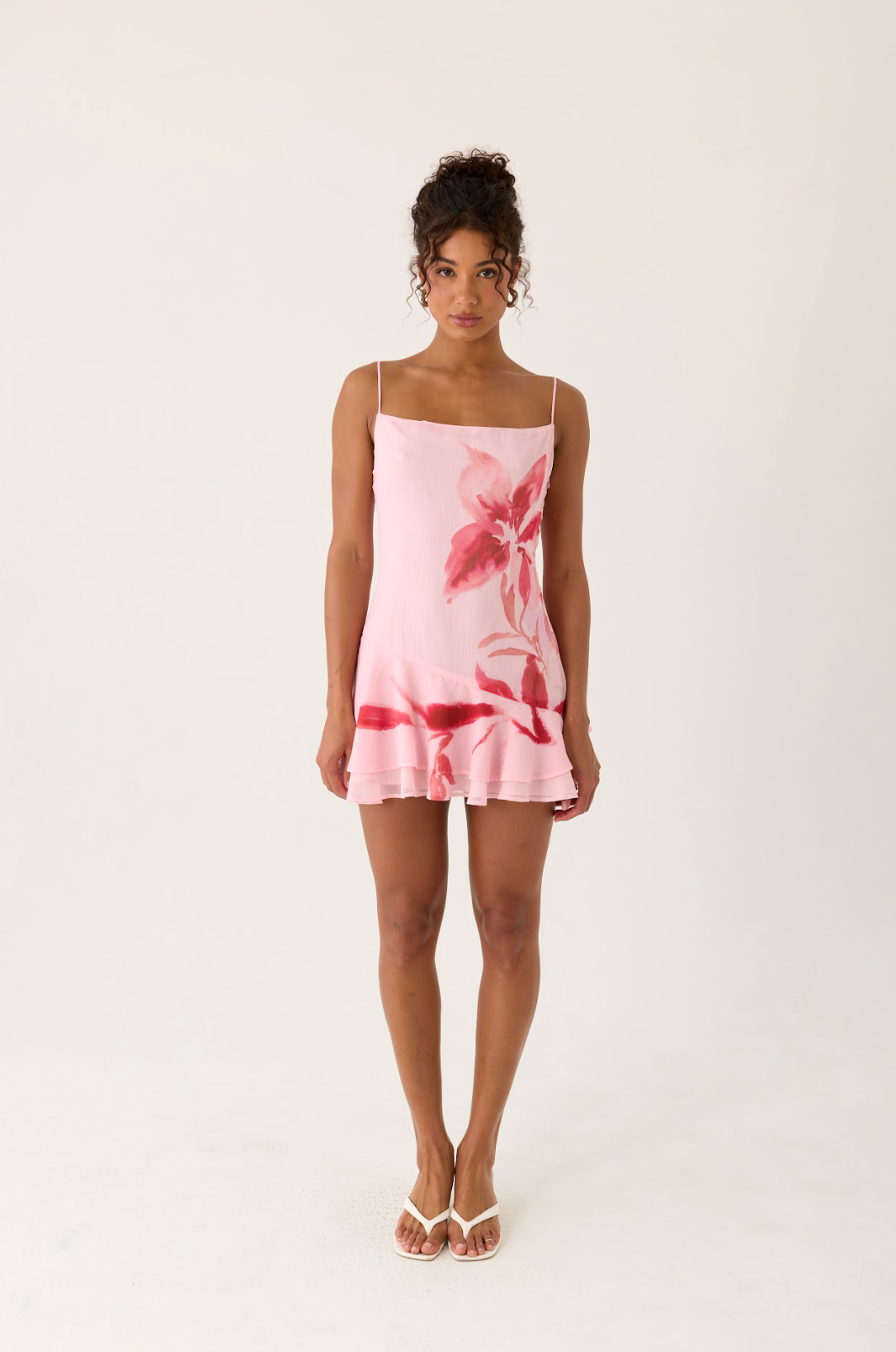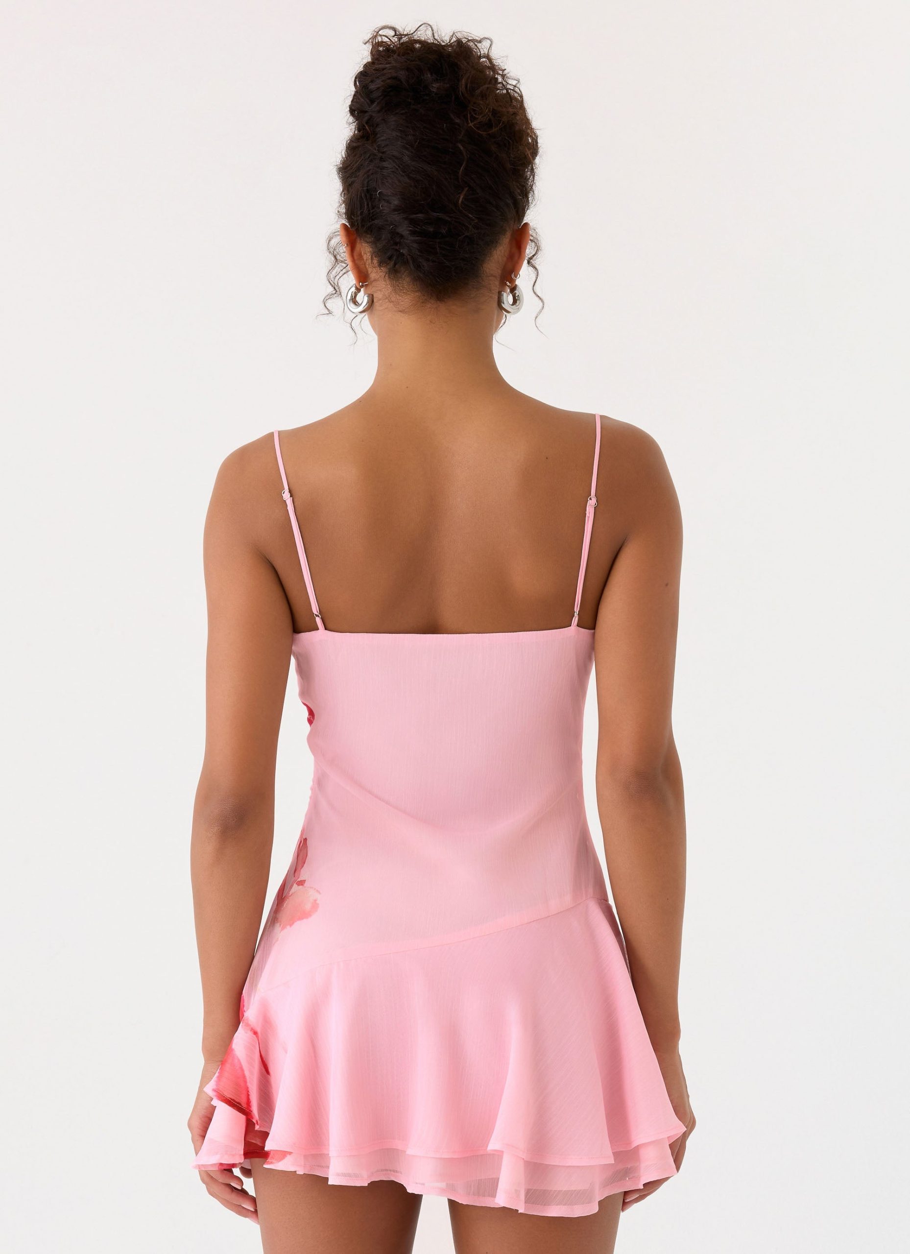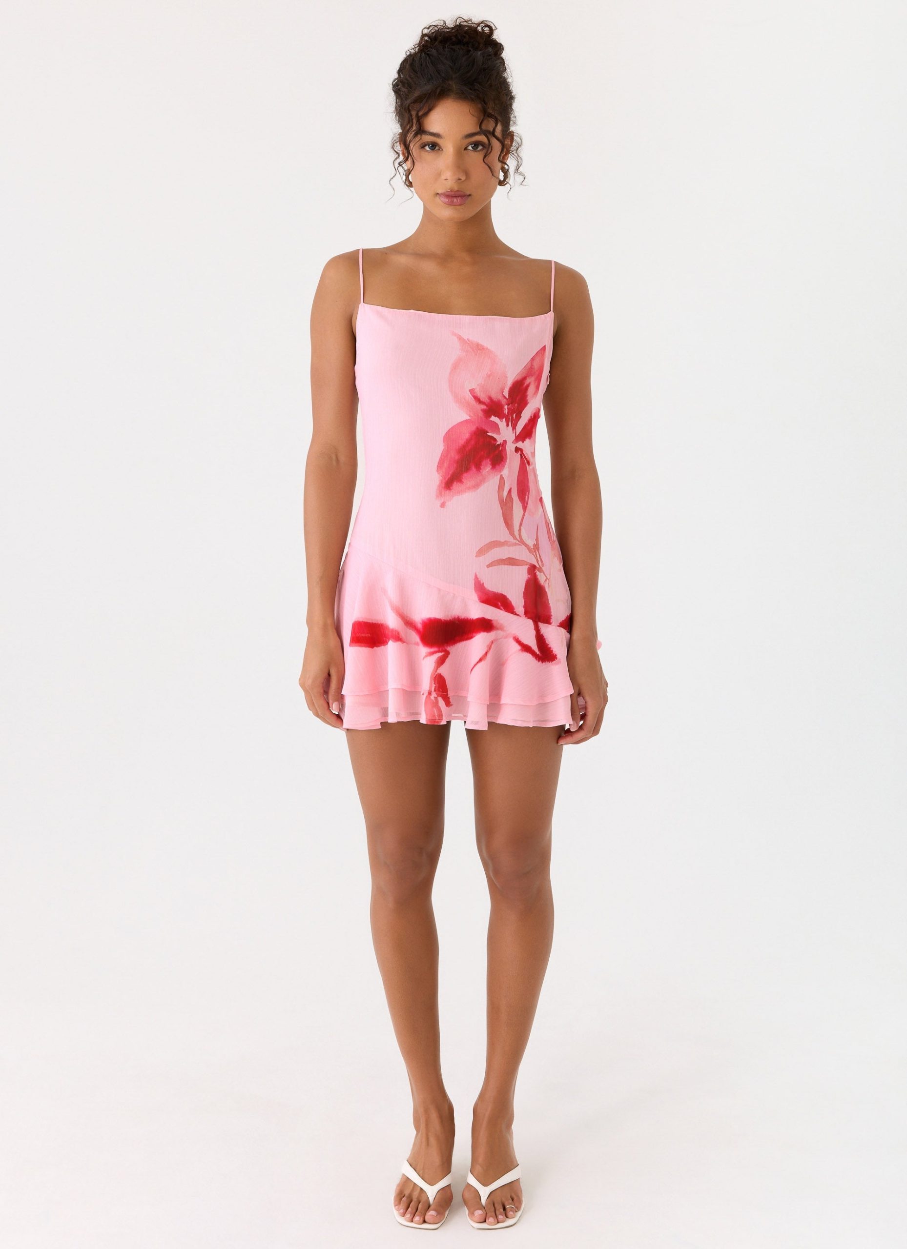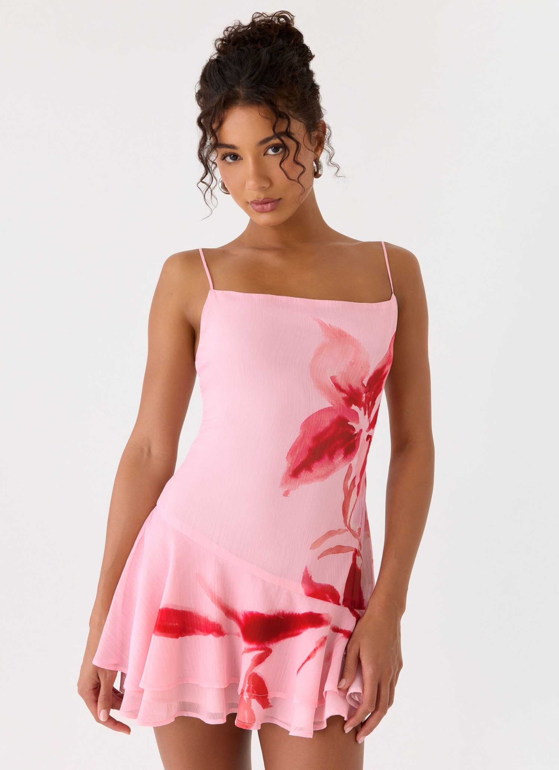 The Marisolana Mini Dress is cut in a mini length with adjustable shoulder straps. it features an asymmetrical panel and frill hemline that create a playful. flirty silhouette. Fully lined and crafted in lightweight chiffon with an exclusive print. each piece is unique with print placement that may differ.