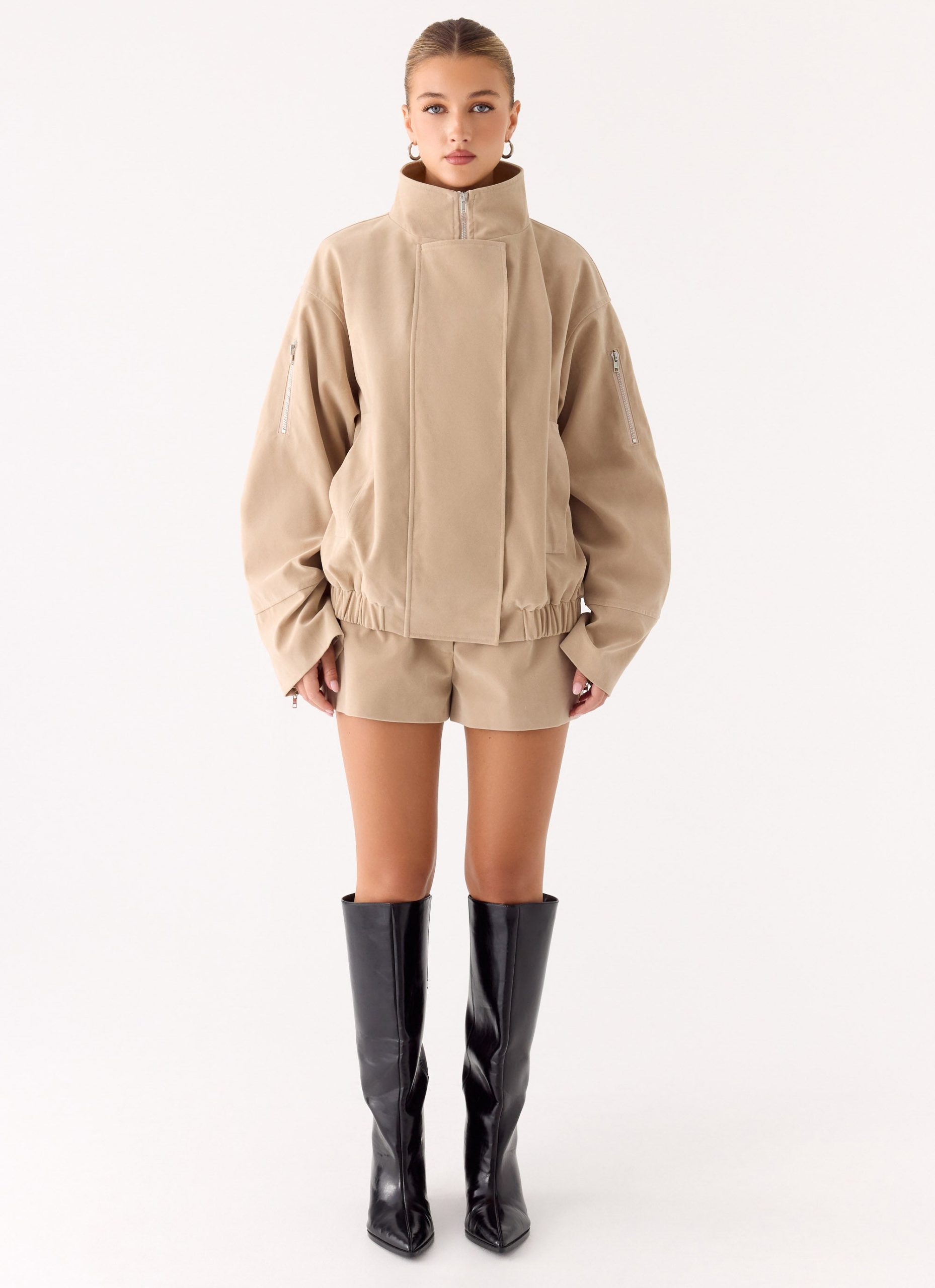 The Marlow Faux Suede Jacket is made for bold. statement layering. Featuring a high funnel neck and oversized silhouette. this fully lined jacket is crafted in soft faux suede for both style and comfort. With functional details like a hidden front zipper under a snap placket. side welt pockets. and sleeve zippers. it’s perfect for elevating casual and evening outfits alike.