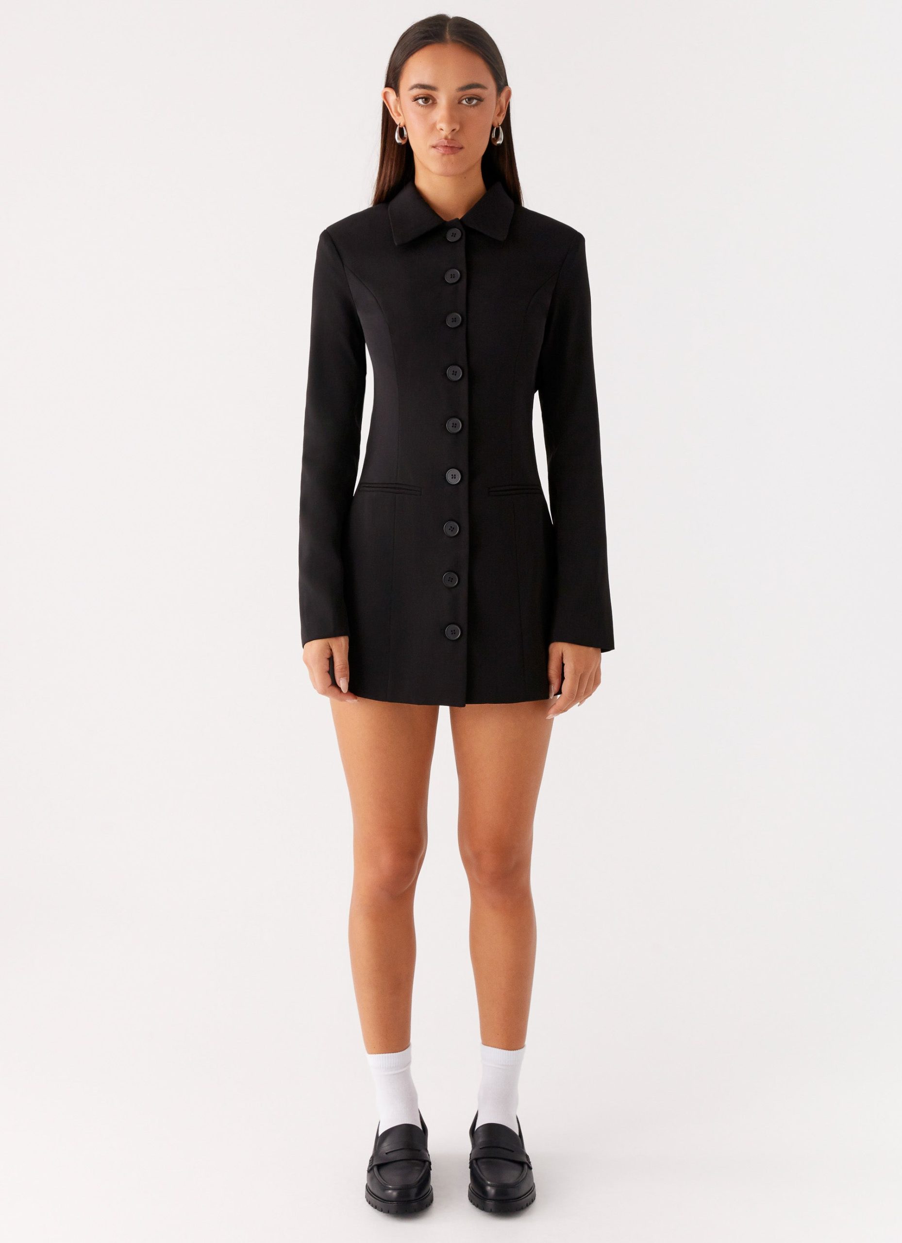 The Memphis Blazer Mini Dress brings tailored edge to your after-dark wardrobe. Featuring a high collared neckline. front button opening. and loose fitted long sleeves. this fully lined piece is finished with front pockets and a bold open back for a modern twist on classic tailoring.