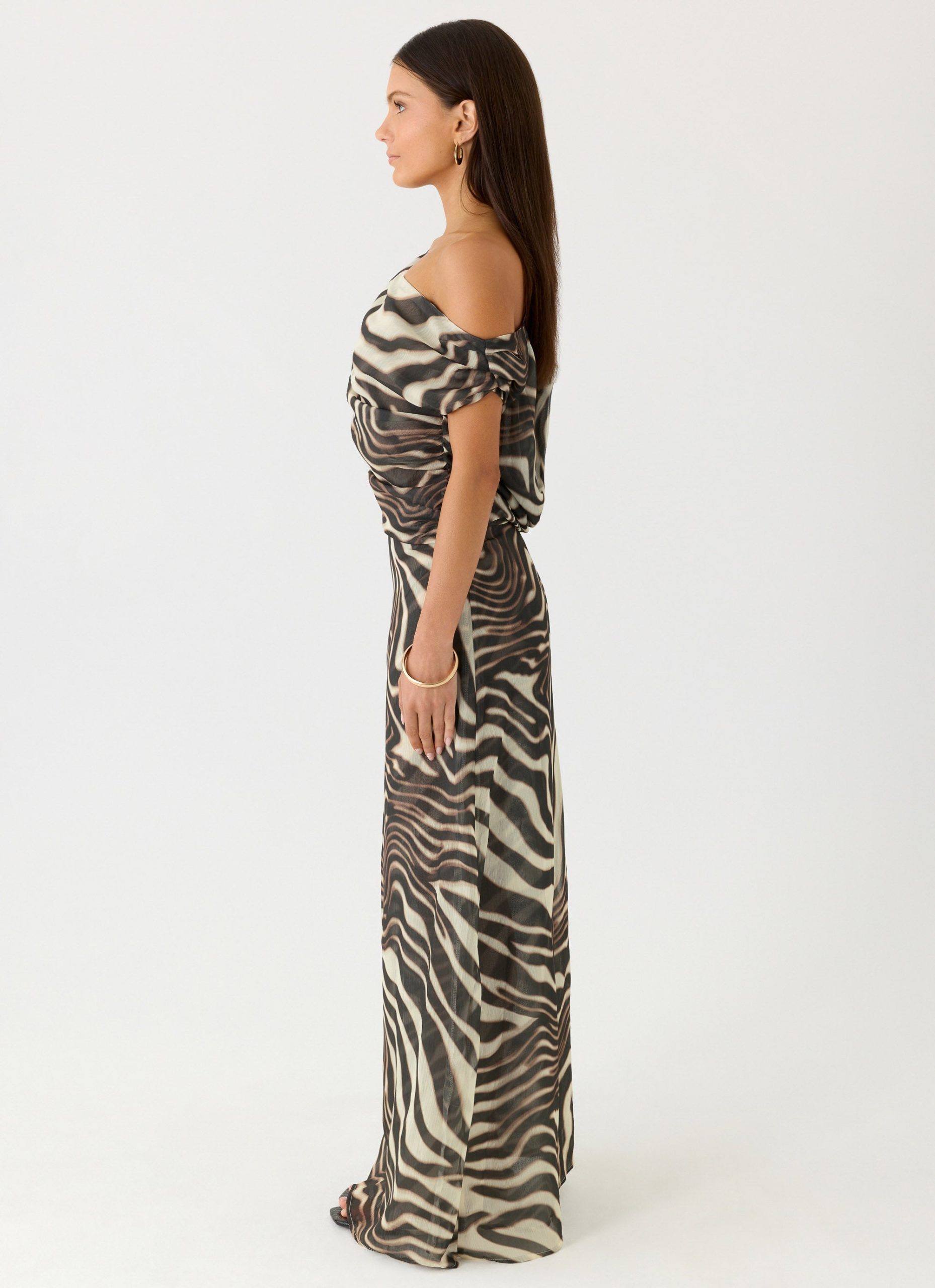 The Mernas Maxi Dress is made for nights that glow long after the sun dips. Featuring an off-shoulder neckline and softly gathered detailing through the waist. this flowing silhouette is designed to flatter and move with ease. Finished with a draped cowl back and adjustable tie. it’s an elevated statement for balmy evenings and after-dark moments.