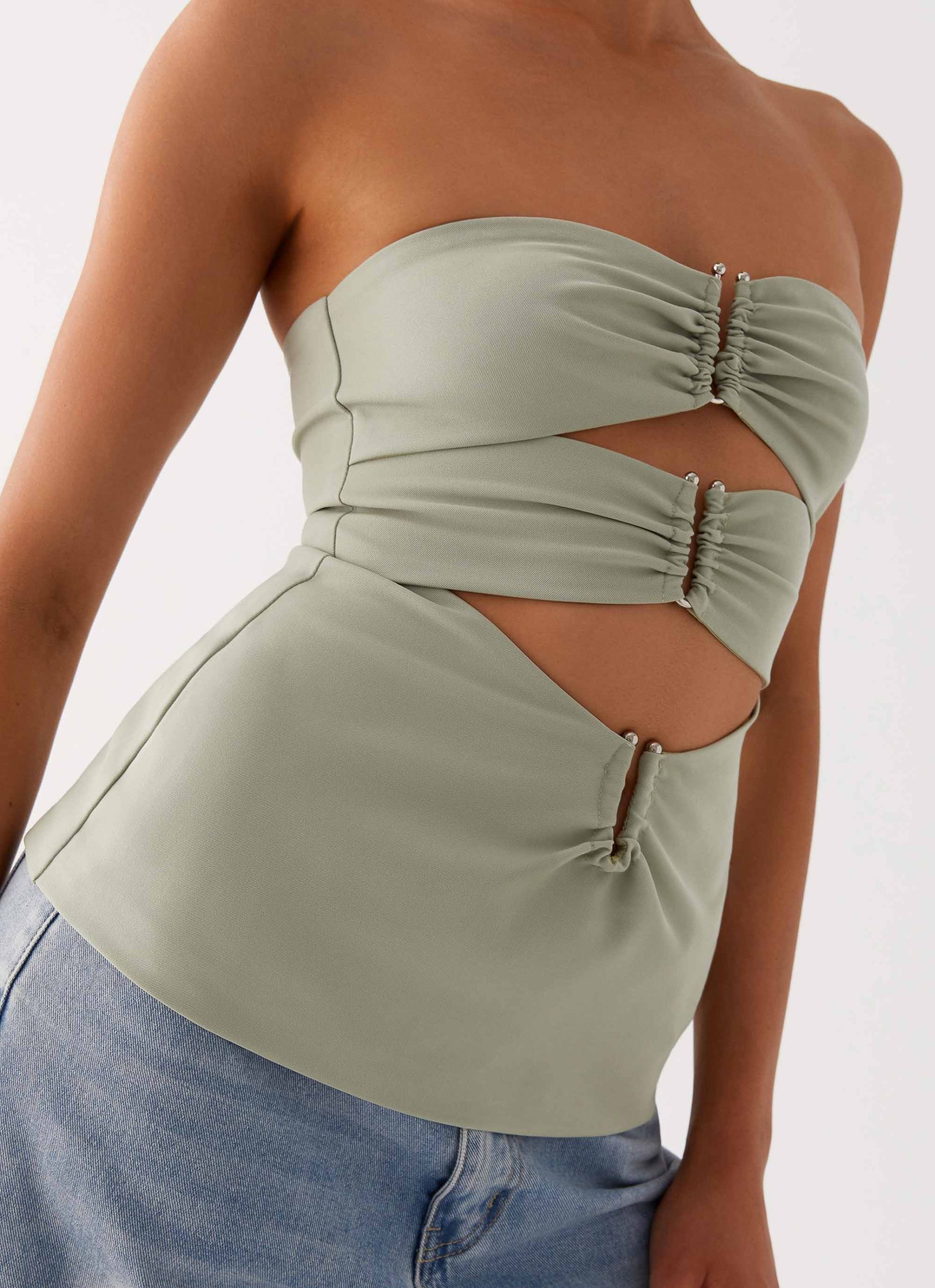 Elevate your evening look with the Micha Strapless Top. This bold piece features a strapless neckline and a striking midi length. With underbust and waist cutouts. it offers a daring. contemporary edge that’s perfect for a night out.