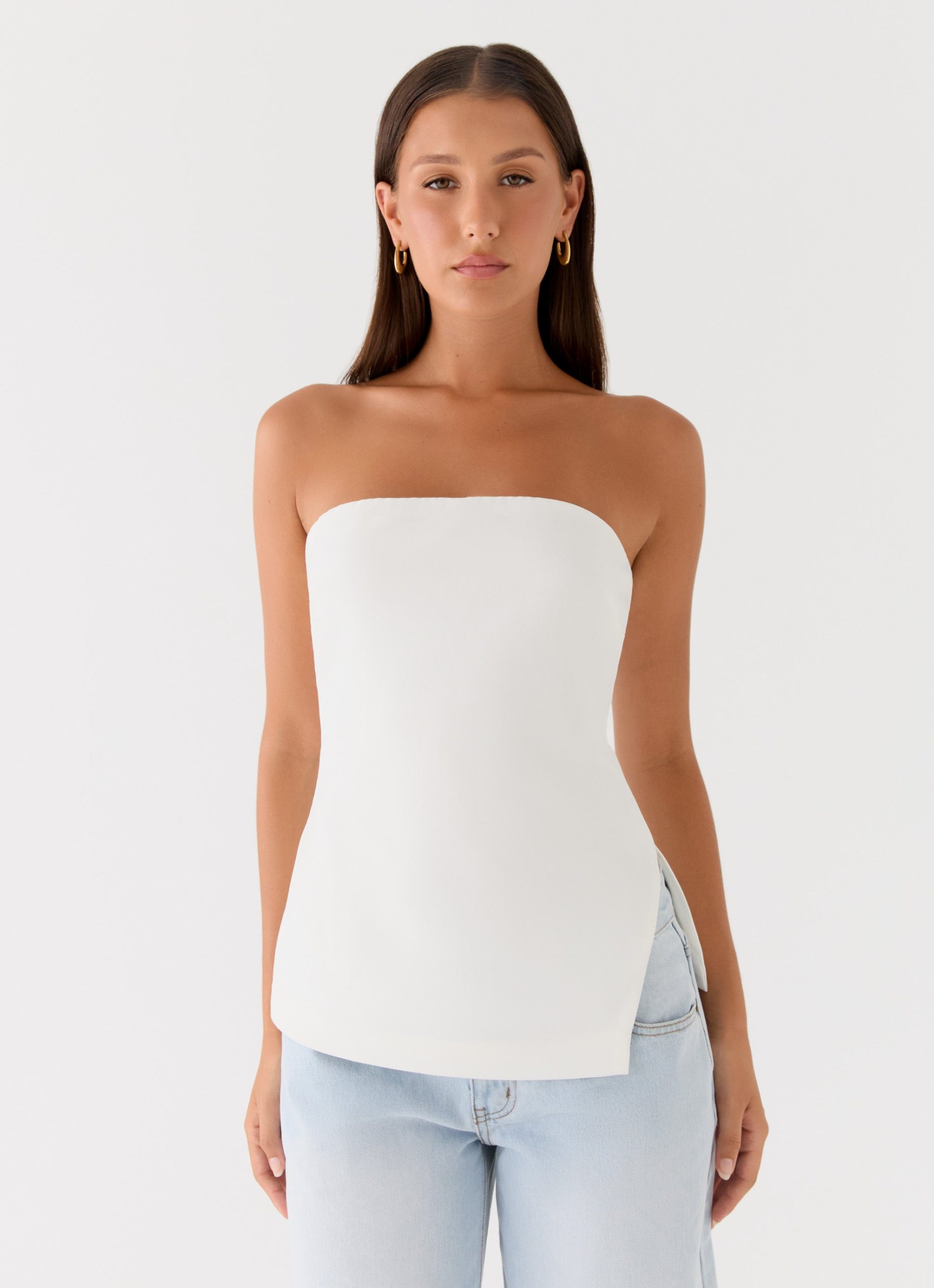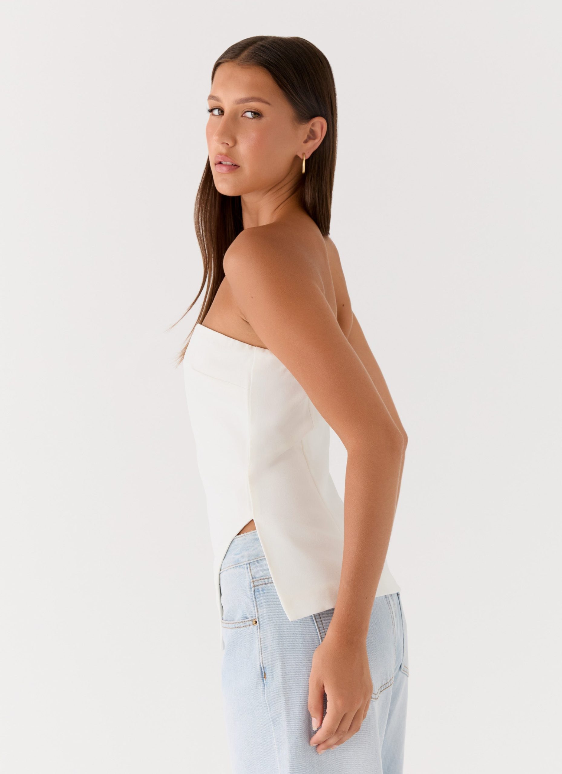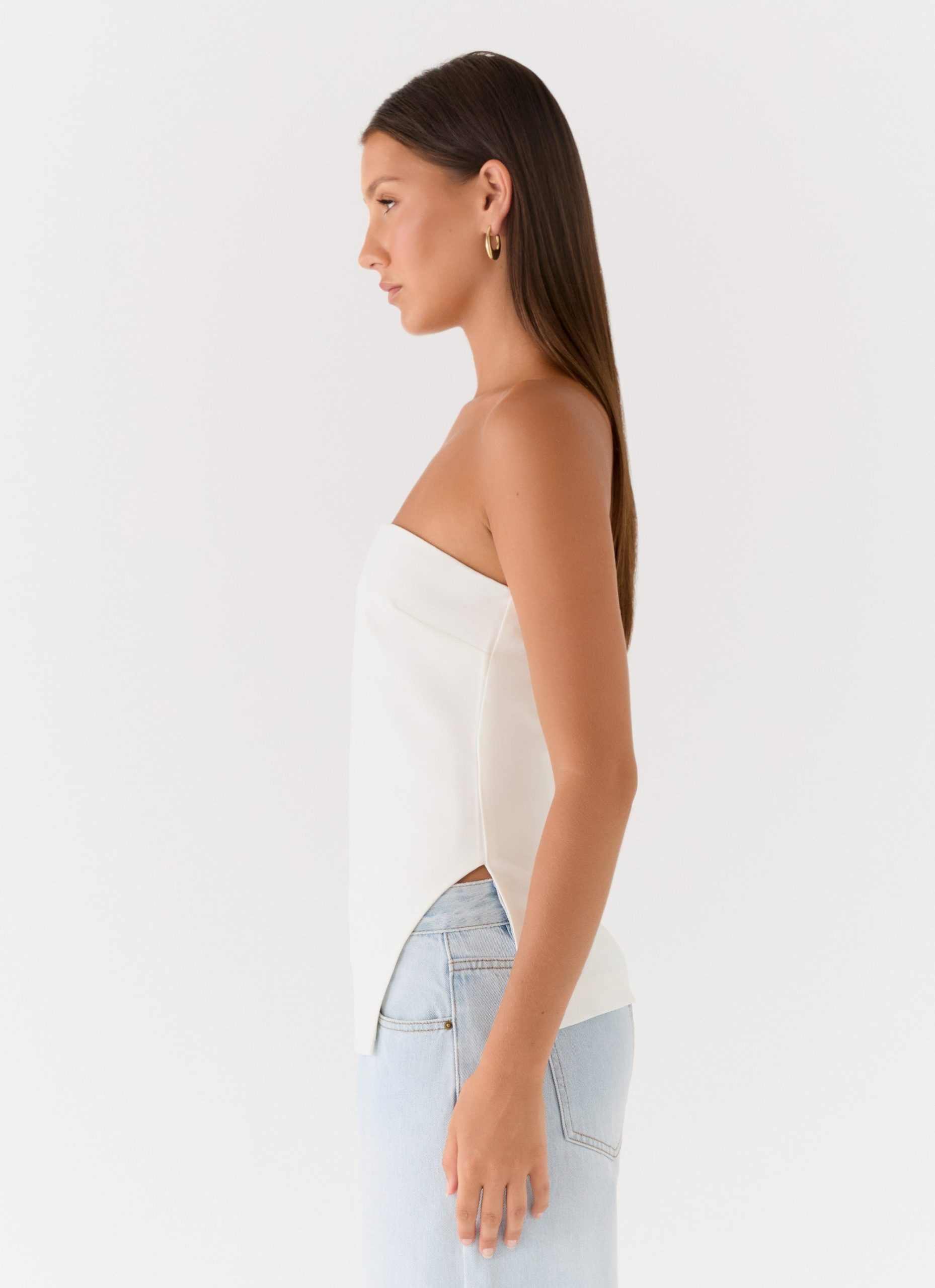 The Midnight Glance Top is made for nights that linger long after sunset. Featuring a sleek strapless neckline and a statement asymmetrical cut-out hemline. this silhouette is bold yet refined. Fully lined for a smooth. sculpted fit. it captures that effortless after-dark confidence.
