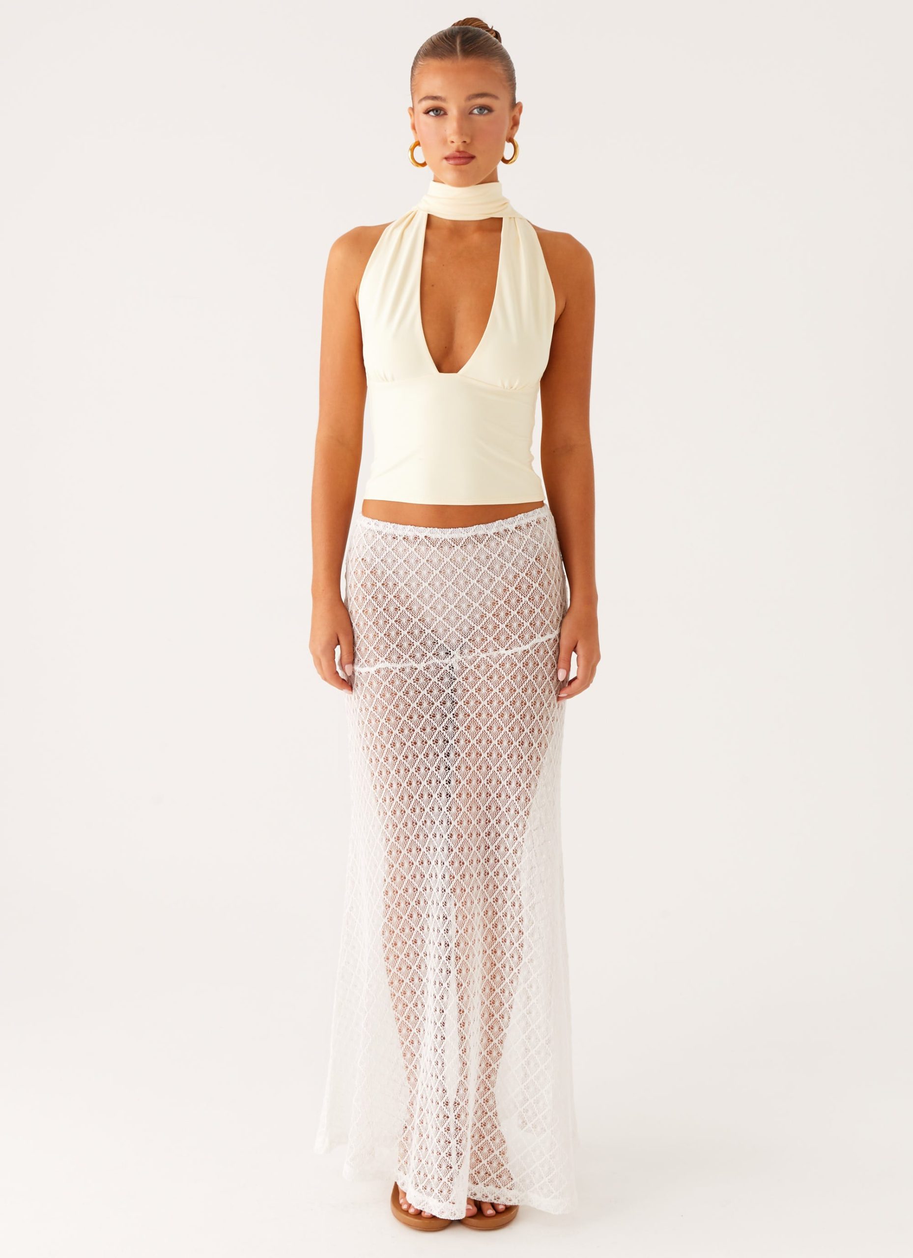 Designed with a halter wrap neckline and fitted silhouette. the Milos Top features an open low back for added allure. Perfect for sunset drinks or festival layering.