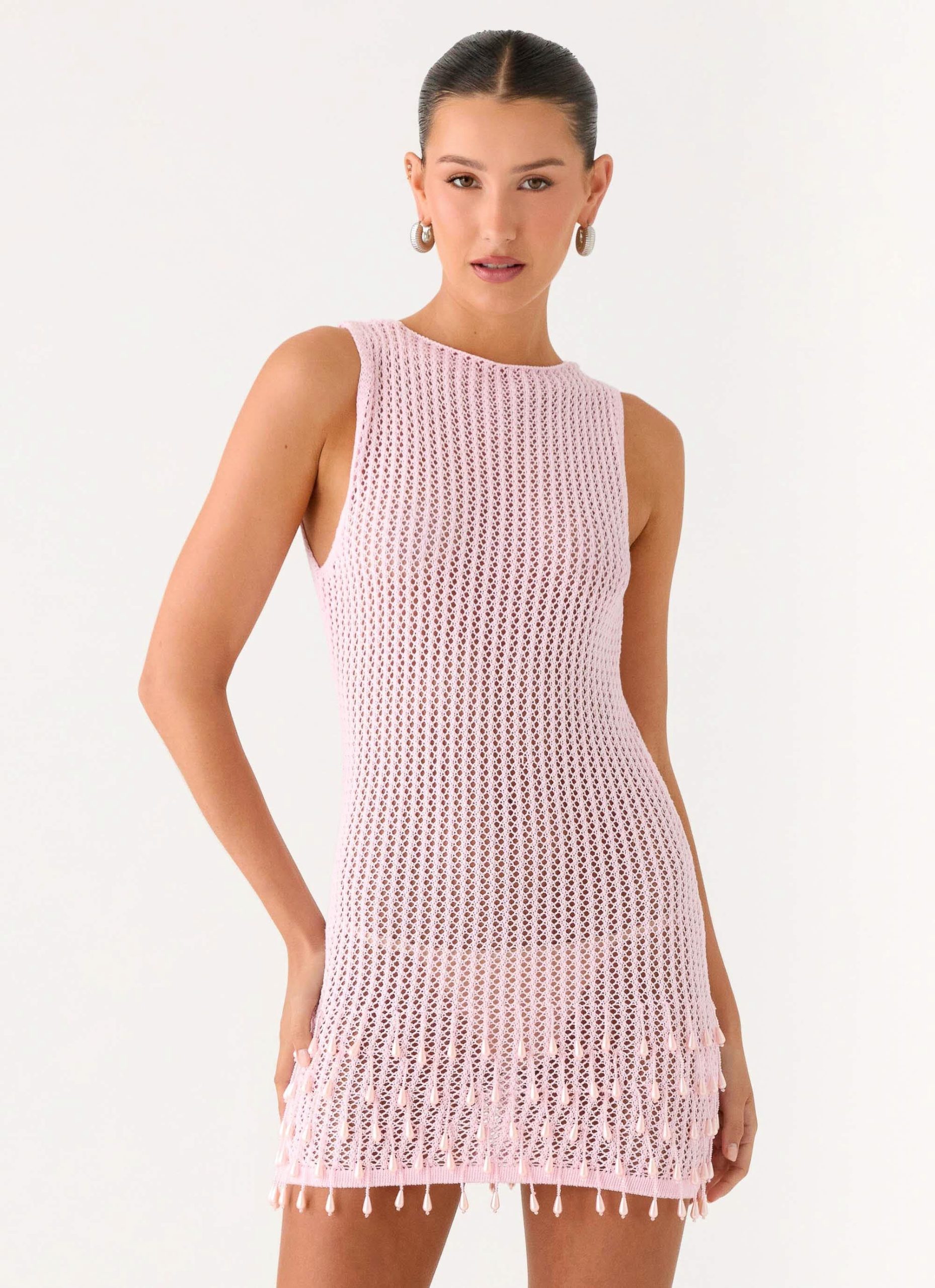 The Miracle Beaded Crochet Mini Dress is a playful and elegant mini dress. perfect for adding sparkle to your look. Featuring a rounded neckline. stretch crochet knit. and semi-sheer fabric. this dress is adorned with delicate beaded hem detailing.