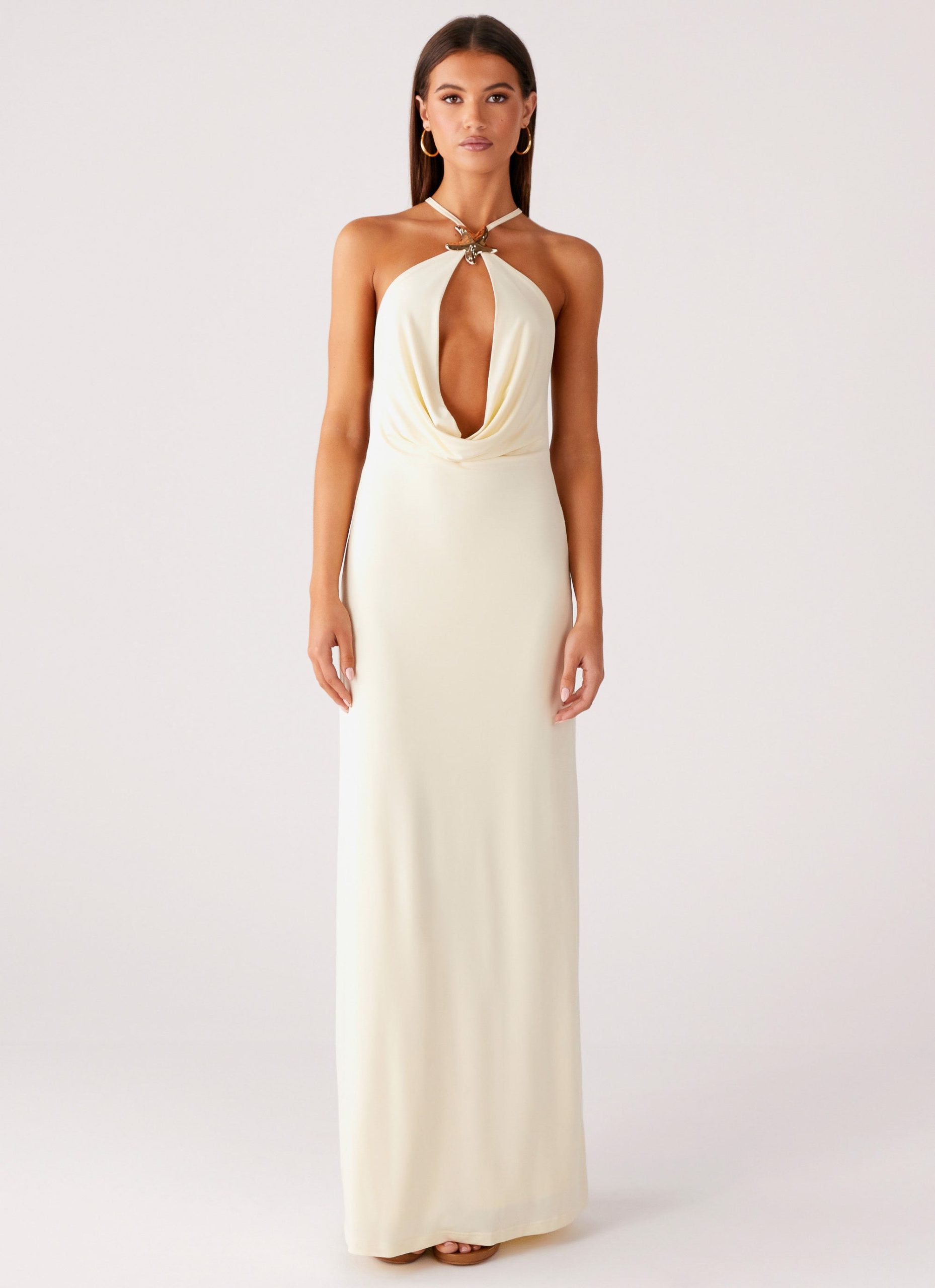 The Mistlight Cowl Maxi Dress is made for glowing nights with effortless elegance. Featuring a cowl neckline and open back. this fully lined jersey dress is detailed with adjustable straps and hardware accents for a sleek finish.