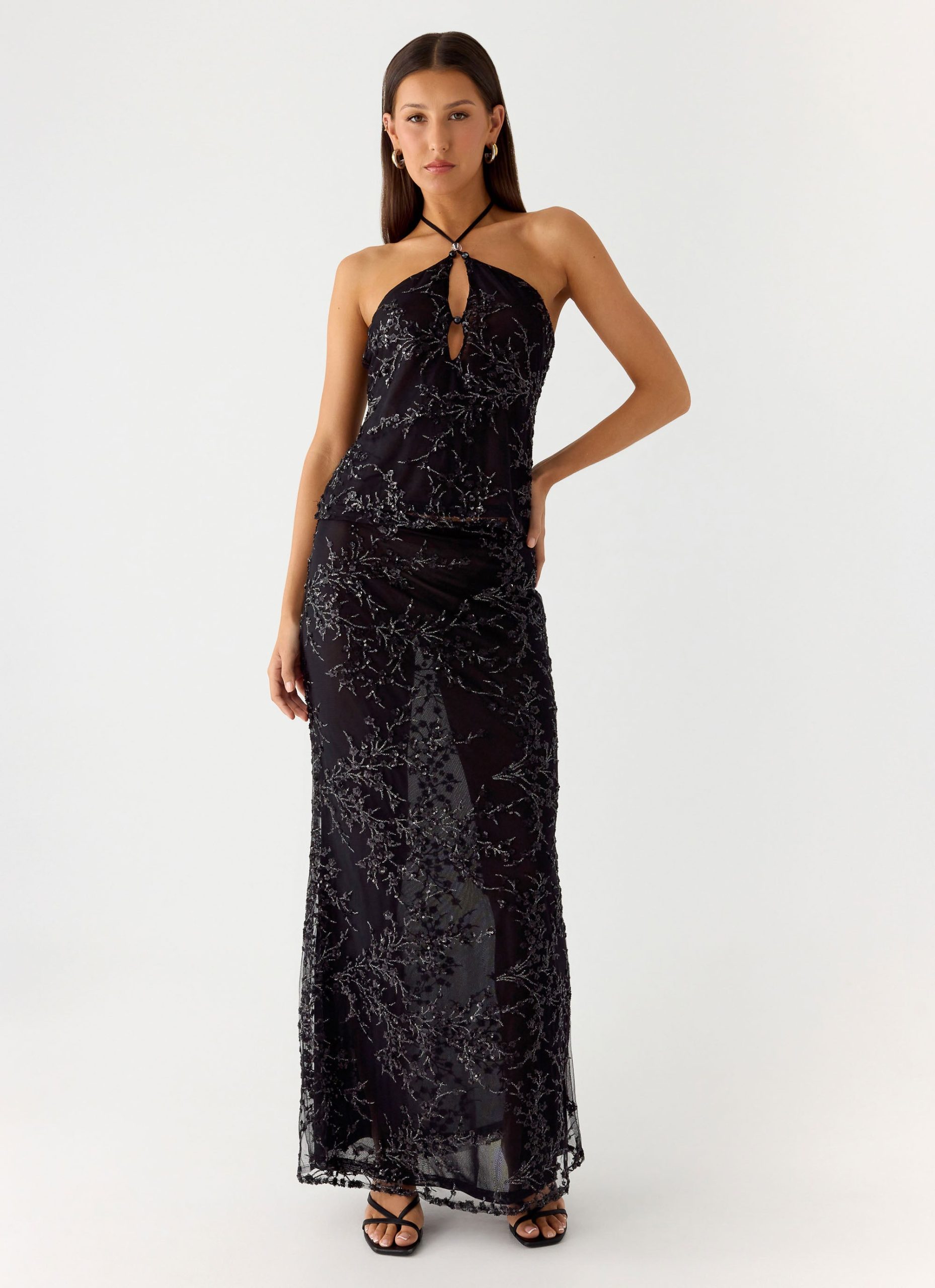 The Moodlight Top is made for golden hour nights and sparkling after-dark moments. Featuring a halter neckline with keyhole detail and beaded straps. this fully lined top is crafted in stretch sequin mesh for a flattering. statement finish. Perfect for pairing with minis or tailored pants for sunset-to-sundown styling.
