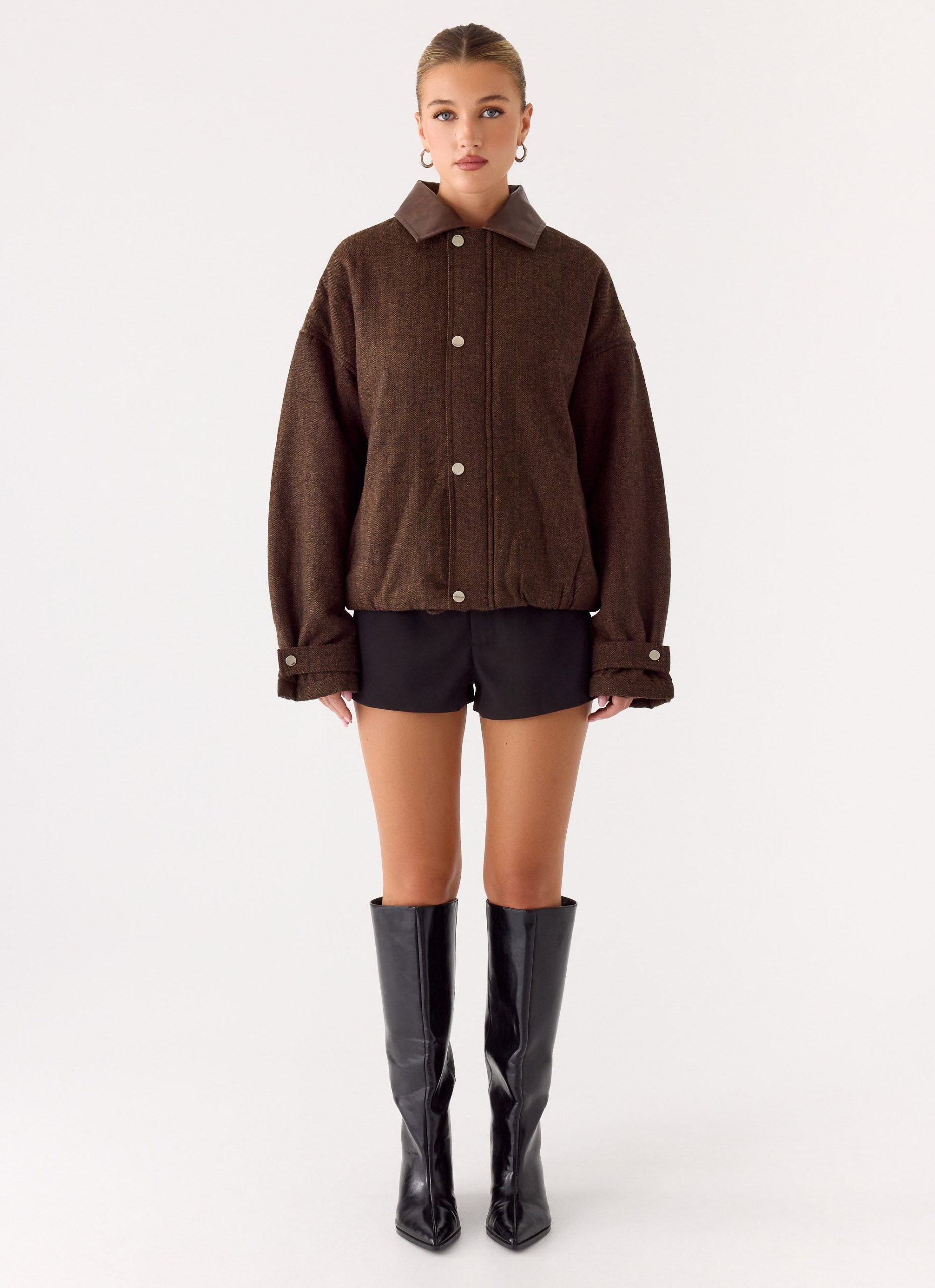 The Myles Herringbone Bomber Jacket is your go-to for effortless. elevated layering. With a sleek herringbone pattern. leather collar. and hidden-button front with zipper closure. this fully lined bomber merges classic tailoring with modern ease. Side welt pockets and a relaxed silhouette make it perfect for city nights and golden-hour walks.
