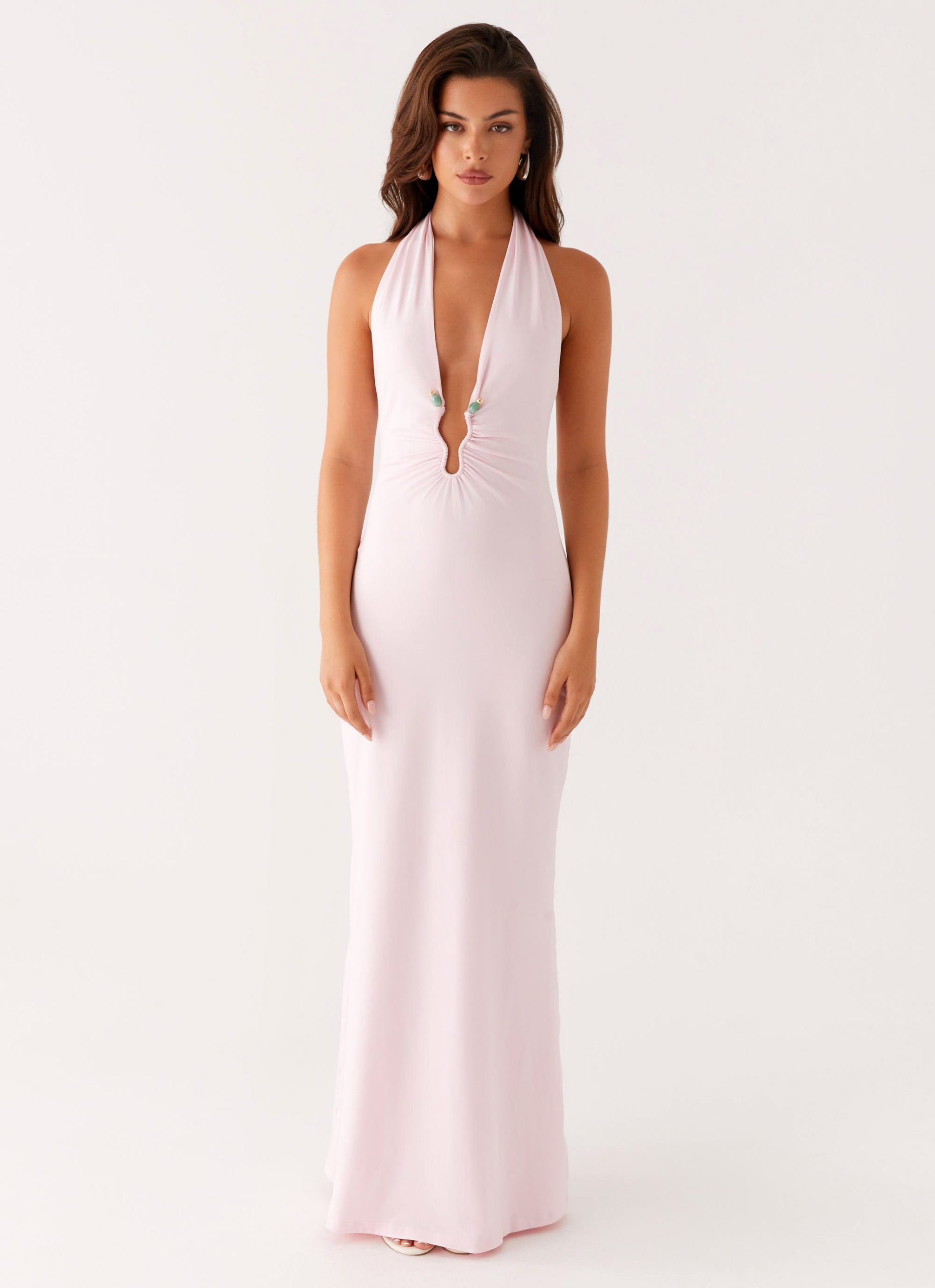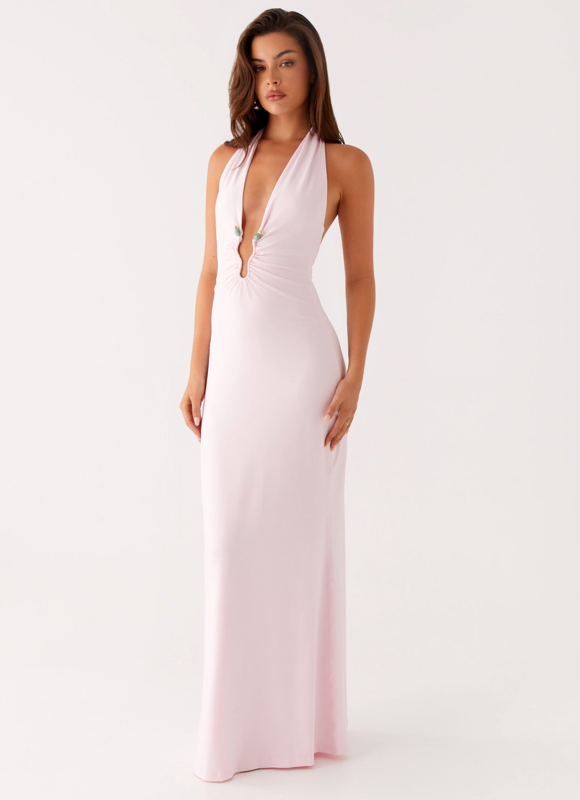 The Nicola Maxi Dress is an effortlessly elegant piece. featuring a flattering low V-neckline and a ruched front that enhances the silhouette. Its sleek design and form-fitting structure make it perfect for formal events or special occasions. offering both style and comfort in one stunning dress.