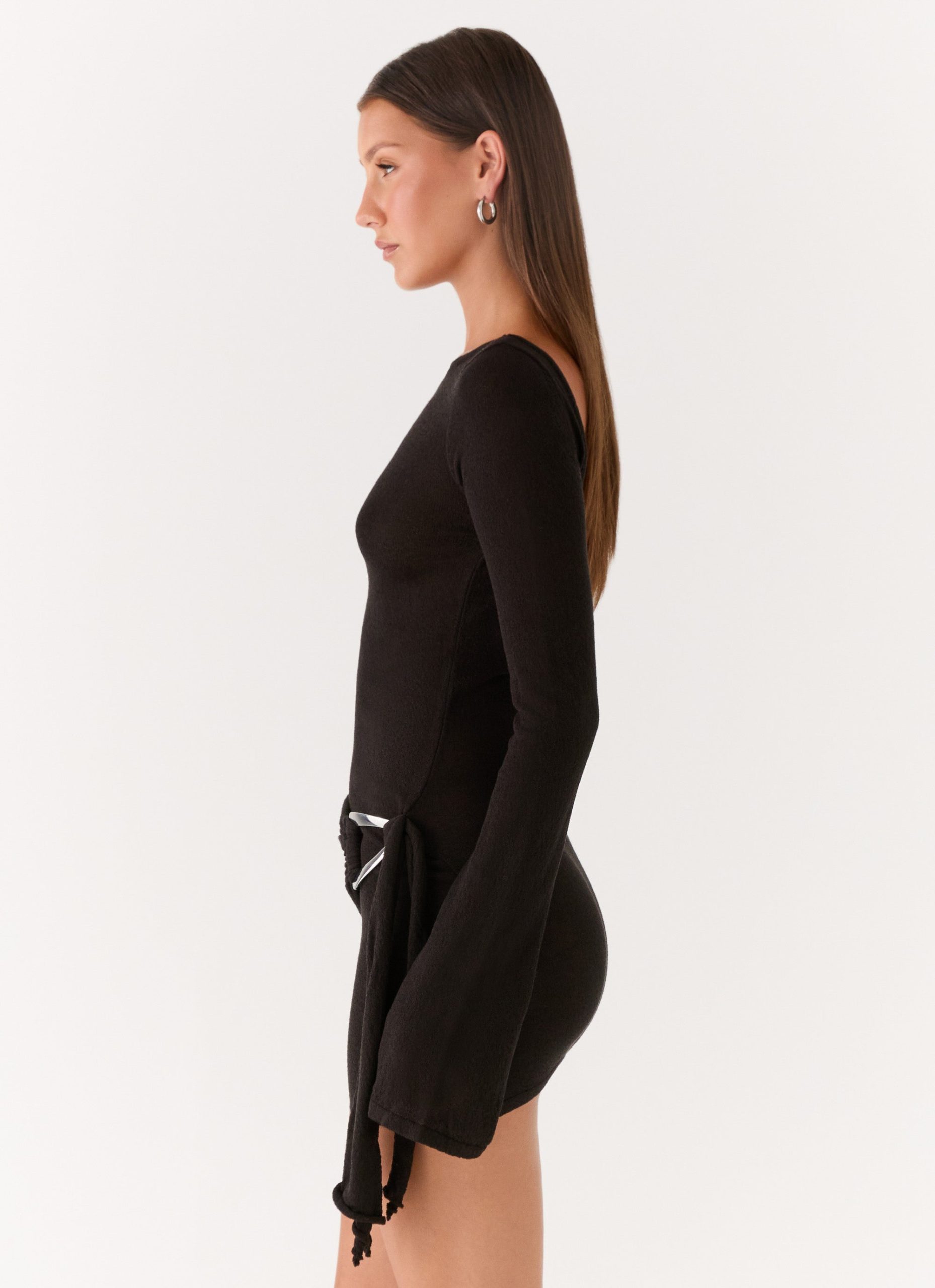 The Niella Long Sleeve Wrap Mini Dress is made for nights that shimmer. Featuring a high wide neckline and open low back. this fitted mini dress has flared sleeves. hardware tie detail. and a semi-sheer. unlined finish for bold. effortless style.