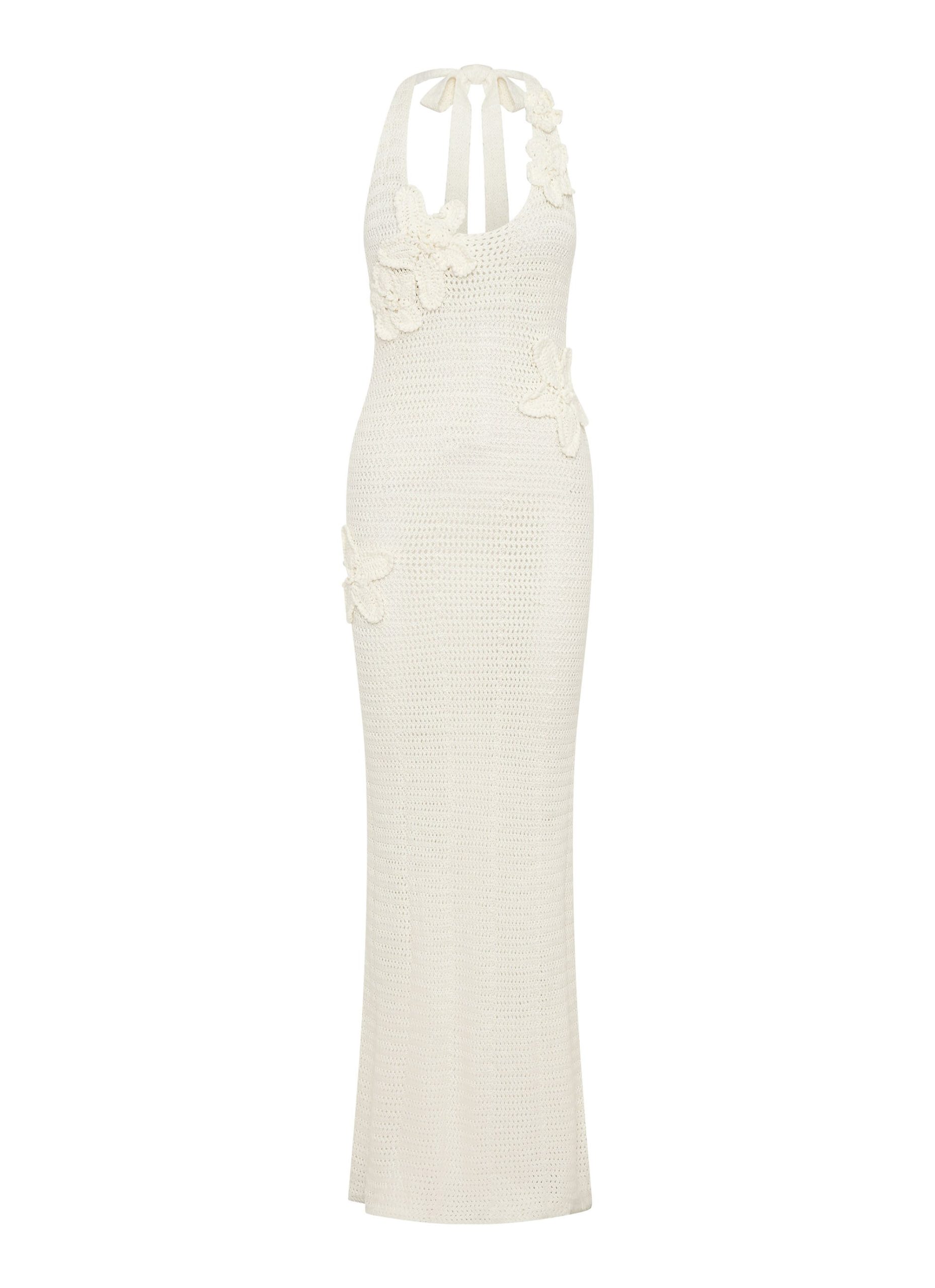 The Novalee Flower Crochet Maxi Dress combines delicate crochet detailing with a flattering low rounded neckline. Crafted from stretch knit. this semi-sheer design drapes beautifully. offering a relaxed yet sophisticated vibe. Perfect for daytime outings or evening events. this dress balances comfort and elegance with its floral patterns and flowing silhouette.