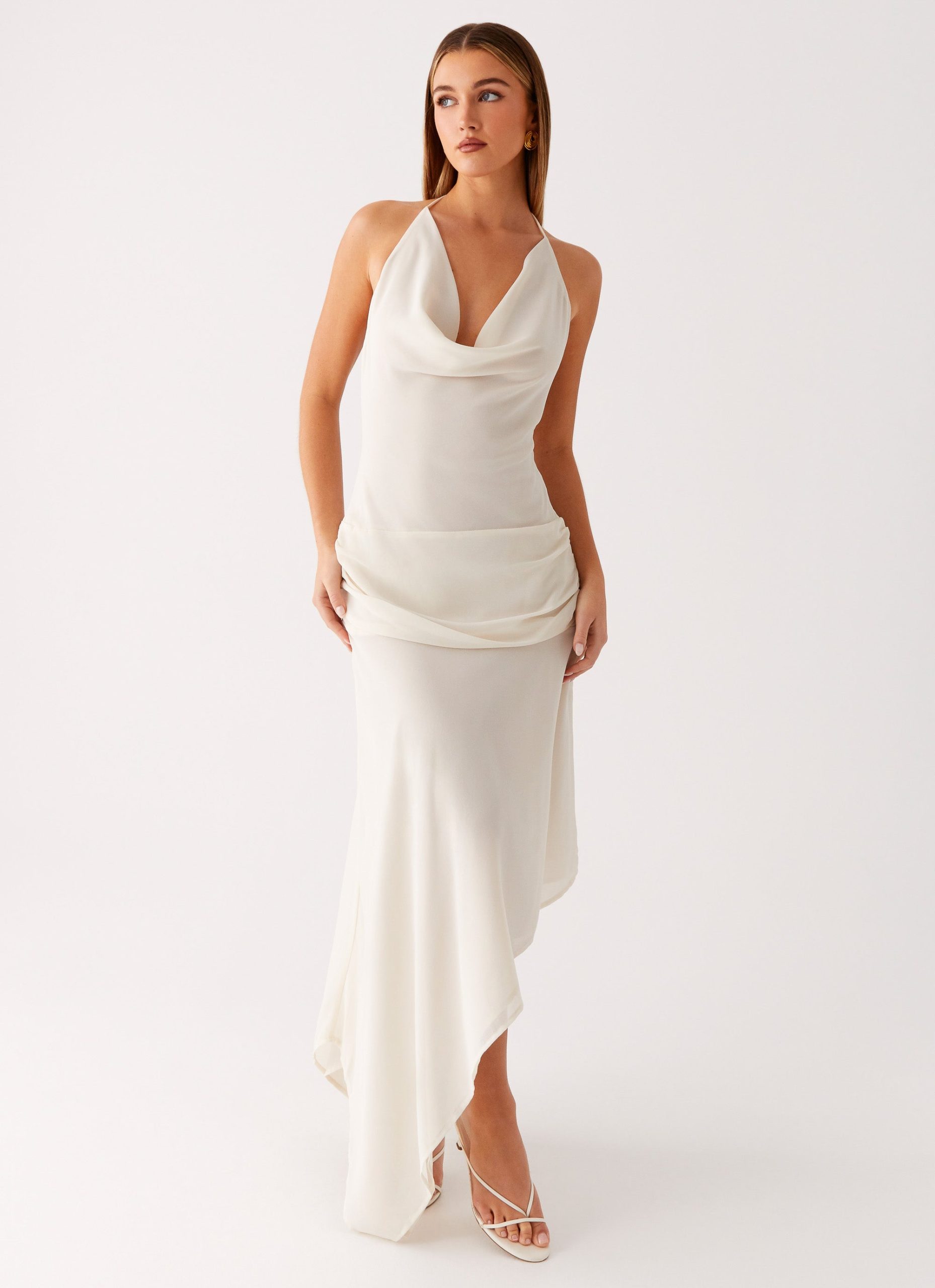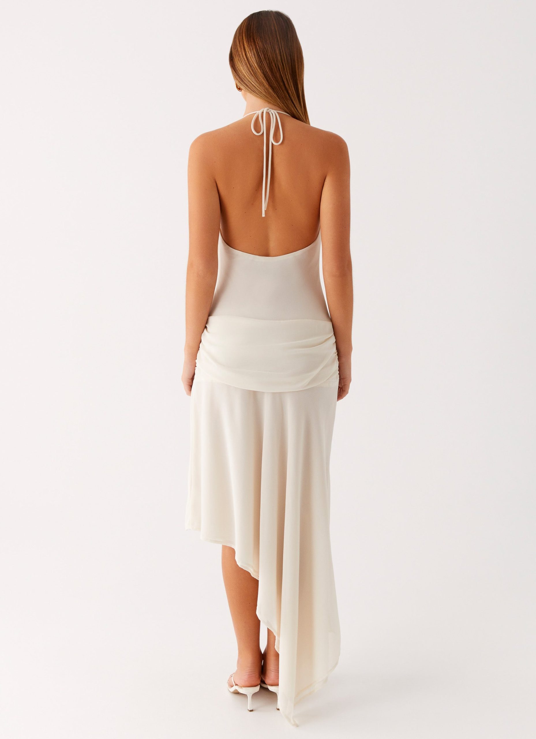 The Nyra Midi Dress is designed to turn heads with its front cowl neckline and flattering ruched sides. Featuring a halter neck tie strap. low back. and an asymmetrical hemline. it’s cut from a semi-sheer fabric and self-lined for a sleek silhouette. Finished with a side hook and eye. invisible zipper for easy wear.