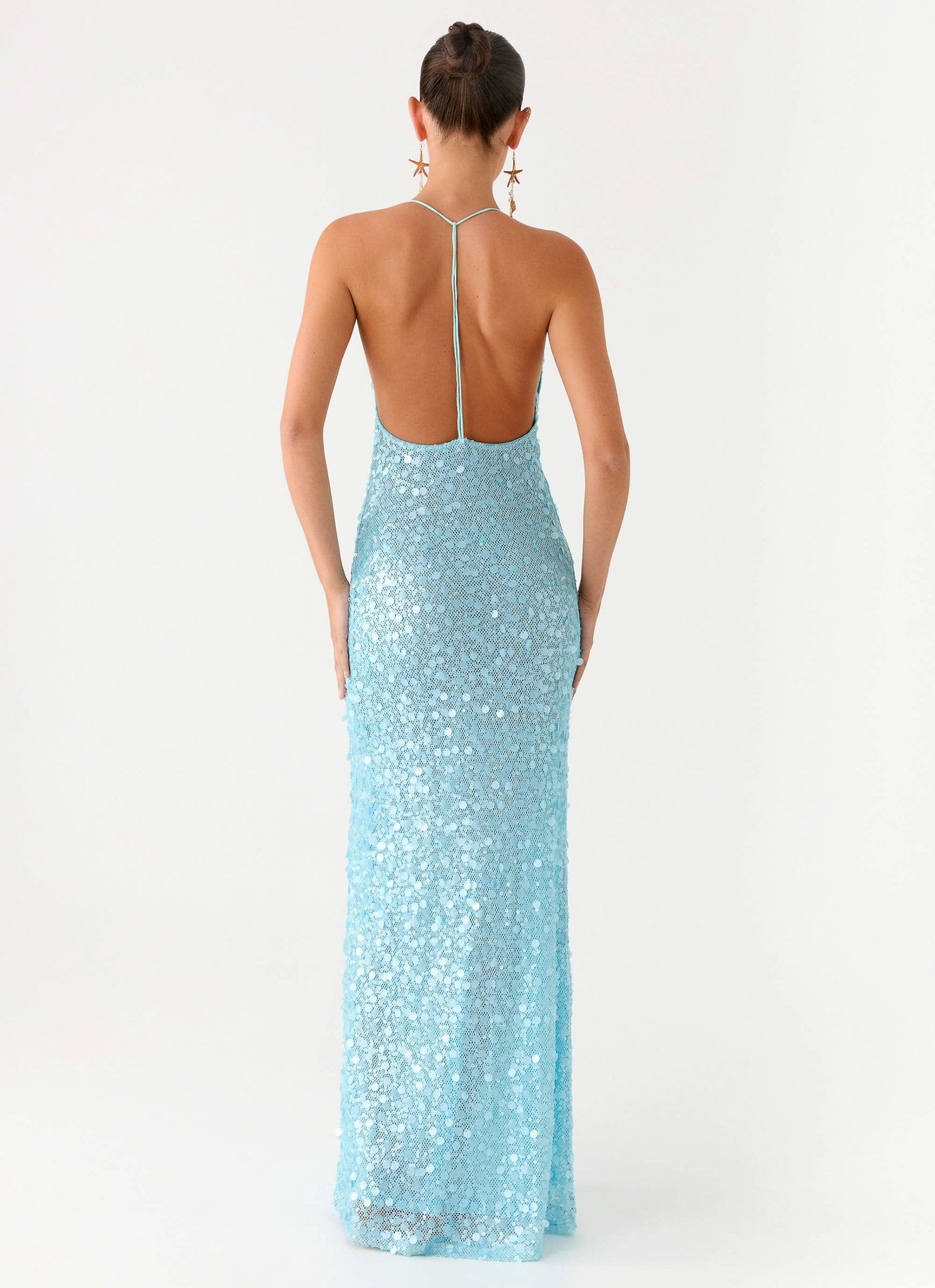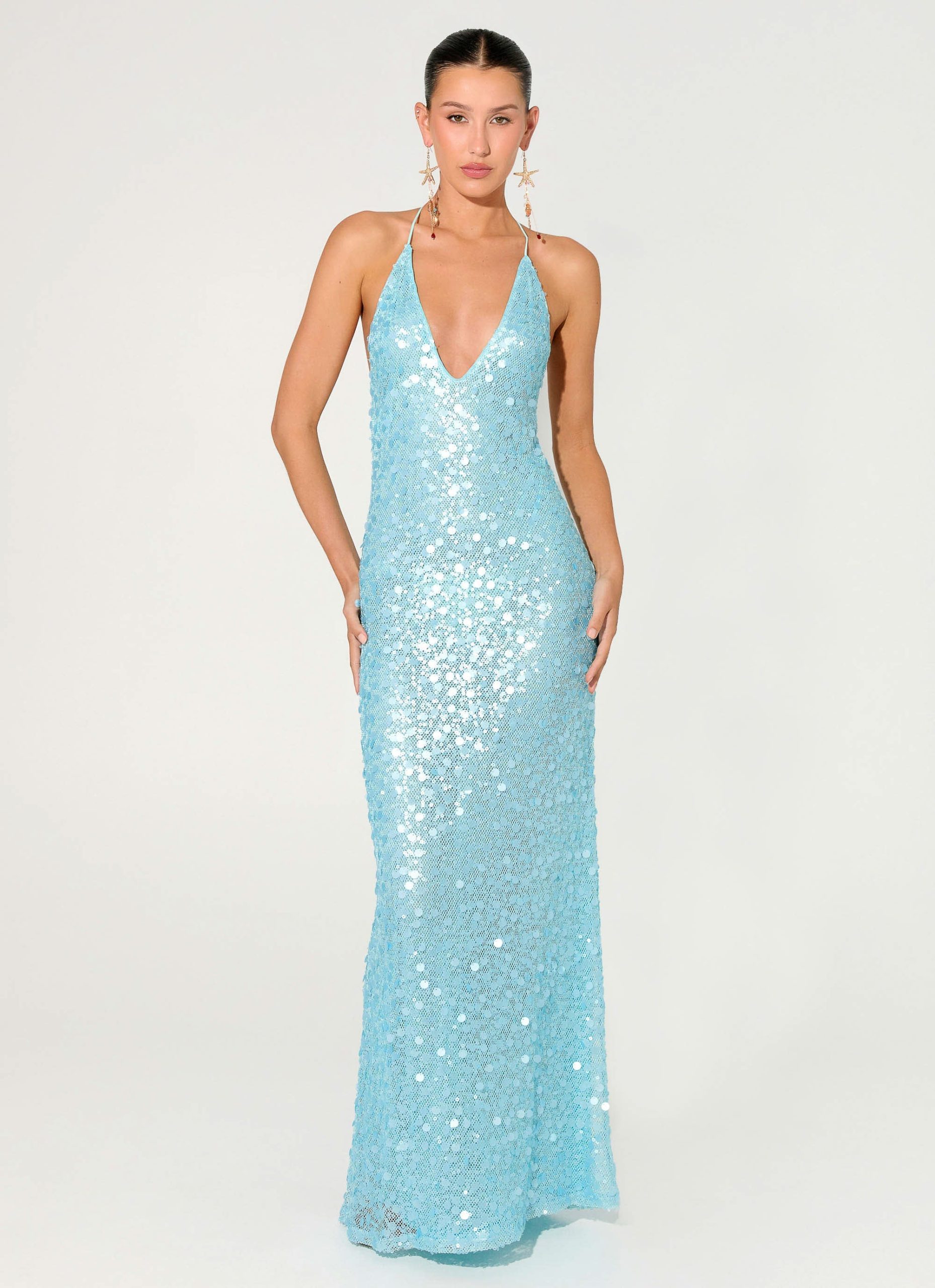 Make an entrance in the Ocean Views Sequin Maxi Dress. a show-stopping silhouette designed to shimmer all night long. Featuring a plunging V neckline. low back. and semi-sheer stretch sequin fabric. this maxi dress is fully lined for comfort while delivering maximum sparkle.