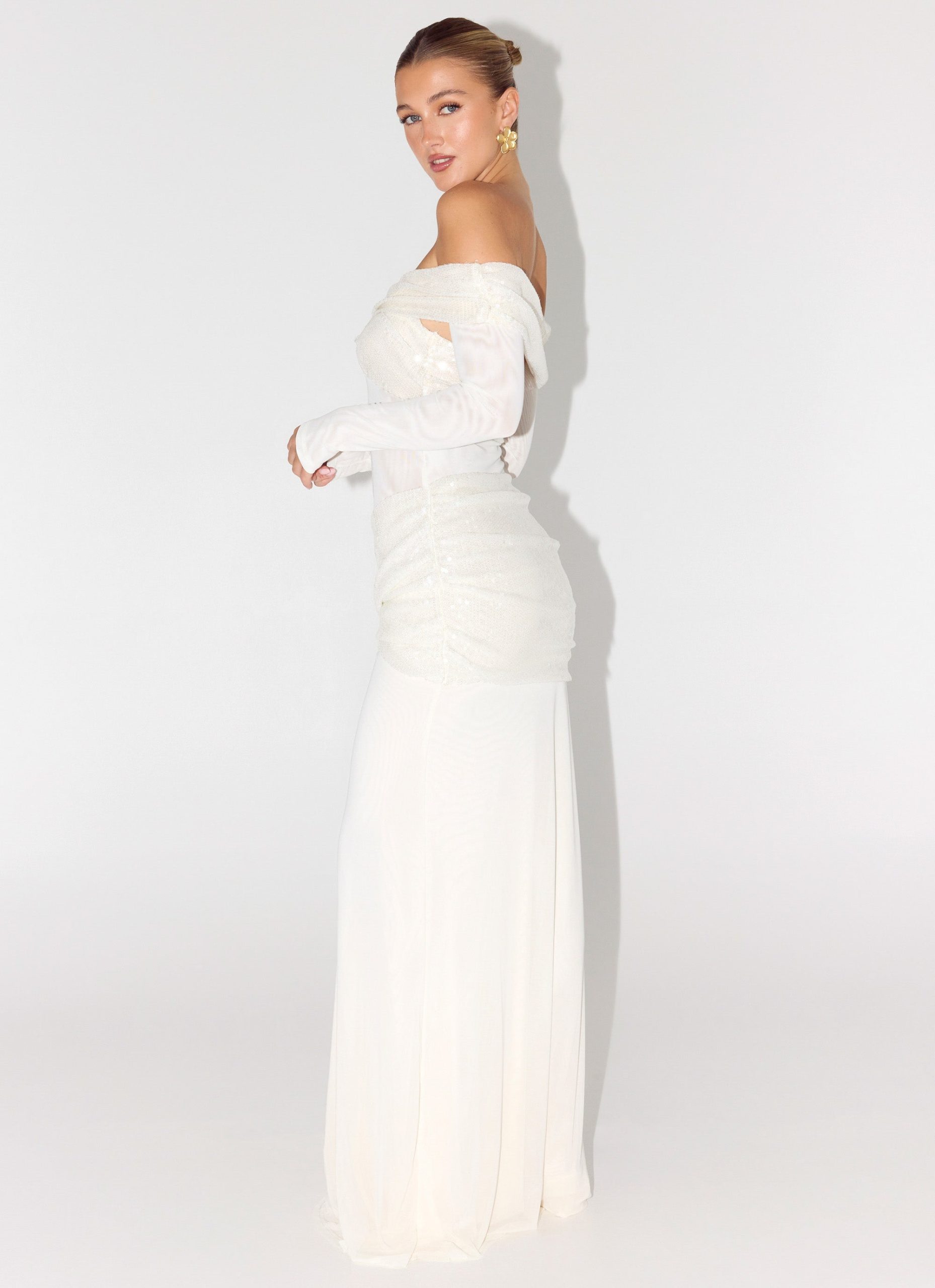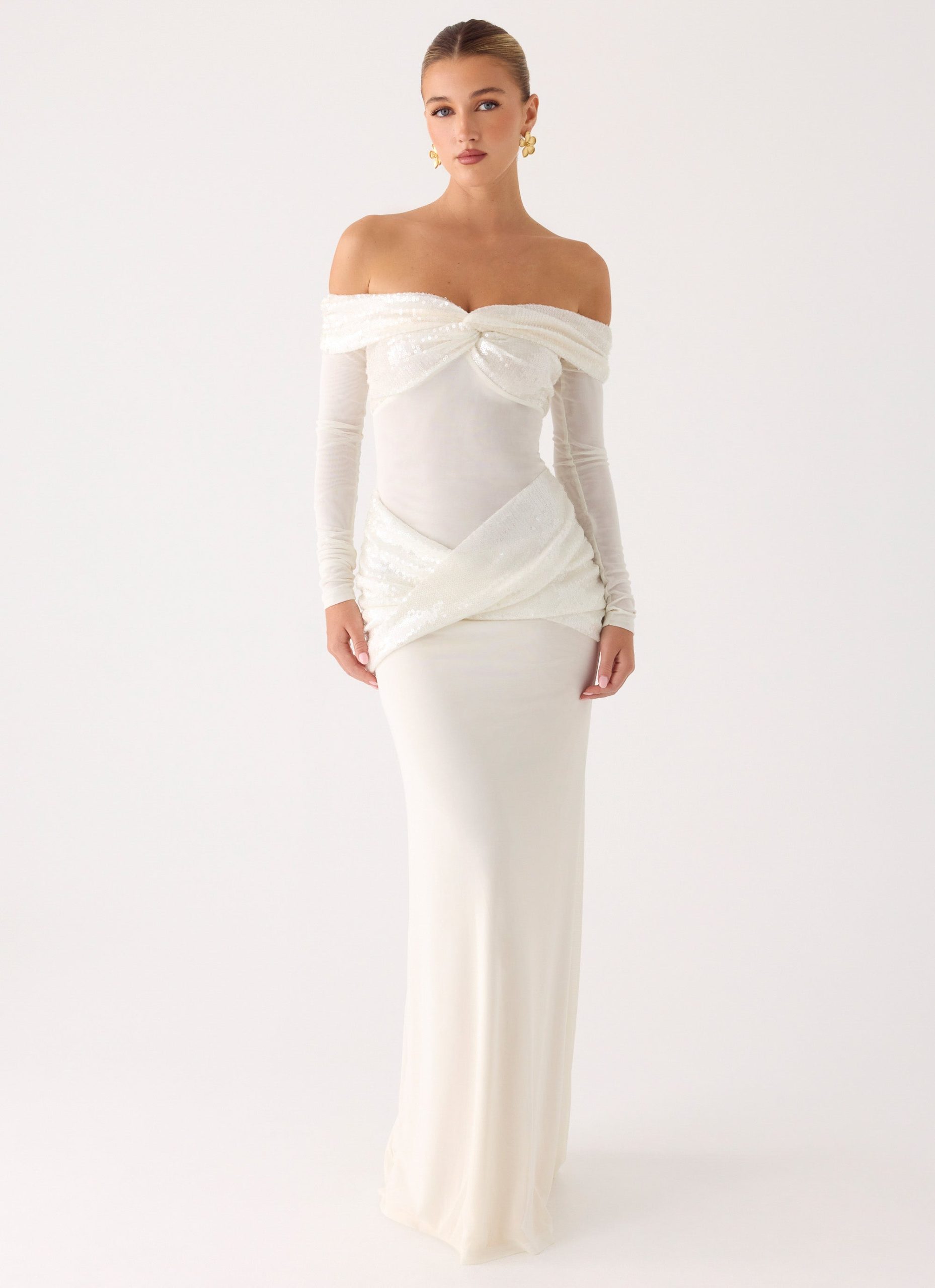 The Over To You Sequin Maxi Dress is made for nights that shimmer under city lights. Featuring a maxi length with an off-the-shoulder silhouette. this fully lined dress boasts a sheer bodice. twist detailing. and a draped sash for an elegant. figure-flattering fit. Side invisible zipper ensures a seamless finish for evening occasions.