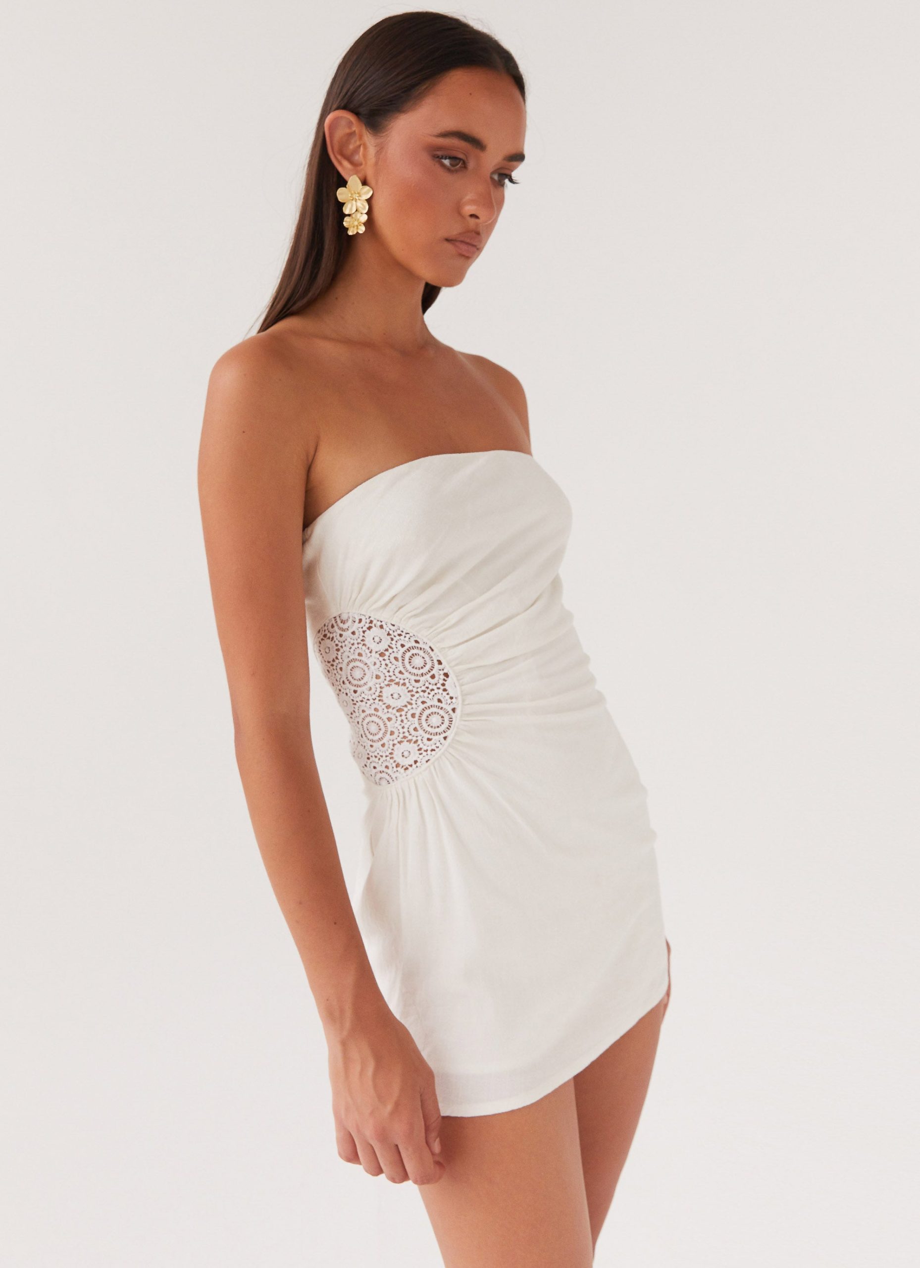 Introducing our Palm Island Mini Dress. Designed with a crochet side detail and a flattering strapless neckline. this dress exudes effortless elegance and summer charm. Ideal for capturing the allure of golden skies. balmy nights. and nightclub silhouettes.