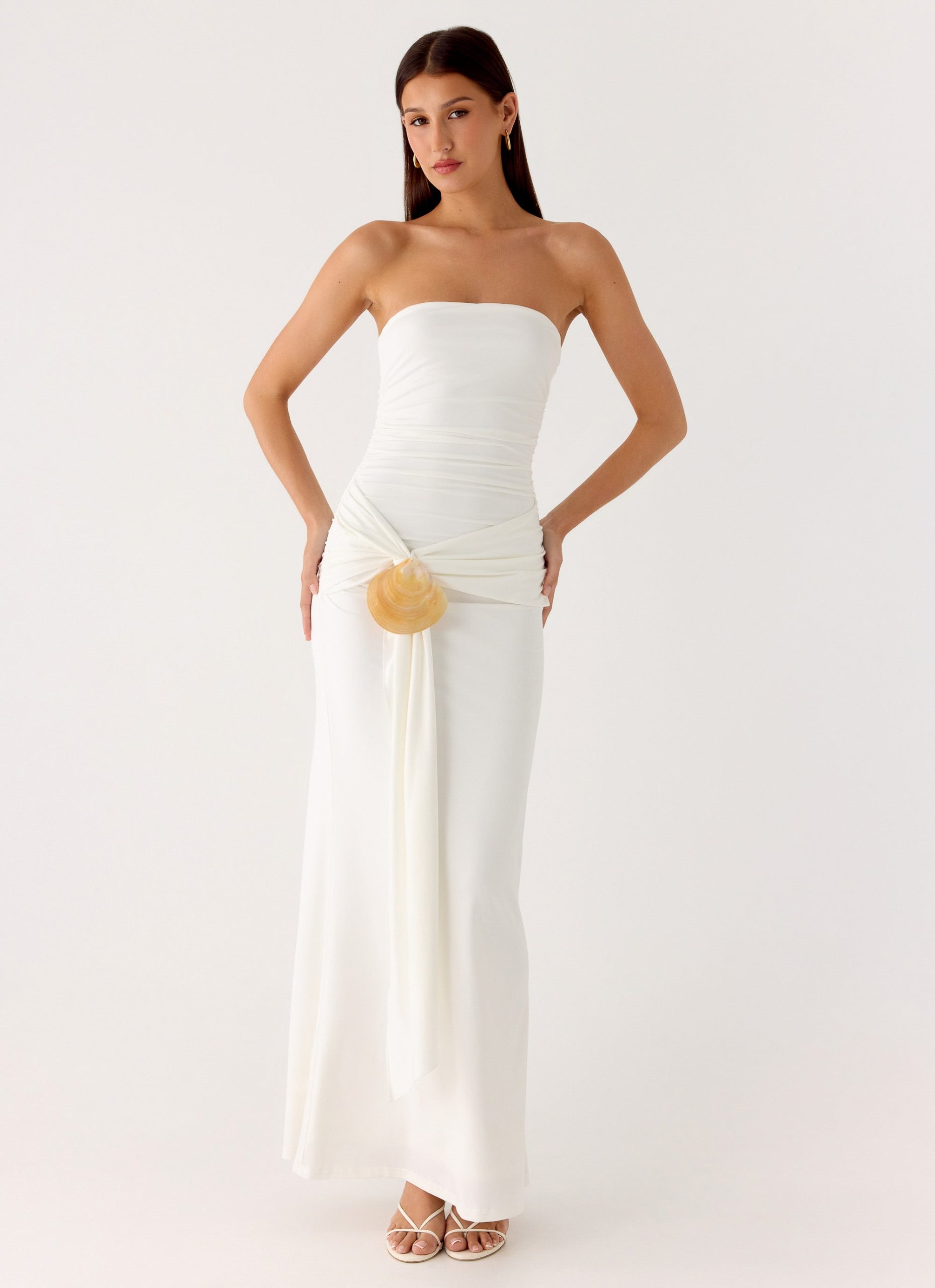 The Party After Party Shell Maxi Dress is perfect for nights that shimmer under city lights. With a strapless neckline. adjustable straps. and a front tie sash. this stretch jersey maxi dress features ruched sides. a shell detail. and a flowy silhouette that moves with you from sunset to sundown.