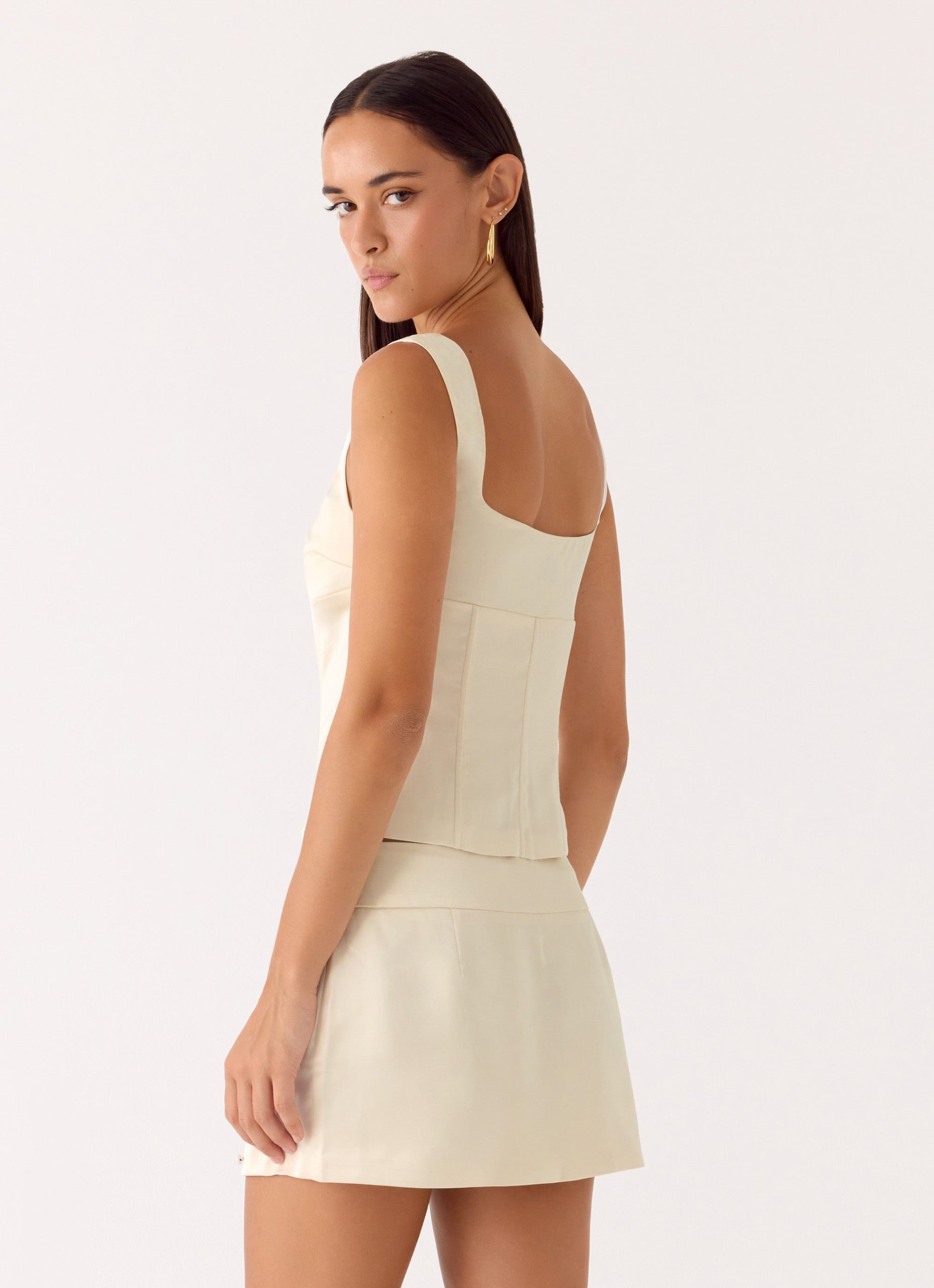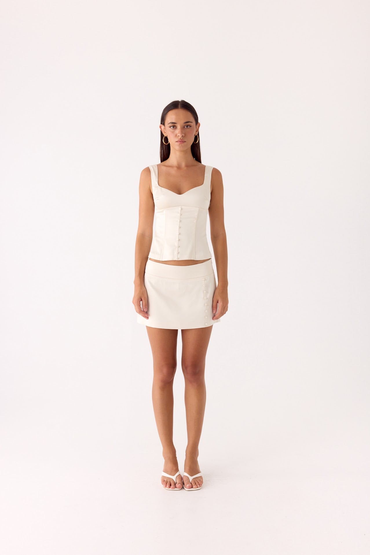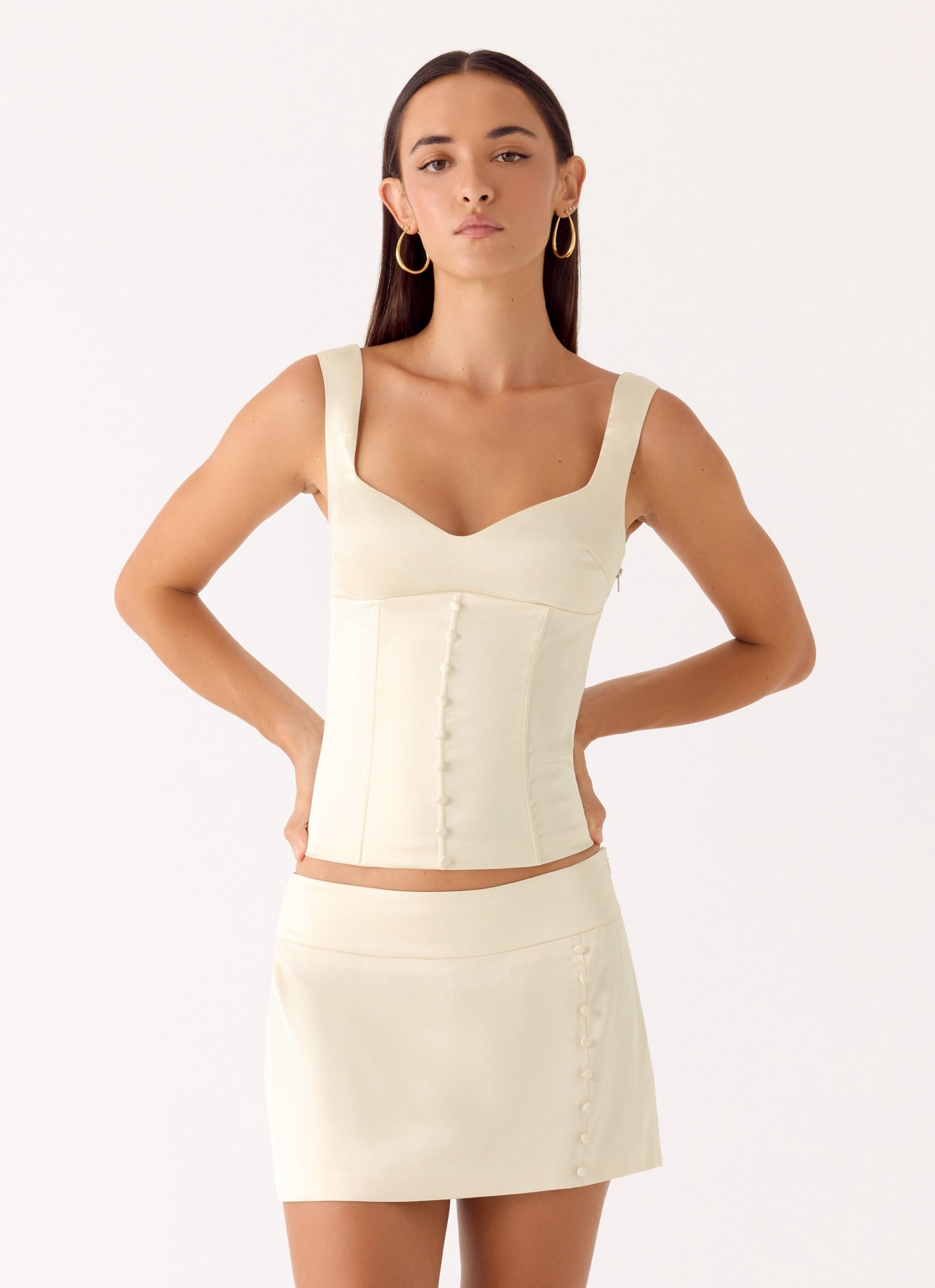 The Posy Top is made for golden hour to after-dark elegance. Featuring a satin fitted bodice with structured boning. it sculpts the silhouette while self-covered buttons and a side zipper add polished. editorial detail. Sleek and refined. this top moves effortlessly from sunset soirées to nightfall allure.