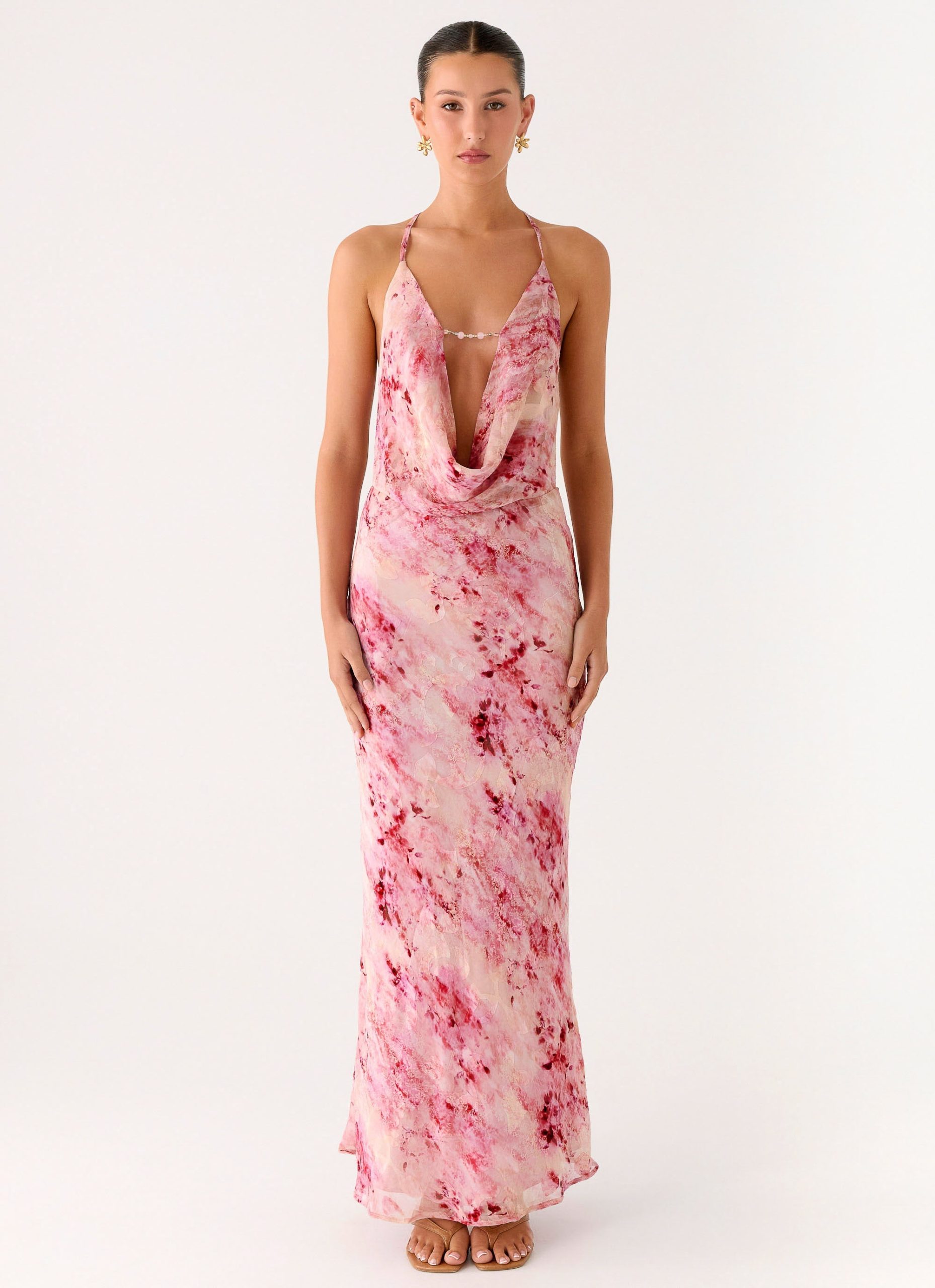 The Pure Heart Cow Maxi Dress is made for nights that never fade. Featuring a low front cowl neckline with delicate front beadings and thin adjustable straps. this maxi dress blends softness and shimmer. With a low back. stretch mesh fabric. and full lining. it’s your perfect partner from golden hour to after hours.