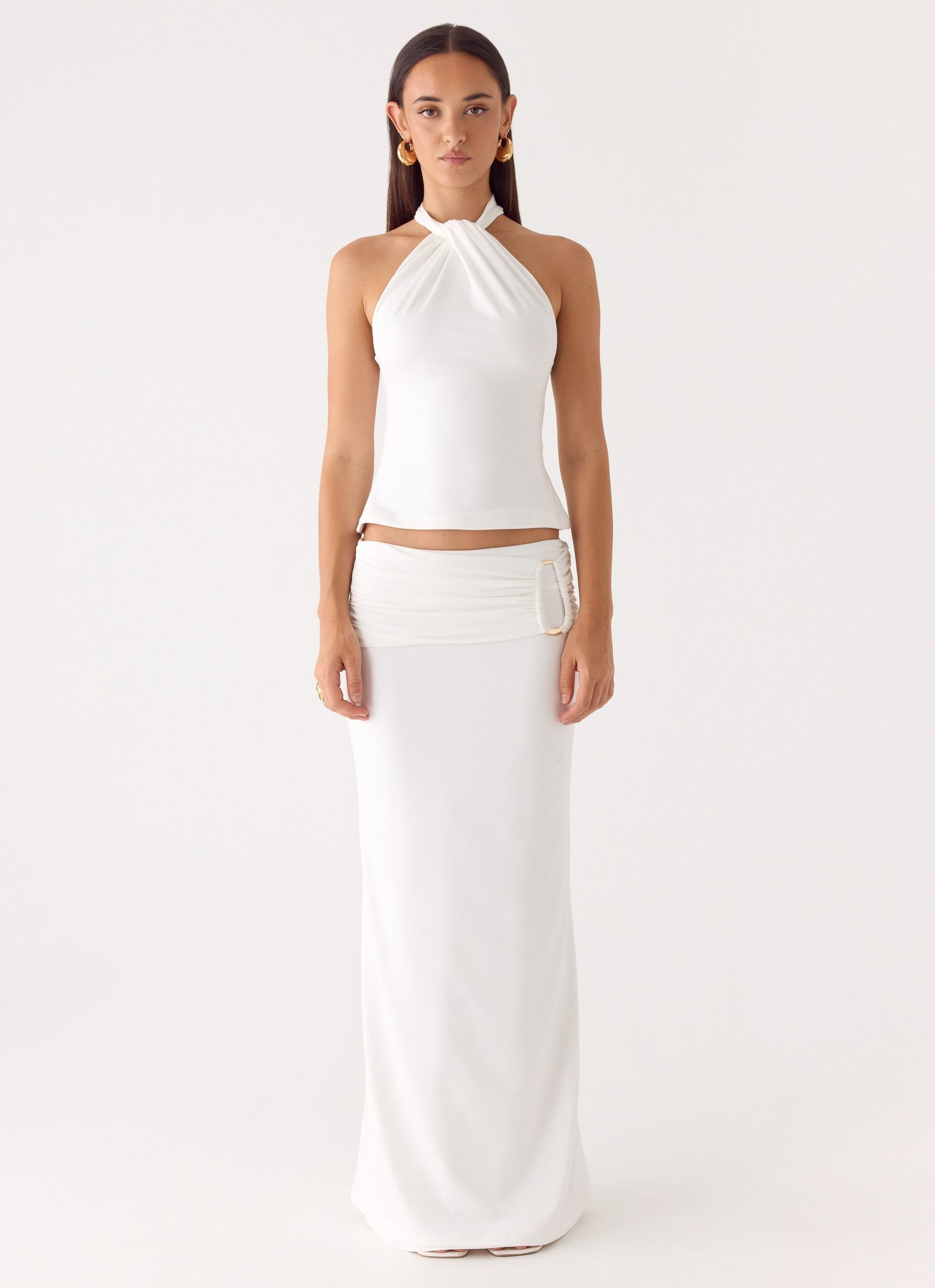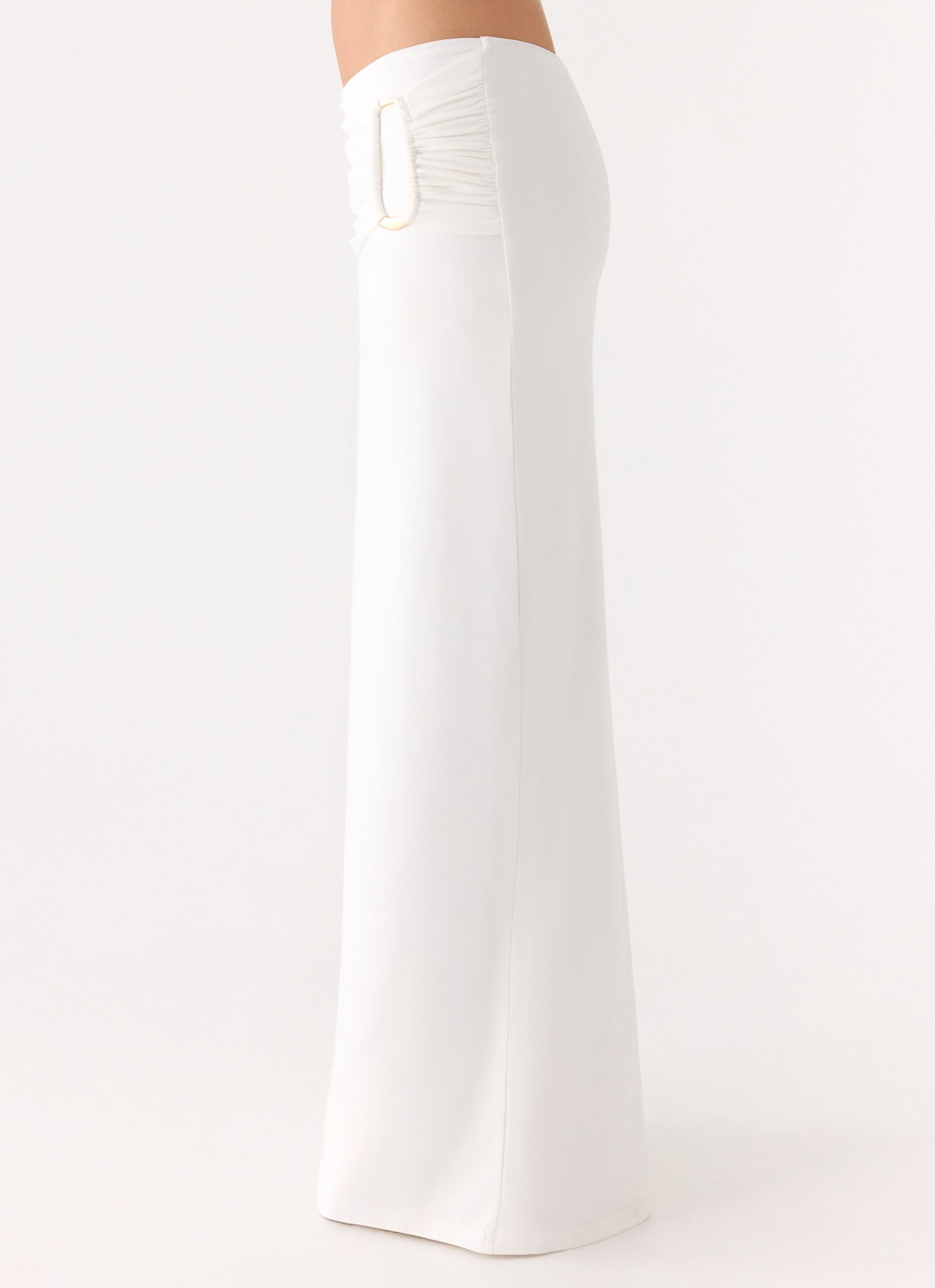 The Rosanna Maxi Skirt is made for sunlit days that glide effortlessly into golden evenings. Featuring a low-rise fit and flowing maxi-length silhouette. it’s detailed with delicate ruching and finished with a subtle gold metal embellishment for an editorial. feminine touch. Fully lined for comfort. it moves with effortless elegance.