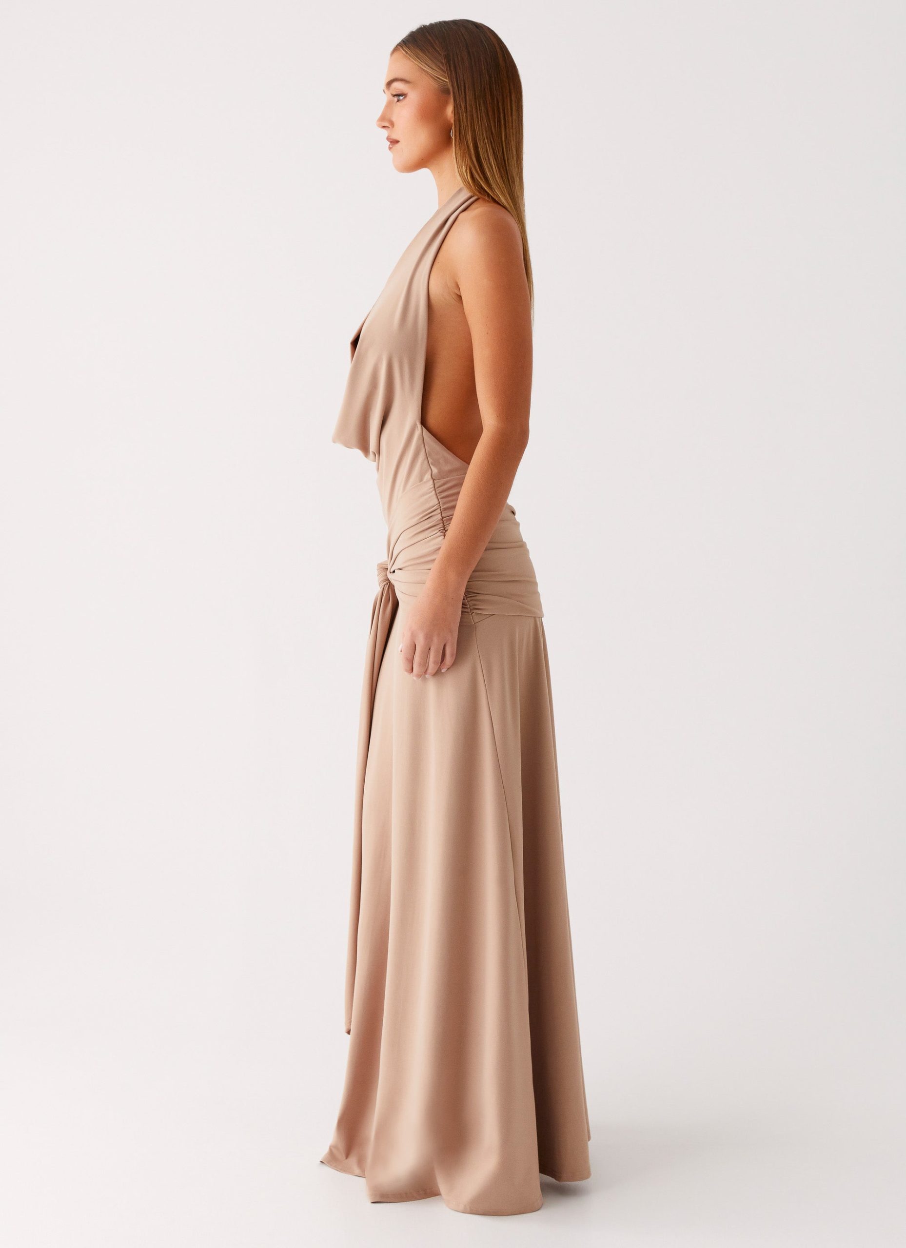 The Rowan Ray Cowl Maxi Dress features a flowing maxi length with a low cowl neckline and thick neck tie strap. Crafted from stretch jersey. it includes front tie detailing. a front side split. a low back. and is self-lined for comfort.