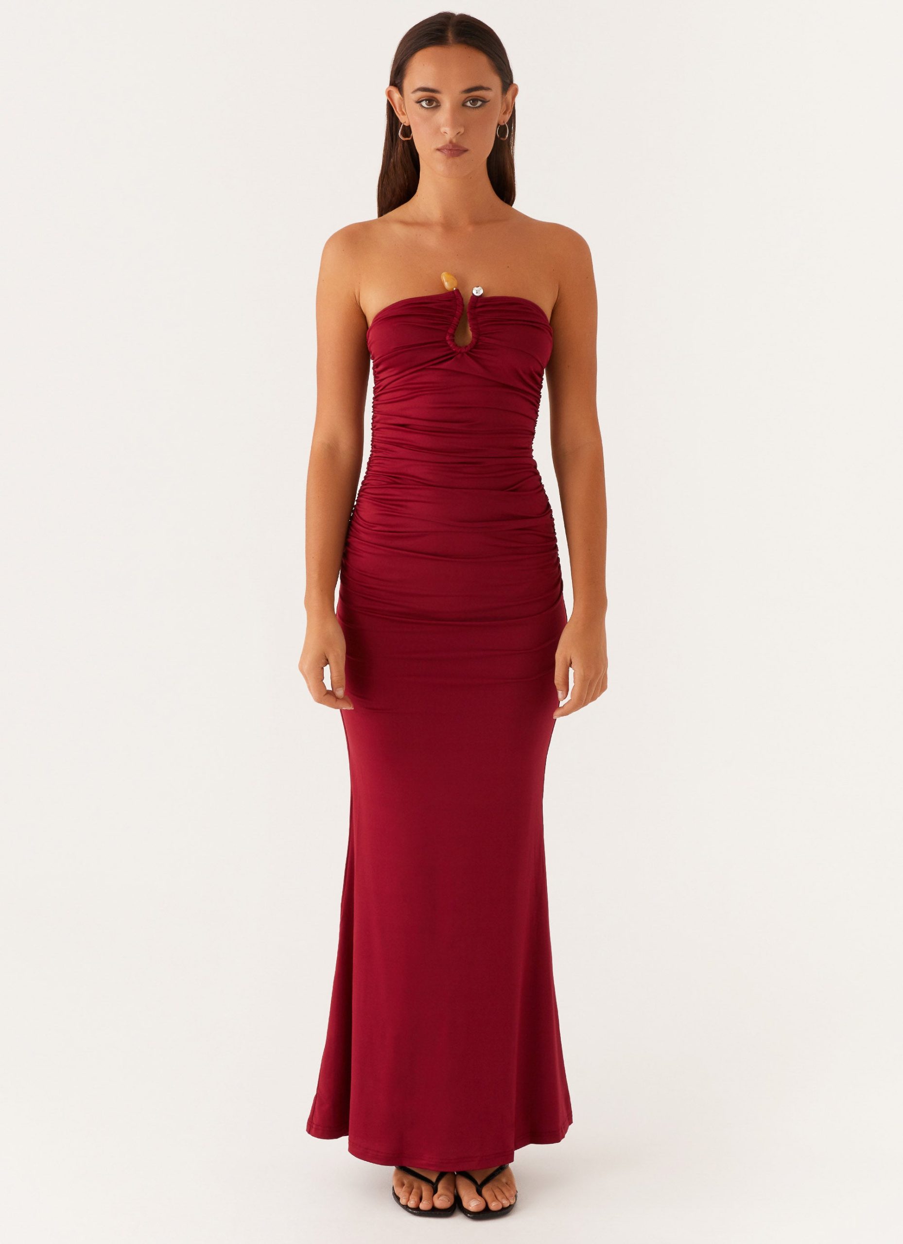 The Rudy Maxi Dress features a strapless neckline with silicone taping for a secure fit. complemented by all-around ruching for a flattering silhouette. This design offers a timeless and elegant look. perfect for evening events or special occasions.