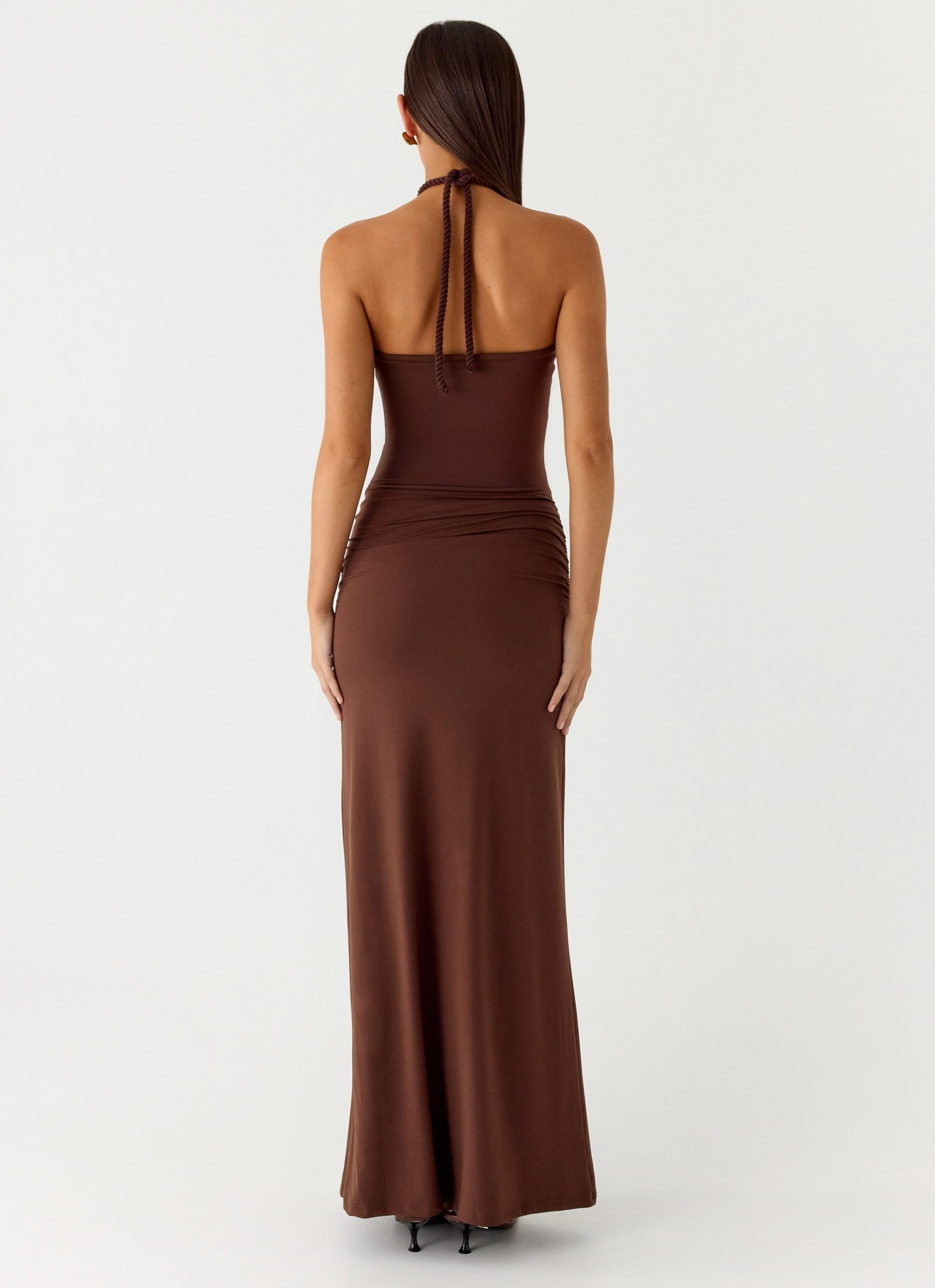 The Sacred Maxi Dress is made for glowing nights and golden skies. Featuring a halter neckline with front keyhole cut-out. ruched bustier and centre waist. and a low back finished with a thin neck tie strap. Crafted in stretch jersey and self-lined for a sleek fit.