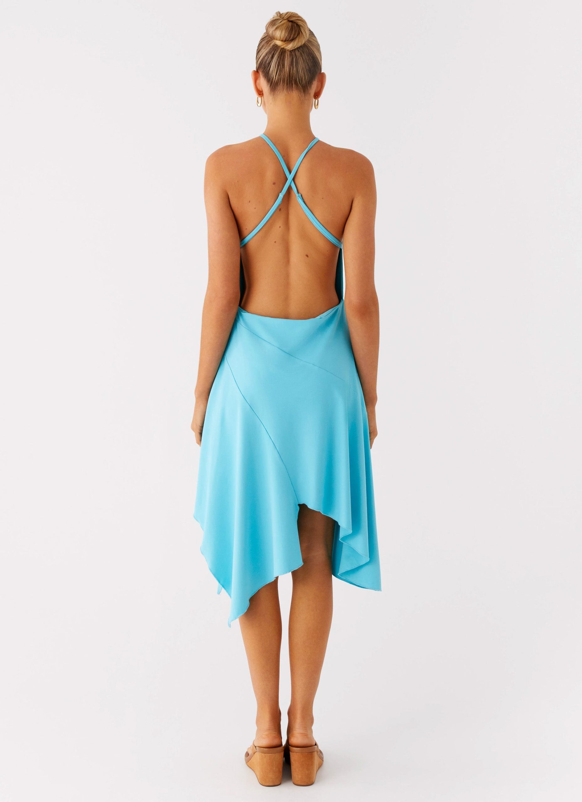 The Salt Kiss Midi Dress is made for balmy nights and dancefloor moments. Designed with a front cowl cut-out and delicate criss-cross back straps. this stretch jersey piece features a striking front metal embellishment and asymmetrical hemline for added allure.