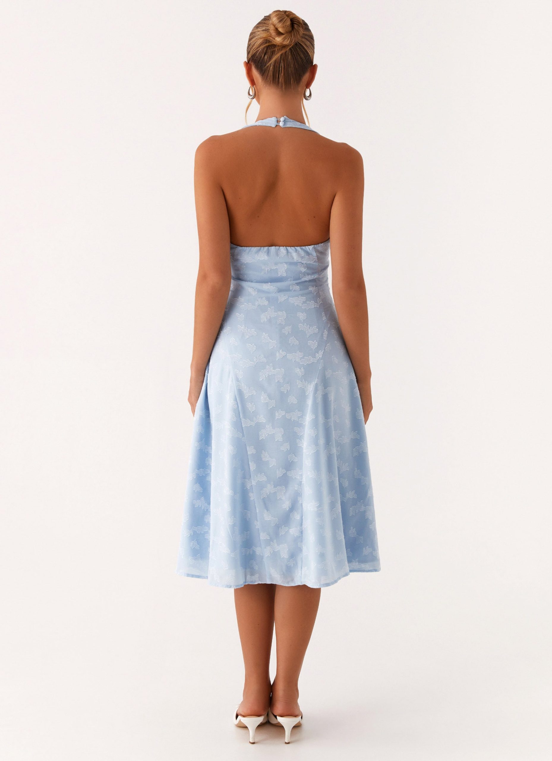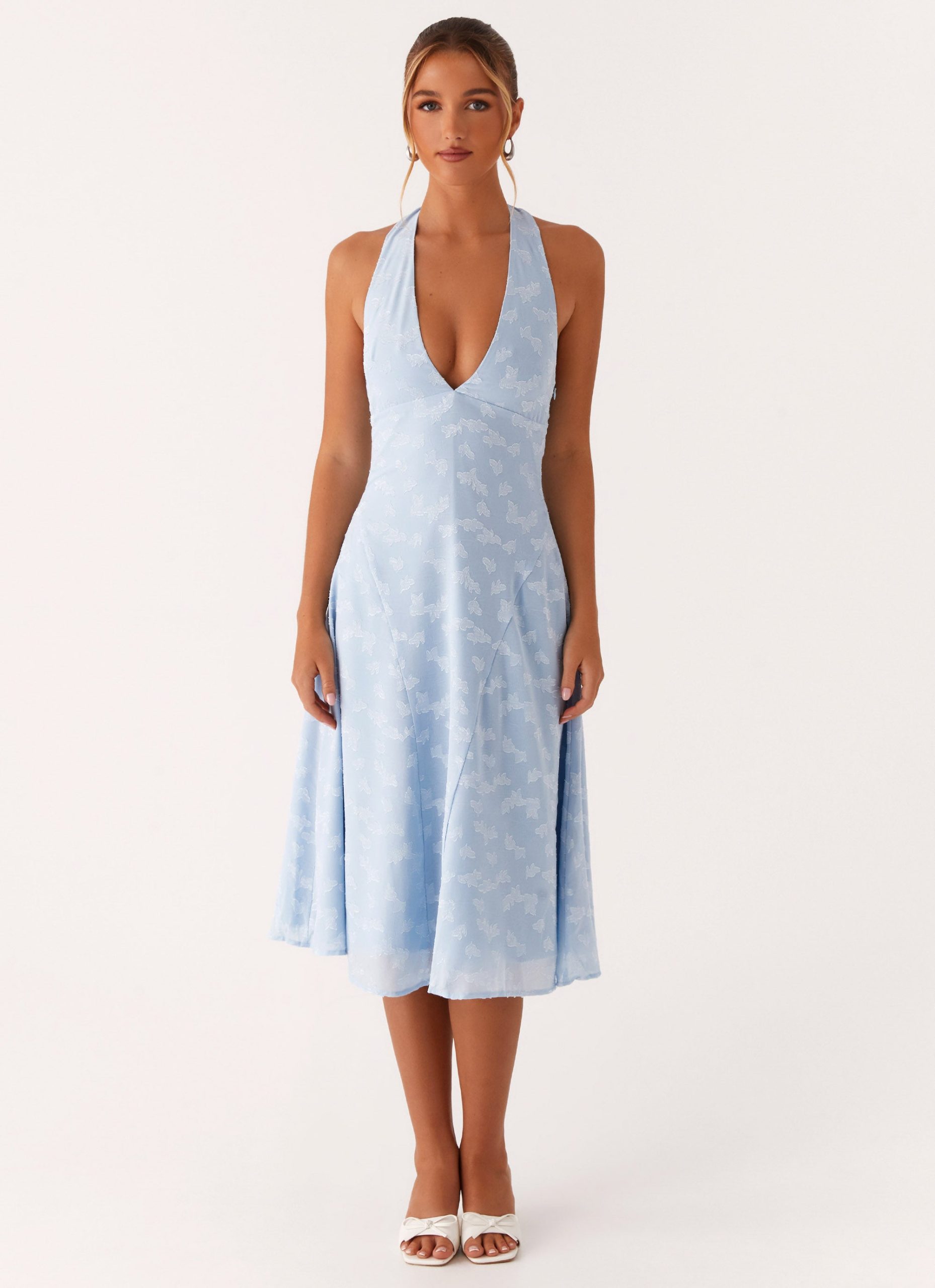 The Sashi Halterneck Midi Dress features a flattering low front V neckline that creates a bold yet elegant look. With an open back and a neck strap. it offers a sleek. contemporary design that’s perfect for evening events.