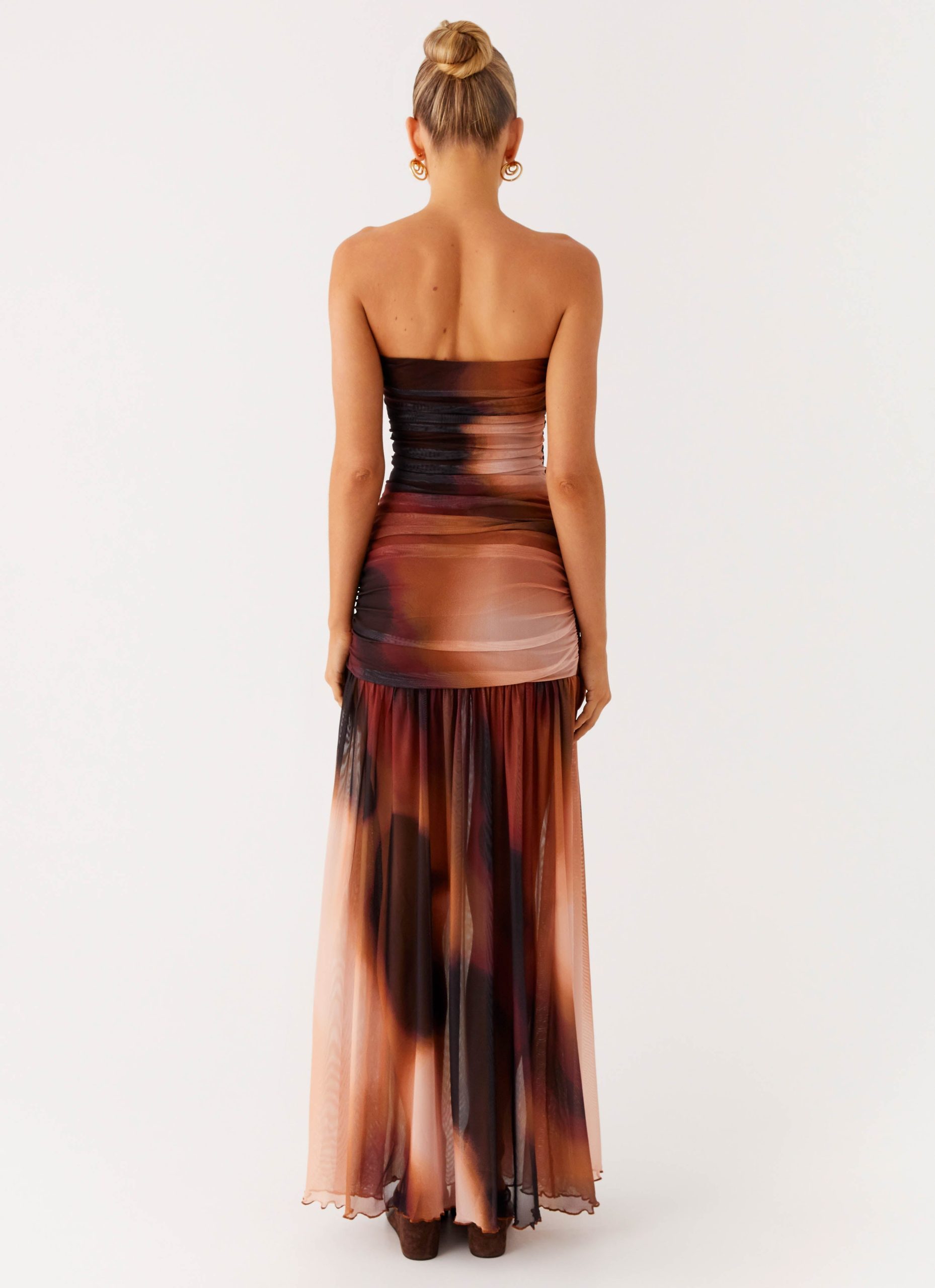 The Savaya Maxi Dress makes an elegant statement with its strapless neckline and ruched bodice. Featuring a front side split and crafted from stretch mesh with silicone neckline taping. this self-lined dress showcases an exclusive print for unique appeal.