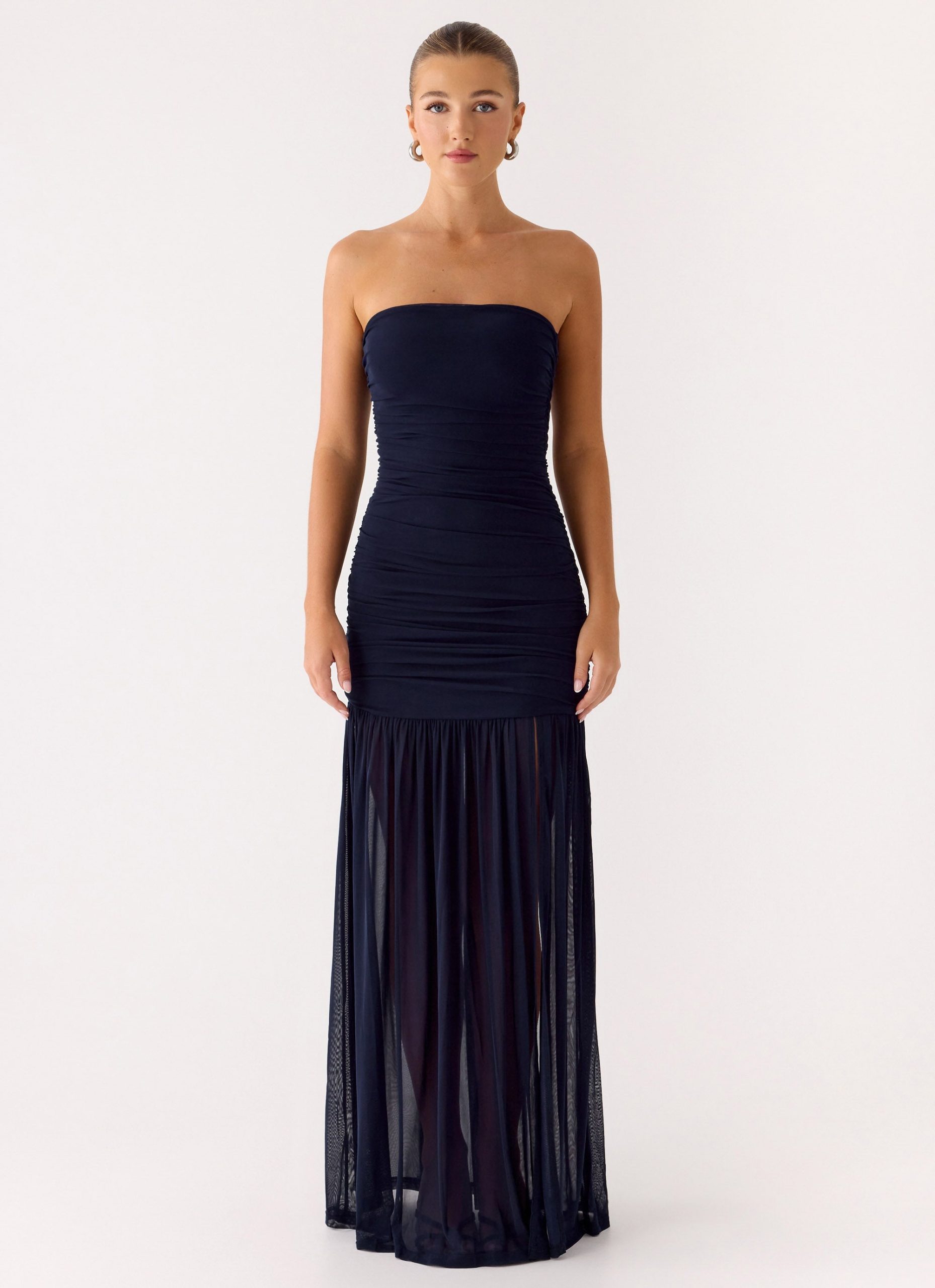 The Savaya Maxi Dress makes an elegant statement with its strapless neckline and ruched bodice. Featuring a front side split and crafted from stretch mesh with silicone neckline taping. this self-lined dress showcases an exclusive print for unique appeal.