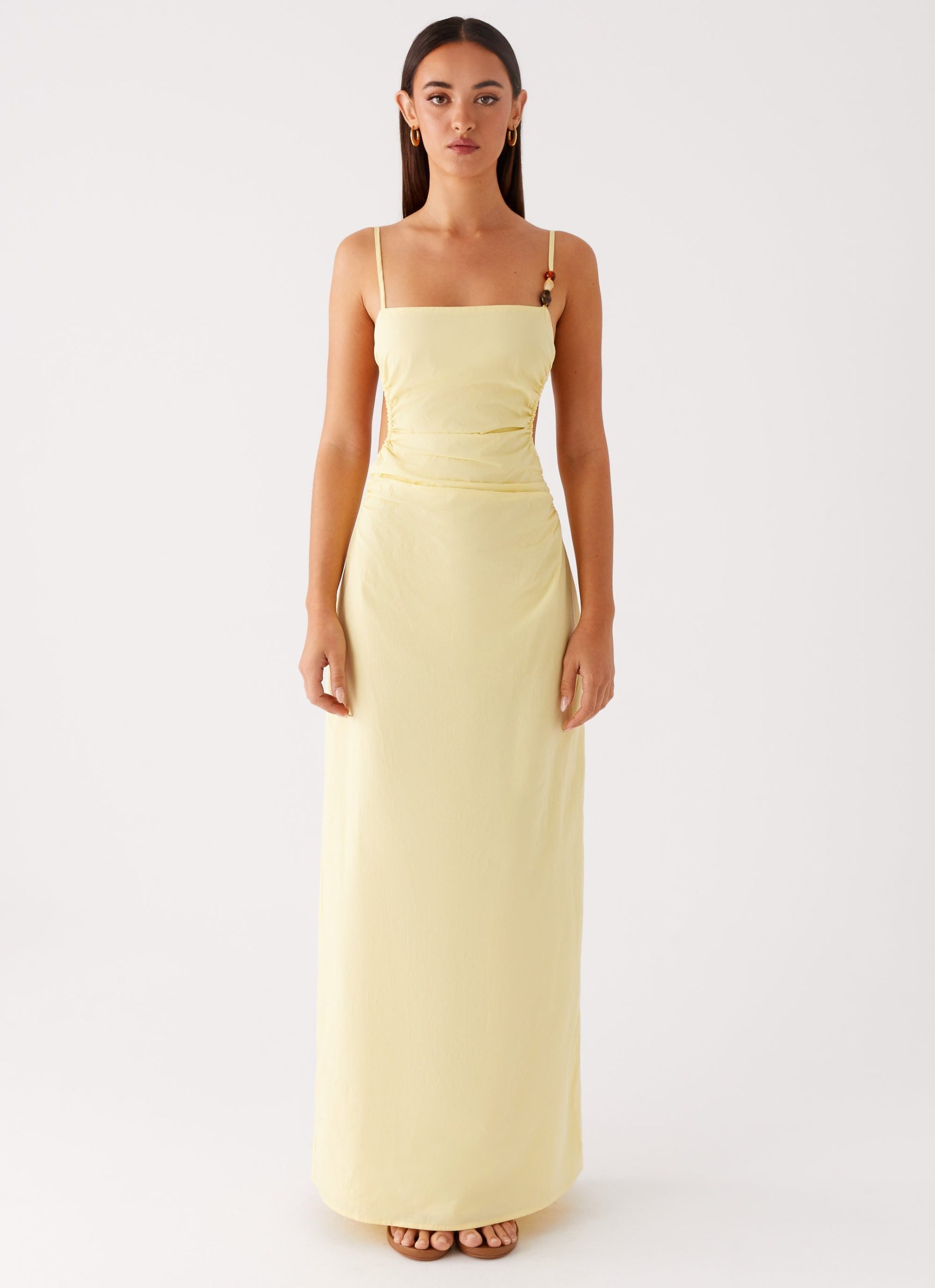 The Selah Maxi Dress shines with a modern square neckline and elegant beaded straps. Side ruched cut-outs add just the right touch of edge. while the flowing maxi length keeps your look effortlessly radiant from dusk till dawn.