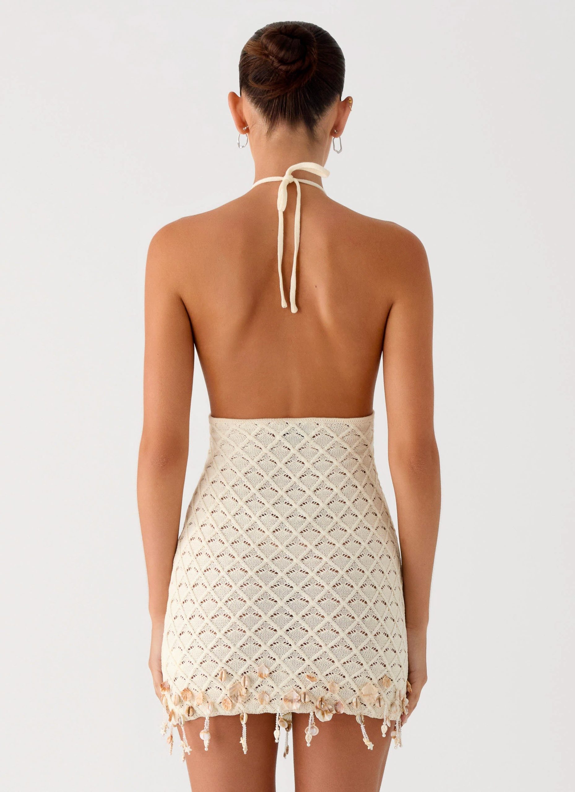 The Shaeson Beaded Mini Dress is a dreamy crochet moment. designed for summer nights and seaside escapes. Crafted from textured fabric. it features a halter neckline. low back. and shell tassel hemline for a playful finish. Complete with thin adjustable straps for the perfect fit.