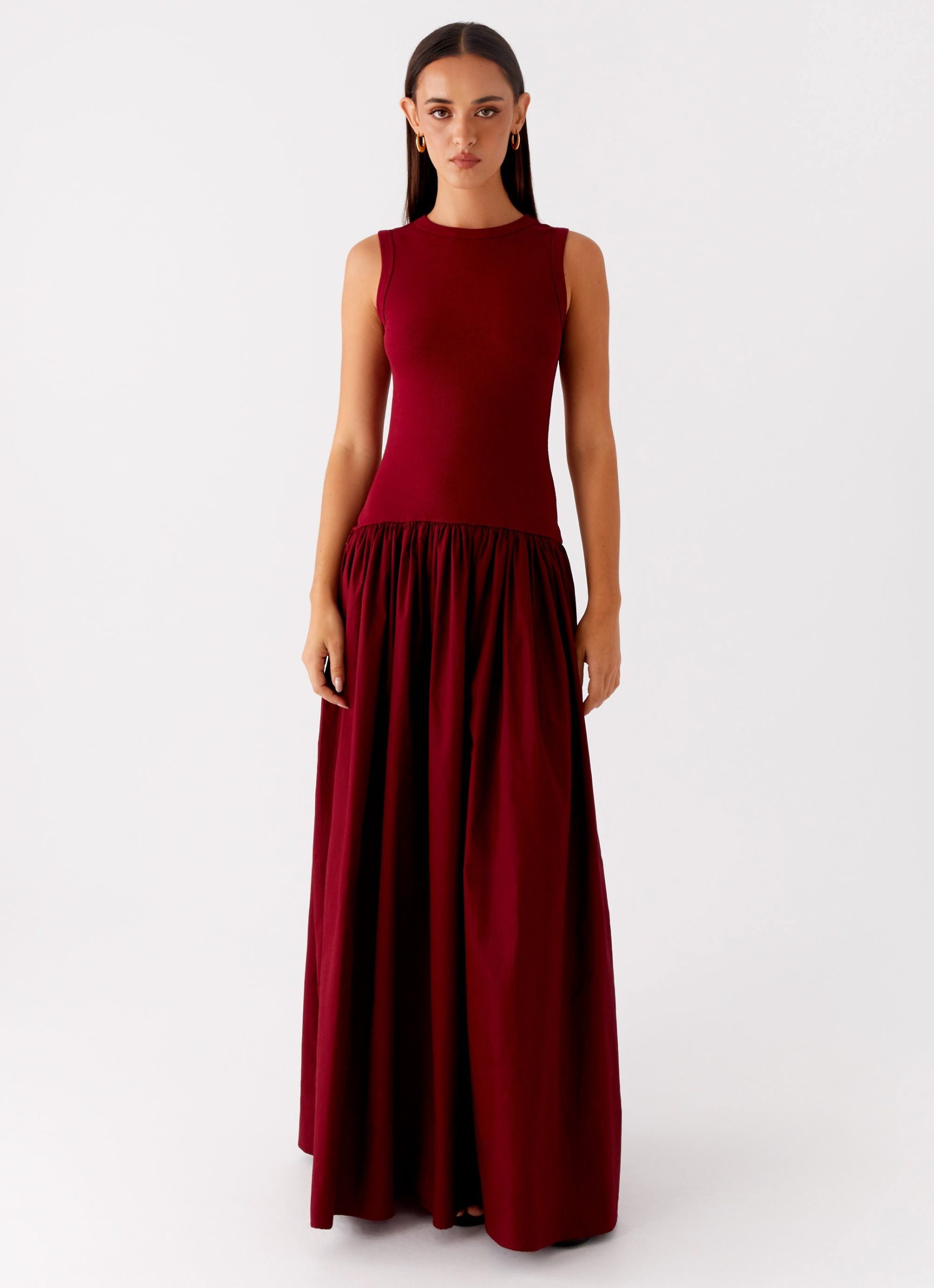The Shivani Maxi Dress is designed for effortless elegance after dark. Featuring a tank-style neckline. drop waist. and soft underlining. it flows with you from golden hour to the city lights in a rich maroon hue.