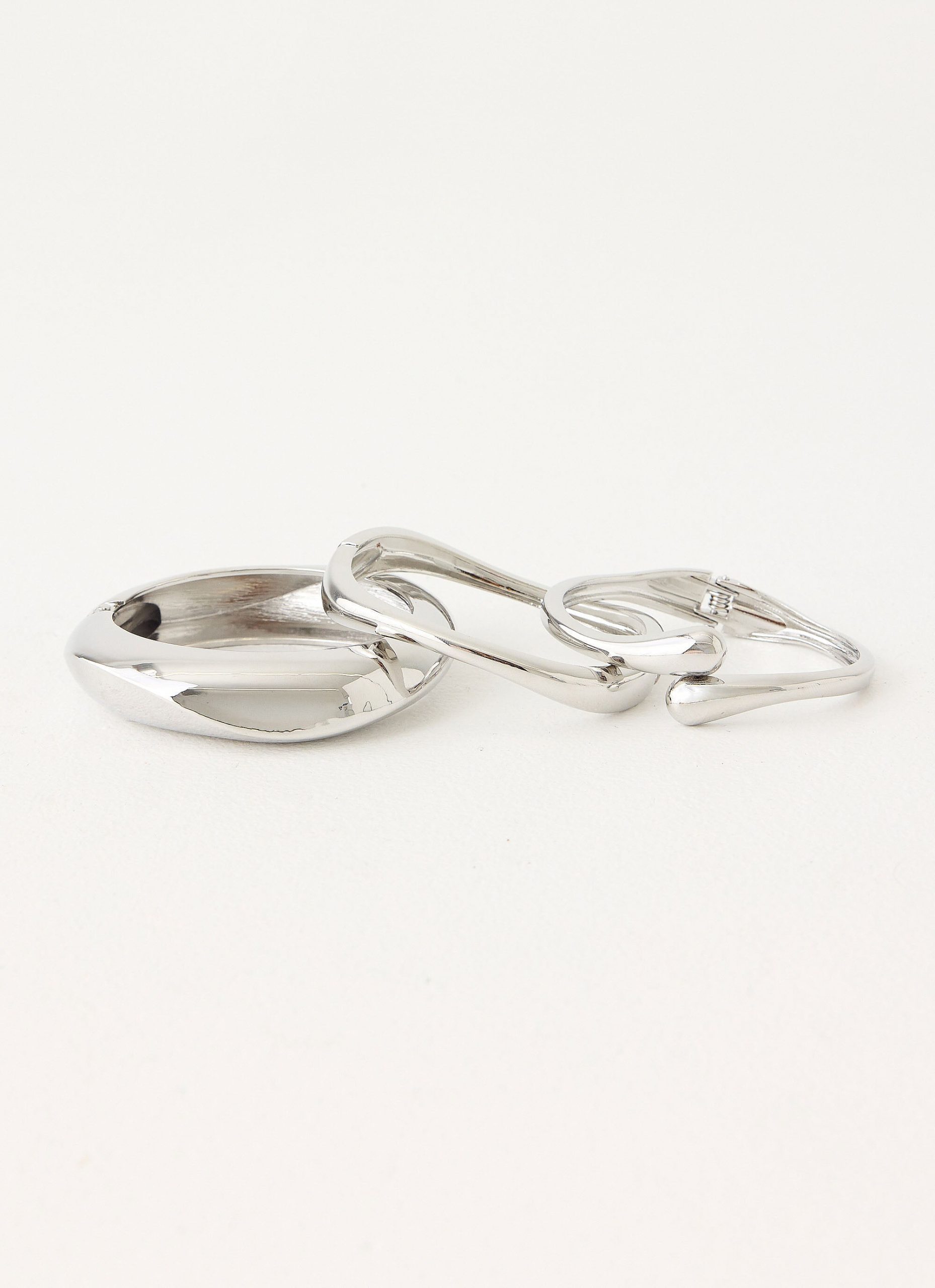 The Soft Focus Bracelets are made for golden hour layering with effortless shine. Featuring a set of three chunky bracelets in silver tone. they bring a bold yet elegant statement to any look. perfect for sun-soaked days or evening glow.