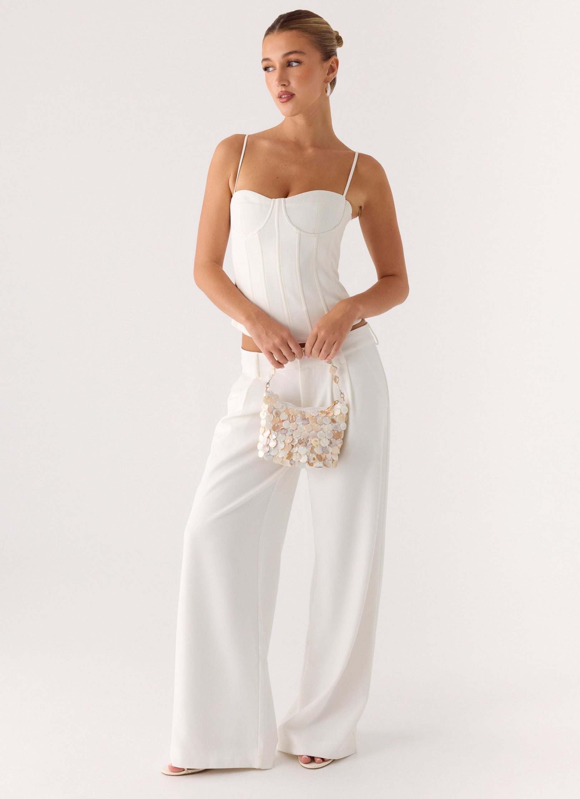 The Solara Shell Bag is made for sun-drenched days that turn into unforgettable nights. Designed with a soft slouch shape and shimmering beaded shell disc exterior. this statement piece brings effortless glamour to every look.