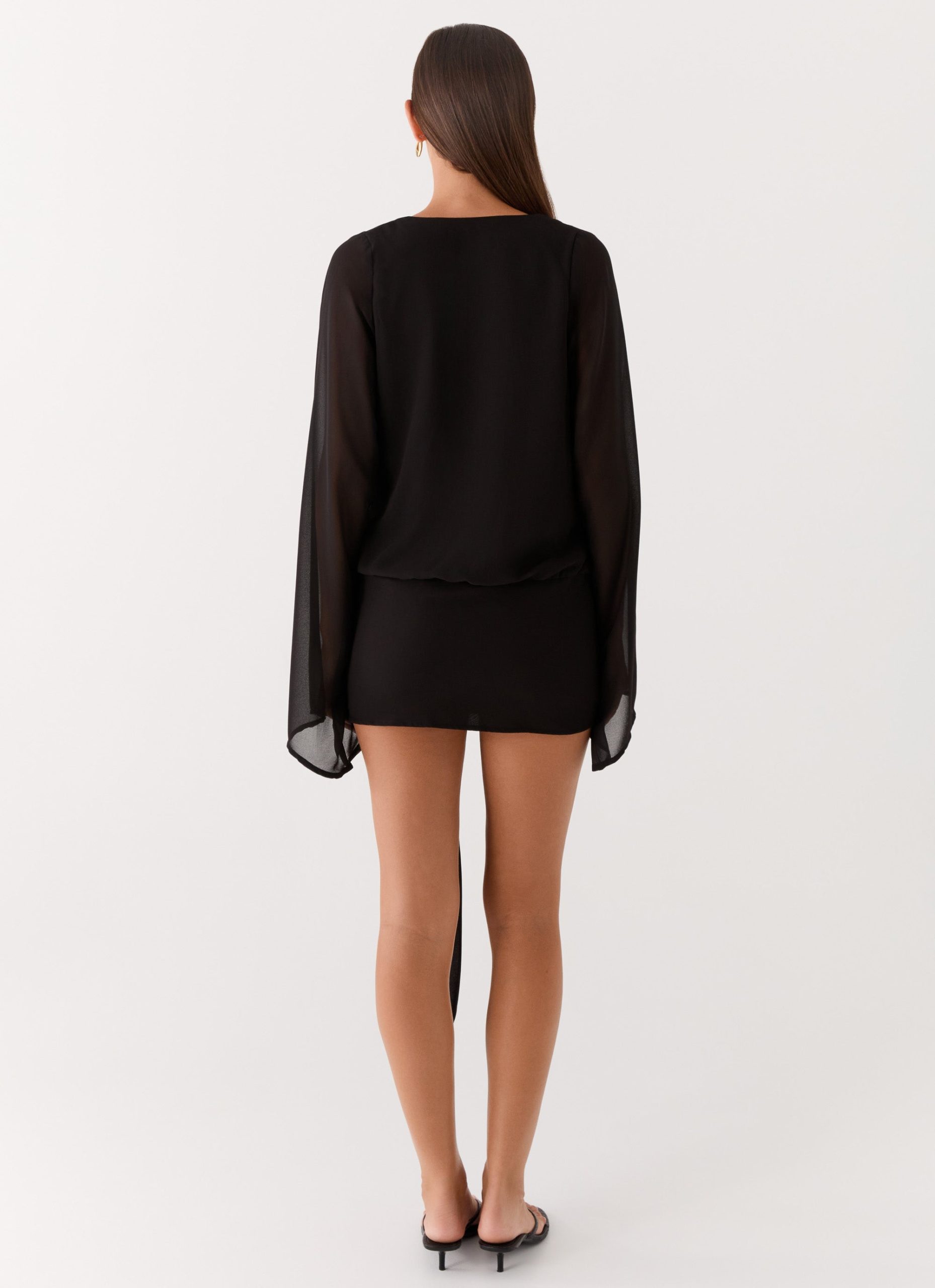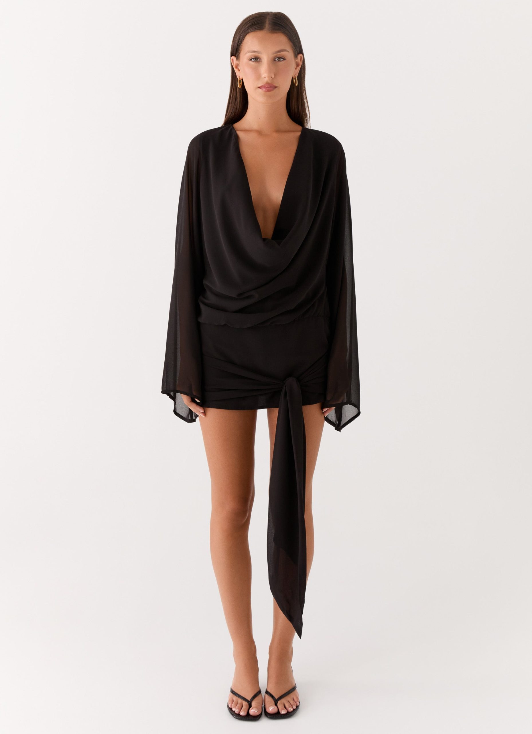 The Sorrel Long Sleeve Mini Dress is made for sunset-to-sundown moments and evening soirées that demand effortless elegance. Crafted from delicate chiffon. this silhouette features a sultry low front cowl and a flattering ruched waistband that flows into a playful front tie sash. With sheer chiffon sleeves and unique asymmetrical cuffs. this flowy. loose-fit mini is the ultimate choice for golden hour allure and moonlit moves.