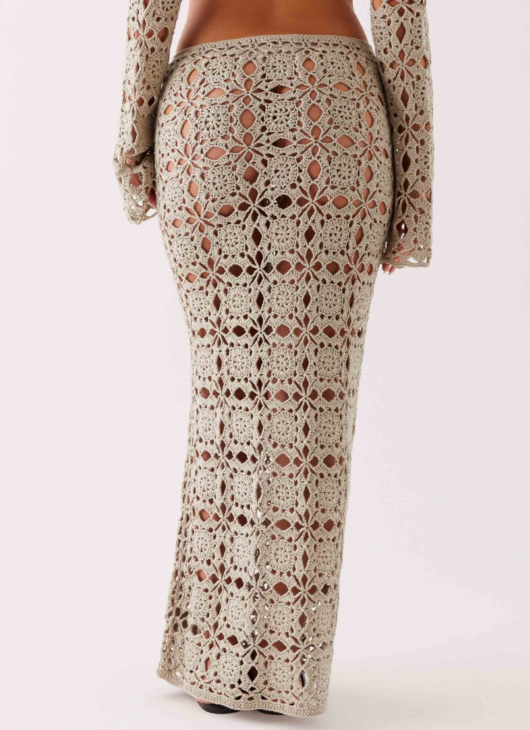 The Sorrentino Crochet Maxi Skirt features a low-rise fit and is made from semi-sheer crochet material for a light. breezy look. This unlined skirt drapes elegantly to the floor. adding a touch of effortless style to your outfit.