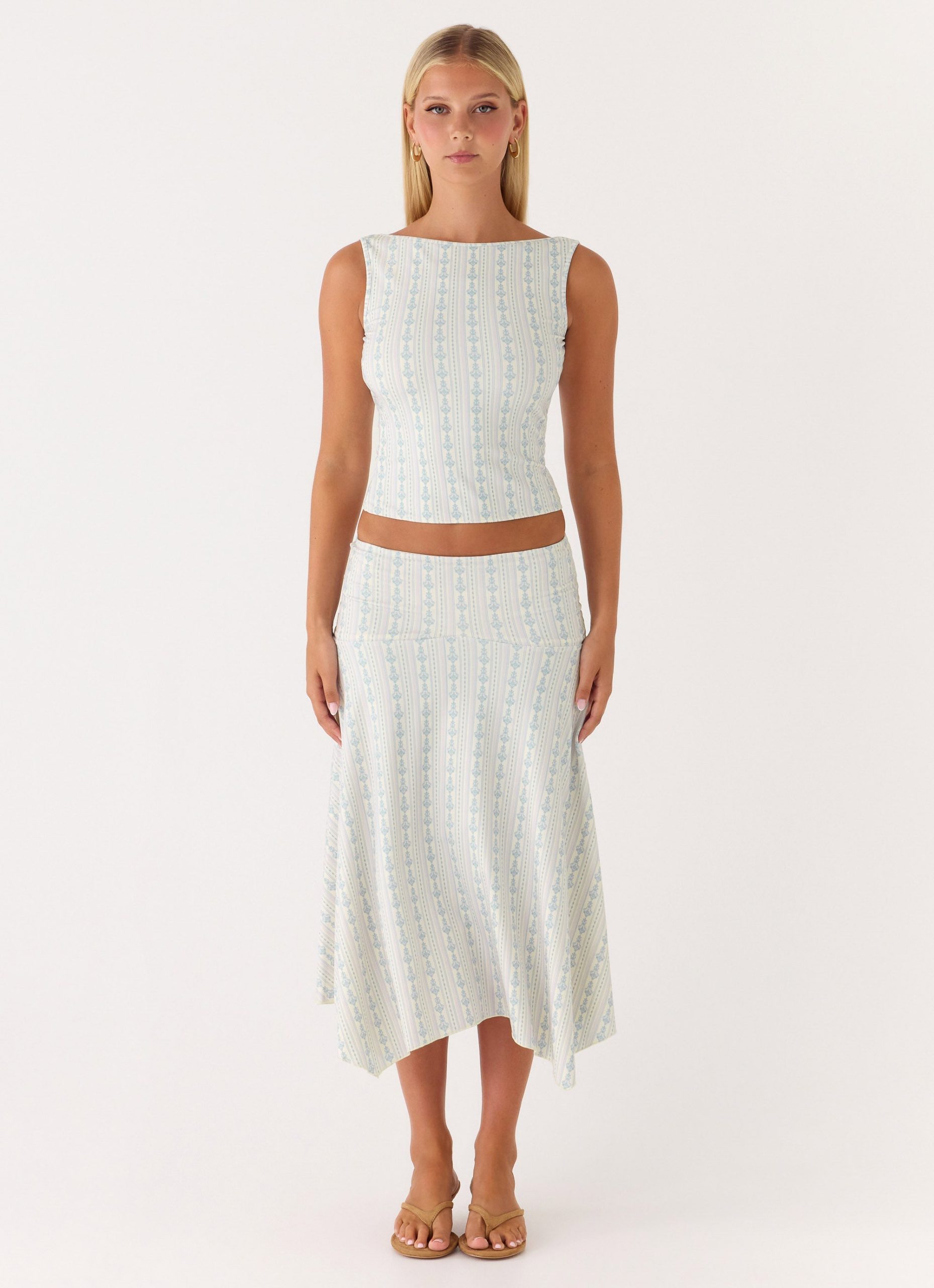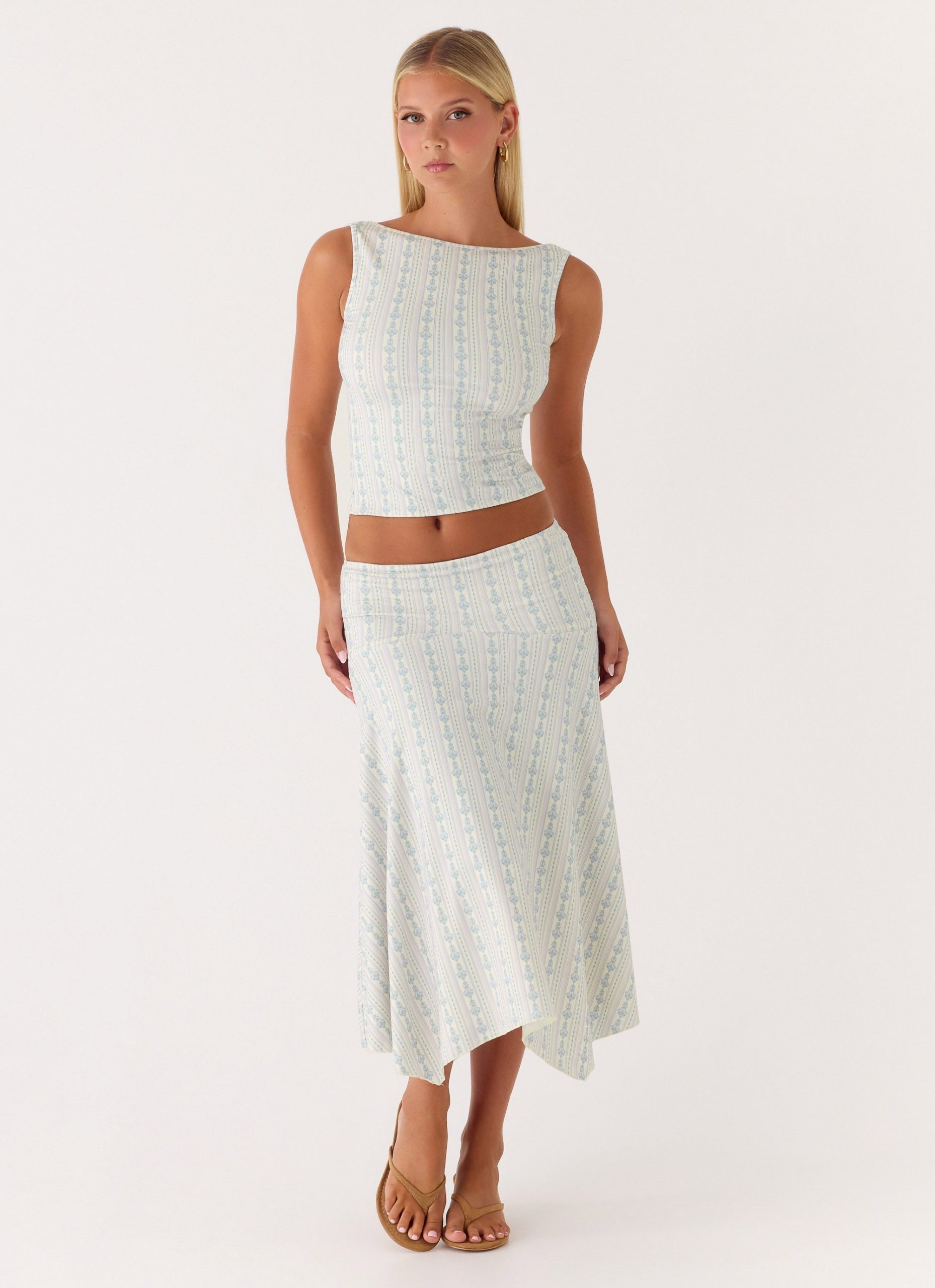 The Suns Out Tank Top is made for sun-soaked days that drift effortlessly into golden evenings. Featuring a boat neckline and a relaxed fit. this printed jersey silhouette is fully lined for comfort and a polished. editorial finish.