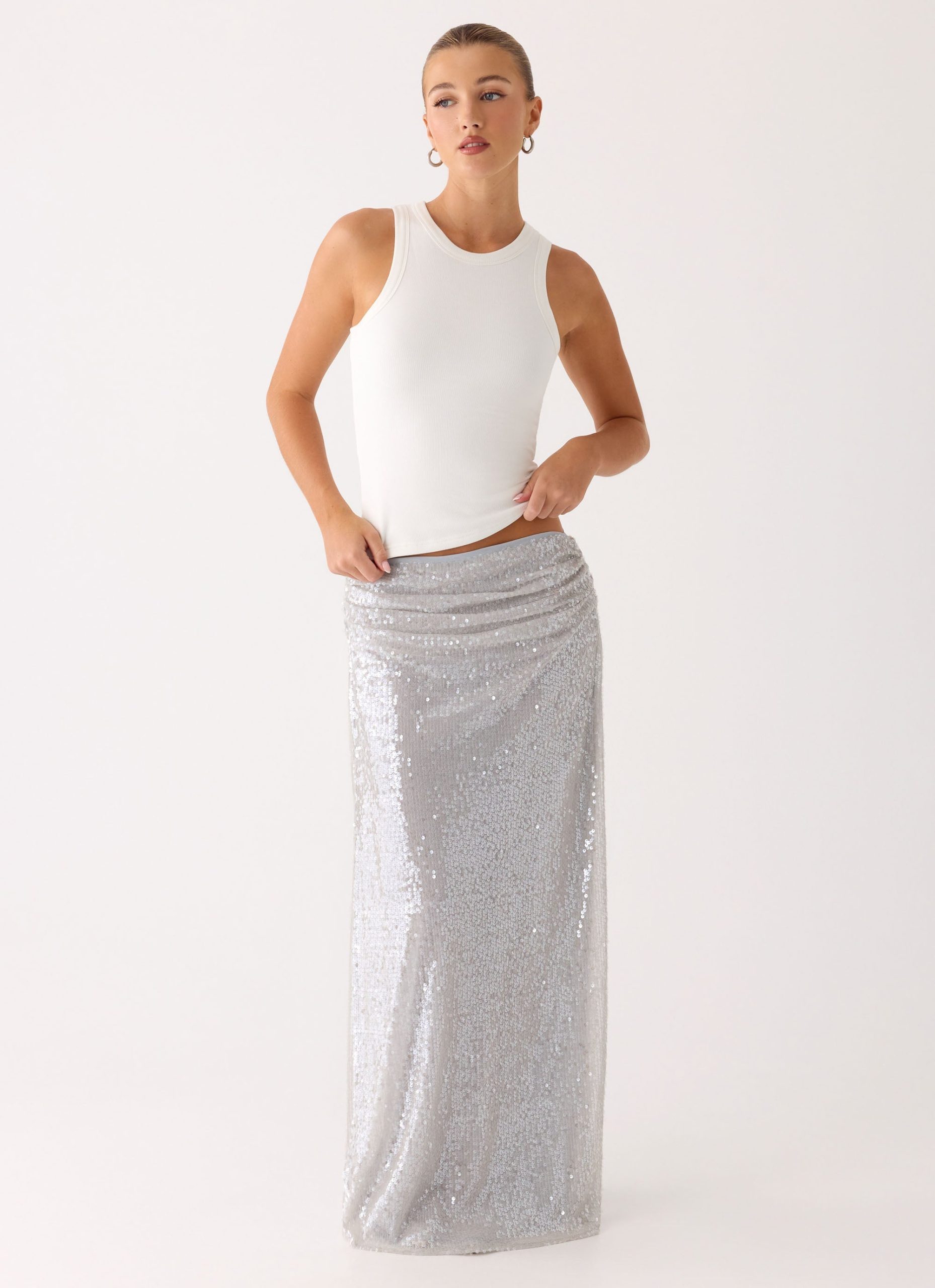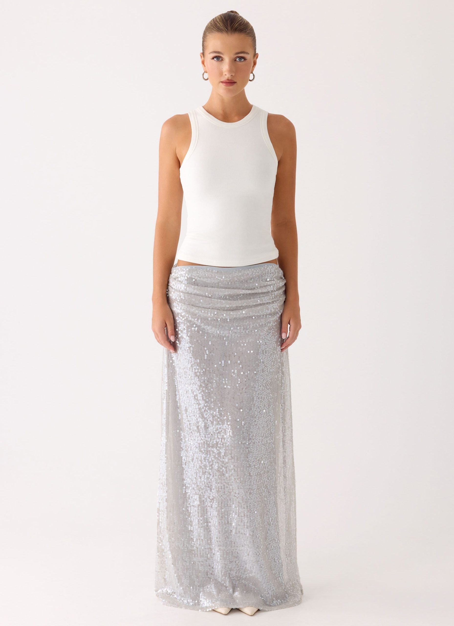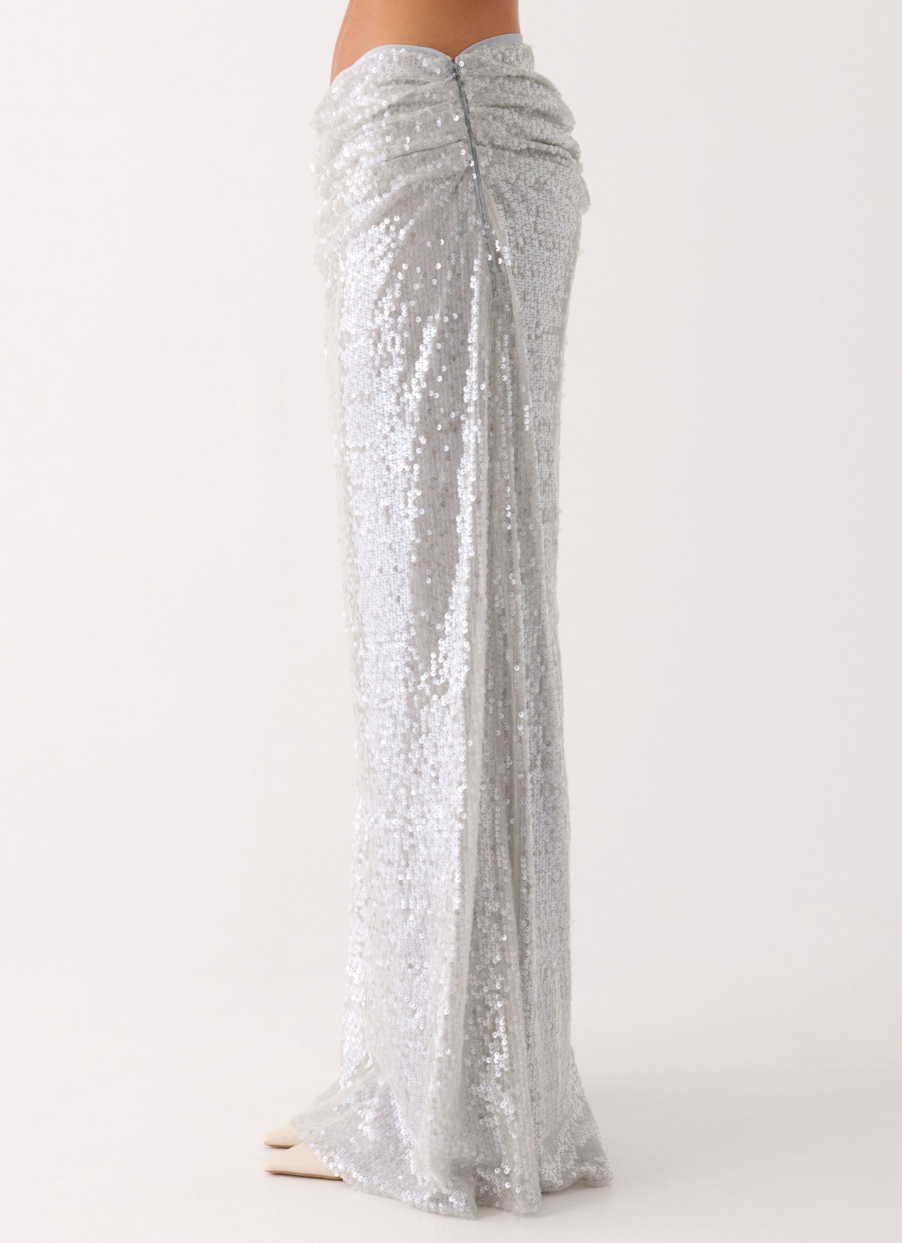 The Susie Sequin Maxi Skirt is a show-stopping piece designed for elegance and movement. Featuring a low-rise silhouette with a front draped detail. it is fully lined for comfort and finished with a side invisible zipper and hook-and-eye closure for a seamless fit. Perfect for special occasions or evening events.