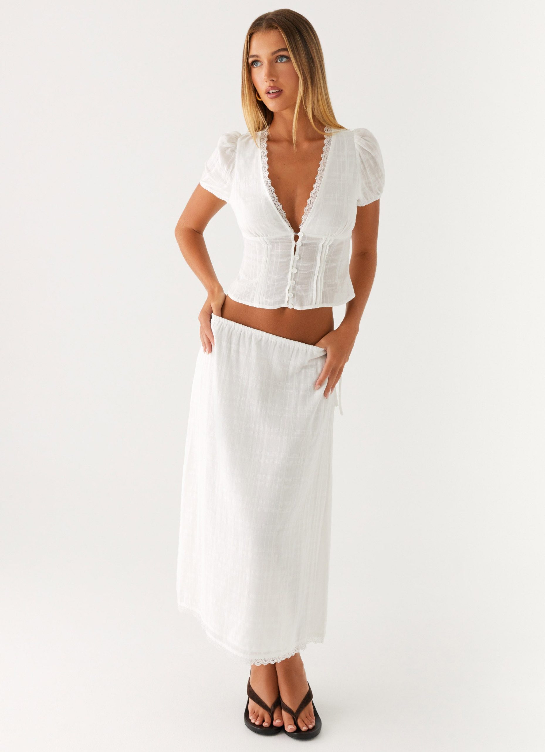 The Sweet Lullaby Midi Skirt is effortlessly feminine. Featuring a low-rise fit. side tie. and ruched waistband. it’s designed for soft structure and flowing movement.